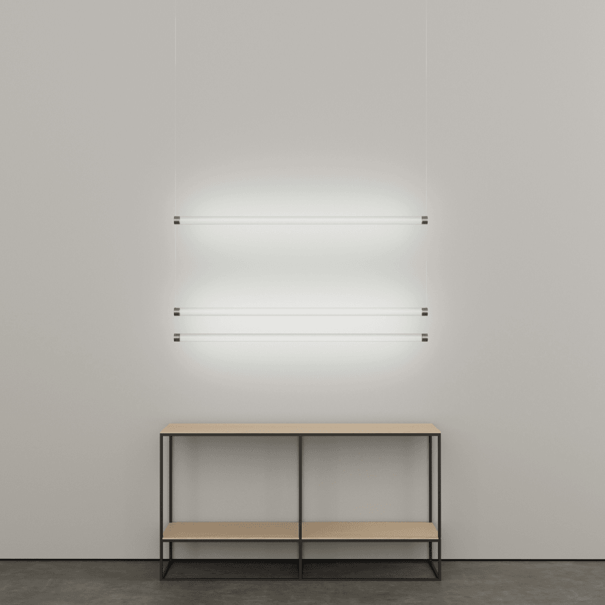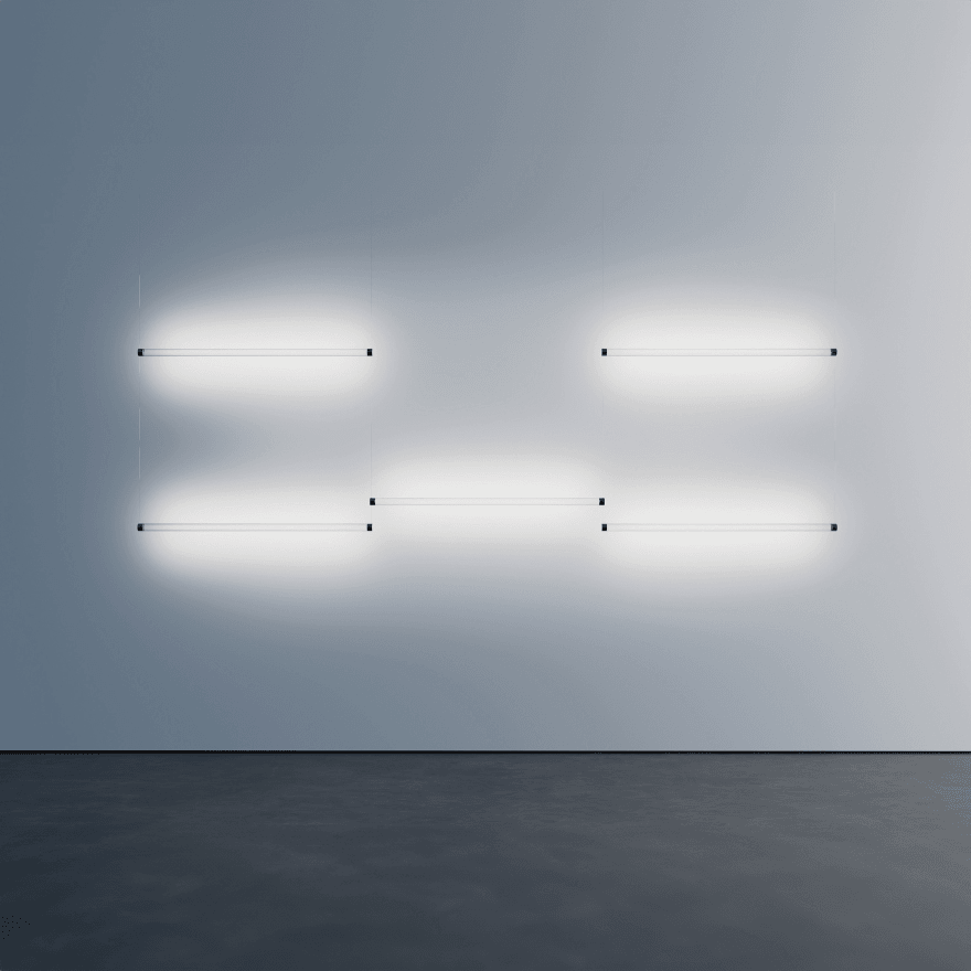 Светильник выполненный в виде модульной системы, позволяет адаптироваться к разным высотам потолков, обеспечивая оптимальное распределение освещения. Конструкция основана на комбинации матовых металлических элементов. У них отделка в стиле полированного чёрного хрома и стекла, создающих ощущение лёгкости и воздушности конструкции. Внутренняя выпуклая линза позволяет рассеивать свет таким образом, что источник кажется почти невидимым. Это вызывает ассоциацию с волшебством.