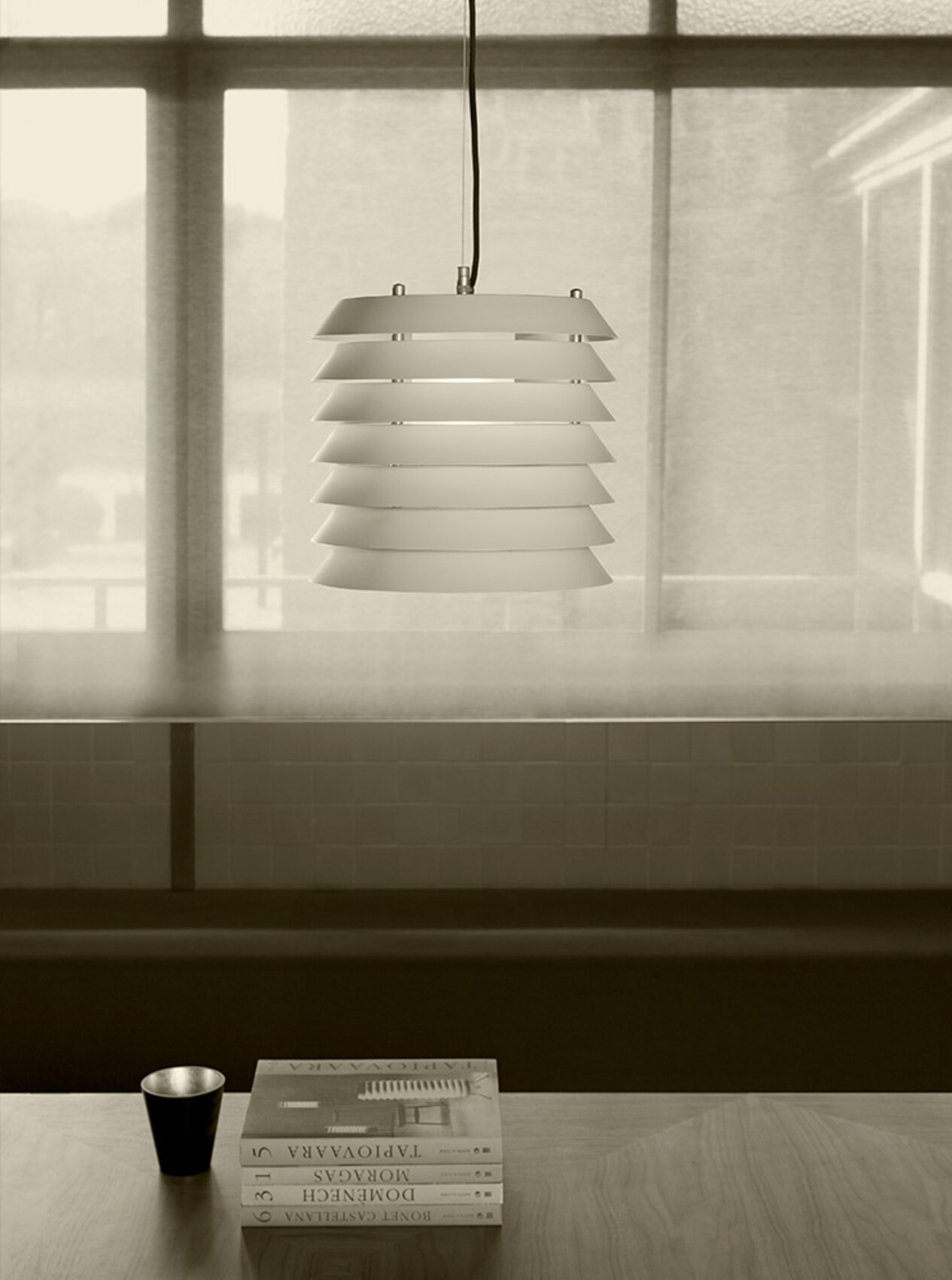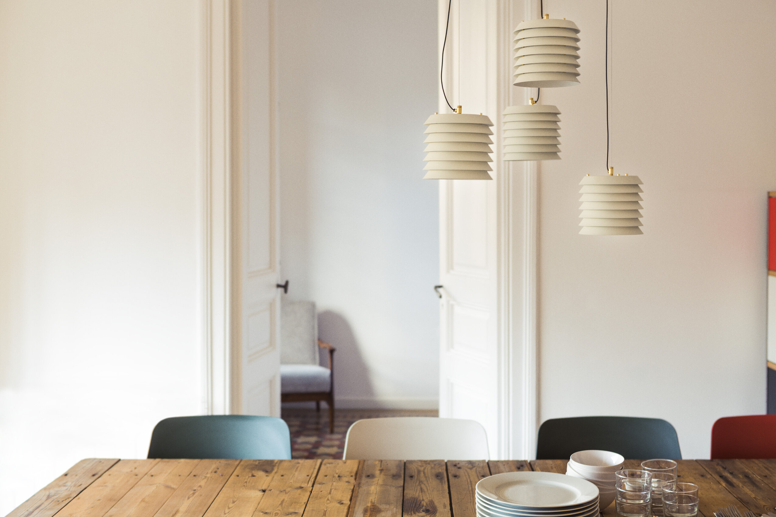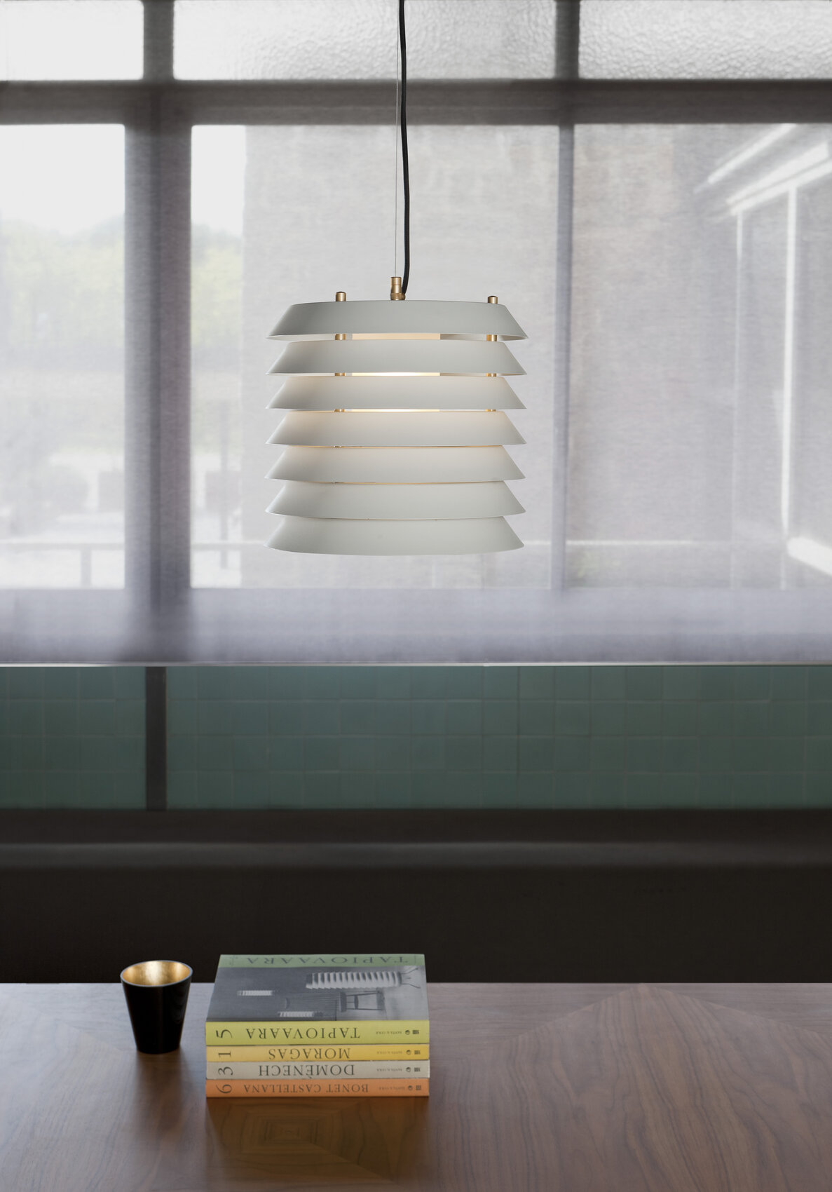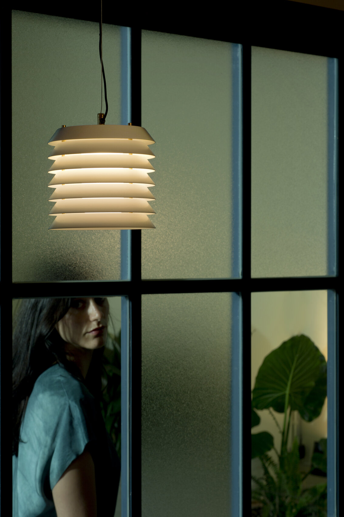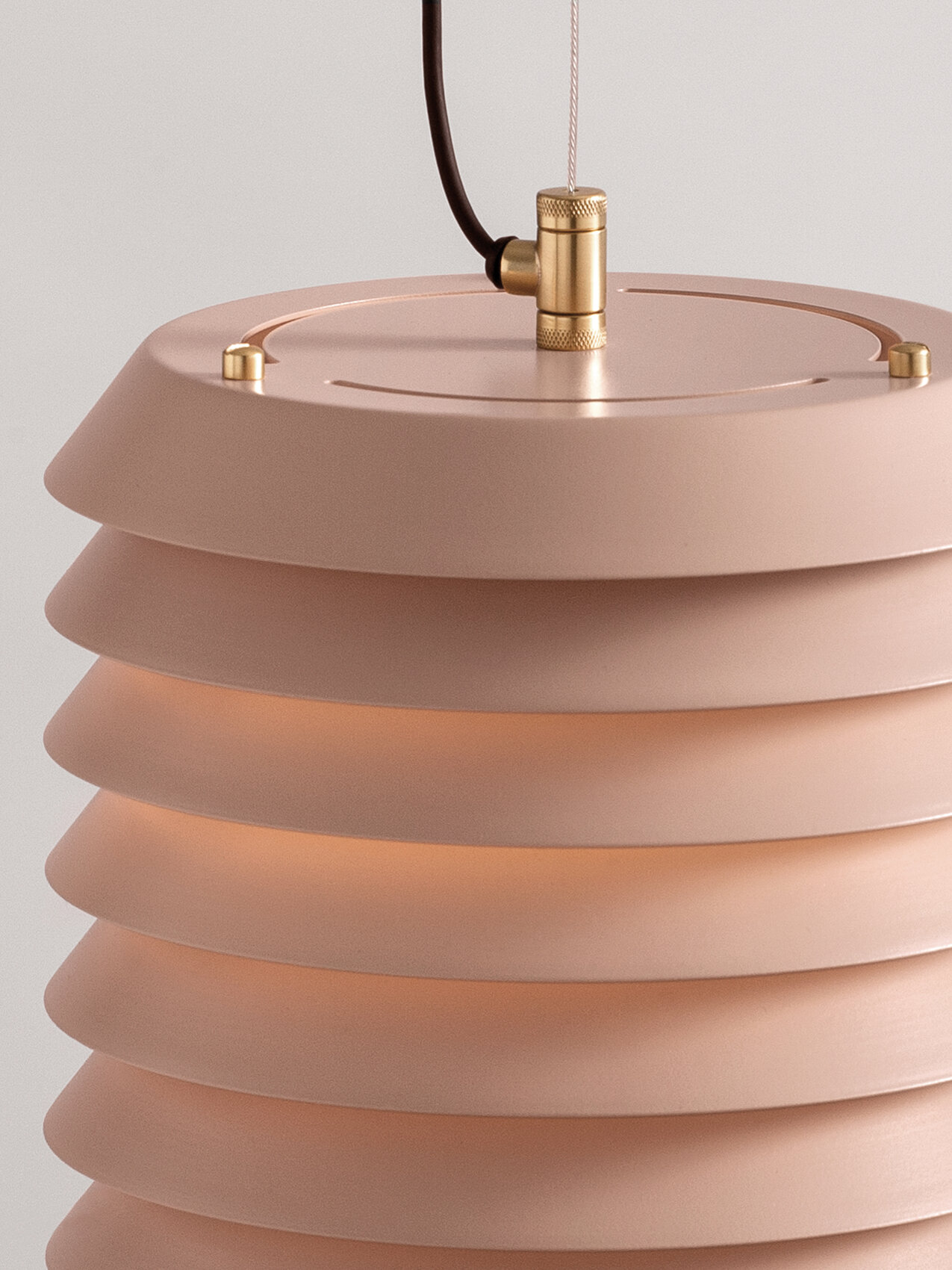 Подвесной светильник Maija pendant словно переносит нас в атмосферу балтийских городов, где тёплый свет из домов мягко пробивается наружу, наполняя улицы уютным сиянием. Его необычная форма напоминает башню из аккуратно сложенных металлических дисков, сквозь которые пробивается свет, создавая эффект живых сверкающих сот.
