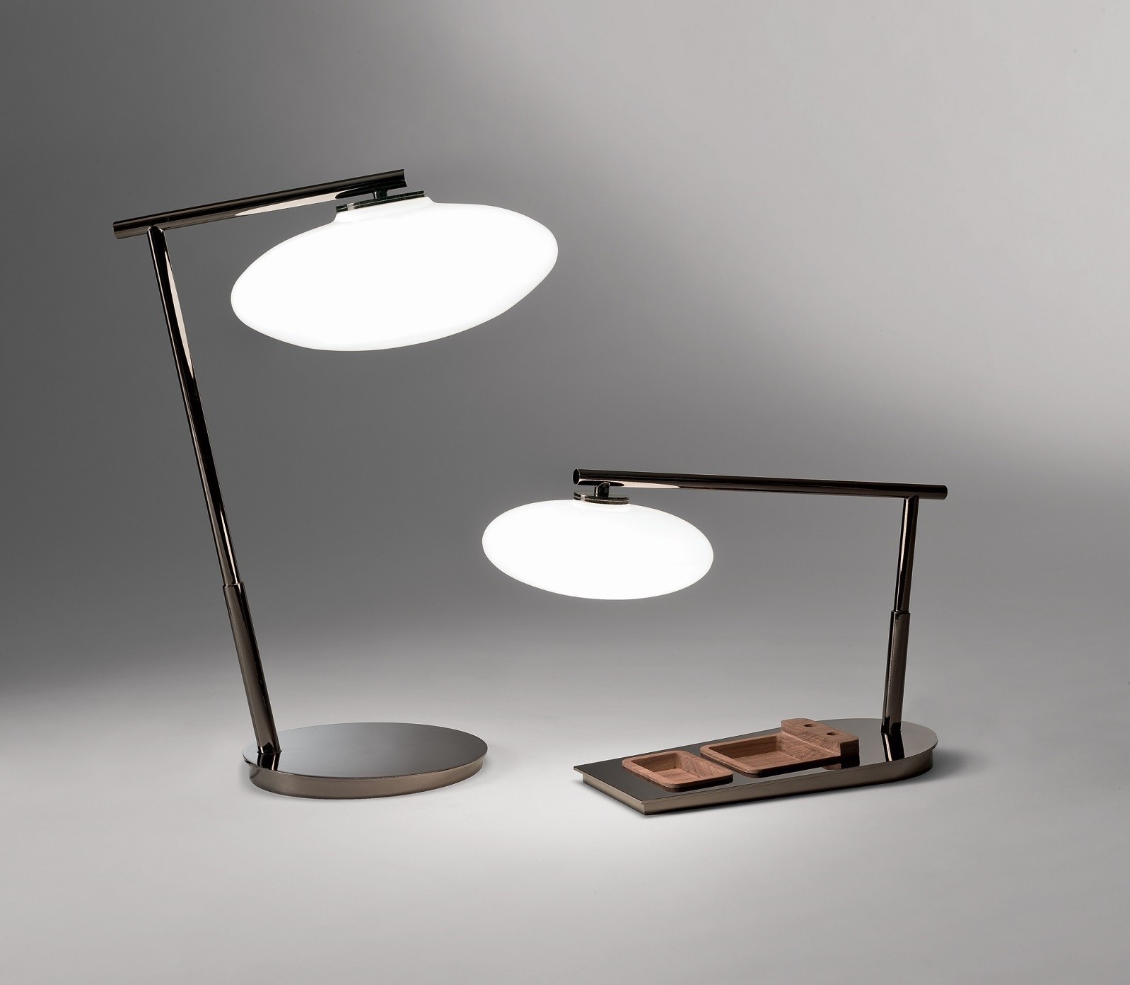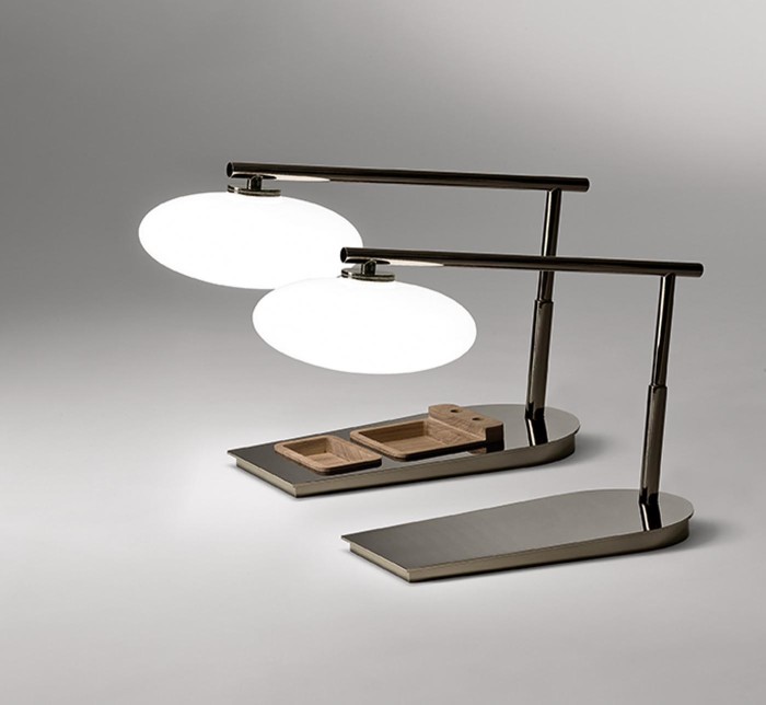 Небольшая настольная лампа Mami украсит любой современный интерьер. Каркас у светильника металлический: бронза или глянцевый черный никель. Плафон лампы выполнен из выдувного стекла и предлагается в следующих цветах: прозрачное янтарное стекло, белое стекло, прозрачное дымчатое стекло. В основании модели можно расположить небольшие контейнеры, в которых будет удобно хранить небольшие канцелярские принадлежности.