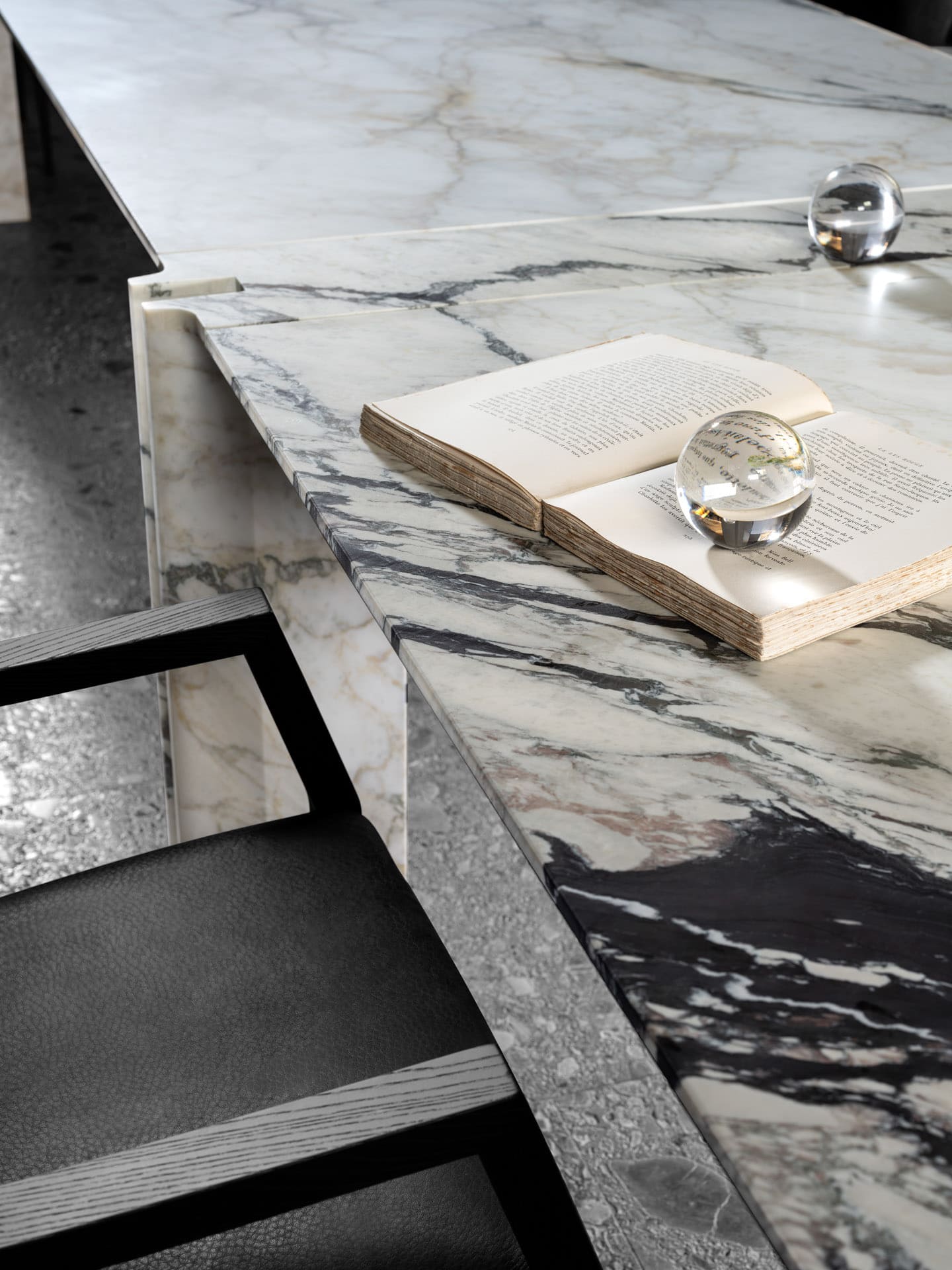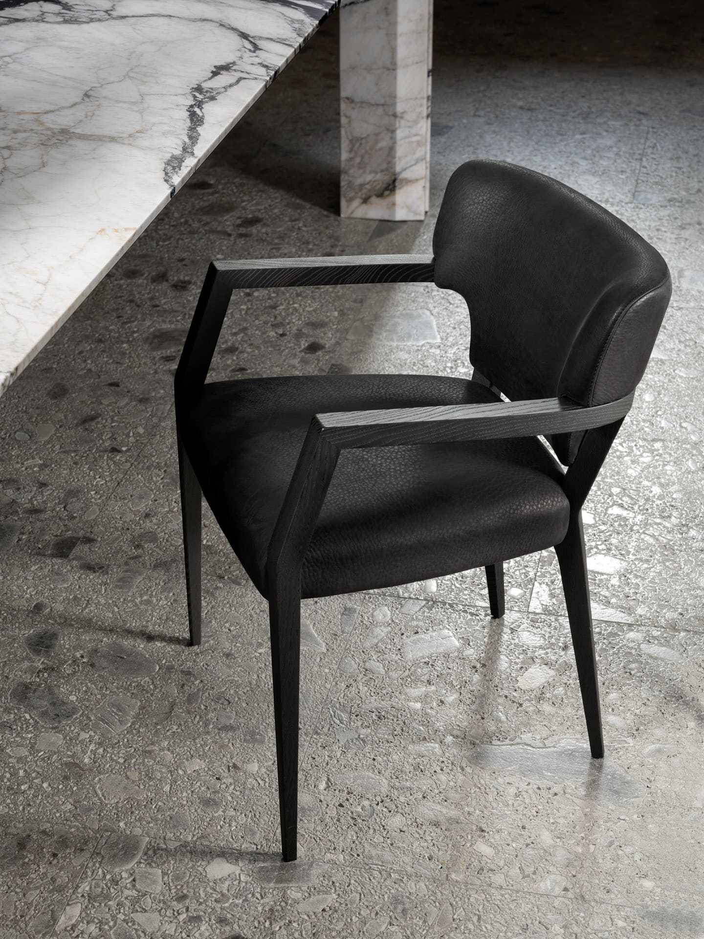 Стул Mantis отличается удлинёнными и заострёнными ножками, выполненными из чёрного лакированного дерева. Этот элемент дизайна придаёт стулу особый шарм и делает его выразительным. Сегментированные подлокотники также привлекают внимание и оживляют образ стула. Они подчёркивают характерную и внушительную материальность смелого силуэта, который находится в равновесии между формальной строгостью и комфортом.