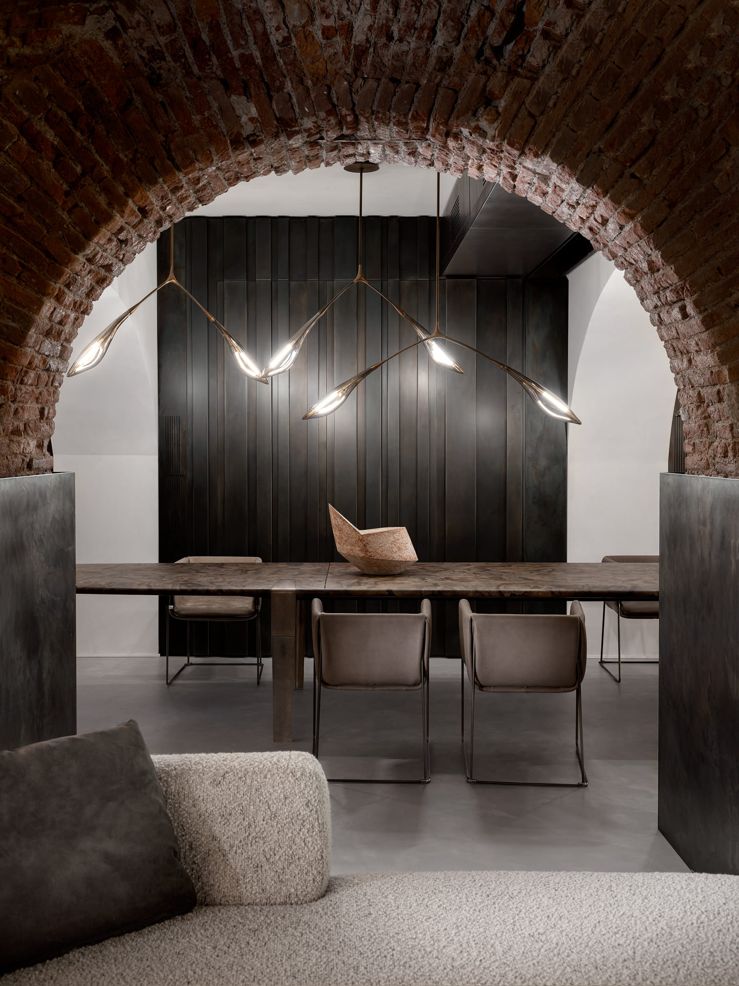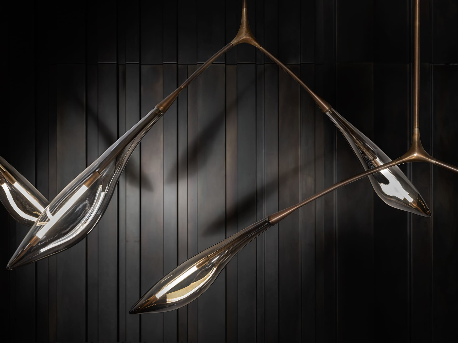 Центральным элементом светильника является Y-образный корпус. Он выполнен из литой бронзы или латуни. Этот элемент не только выполняет функциональную роль. Он также является художественным акцентом. Акцент привлекает внимание и подчёркивает уникальность светильника. Корпус может быть покрыт глянцевым или матовым стеклом. Это позволяет выбрать вариант в зависимости от общего стиля интерьера.