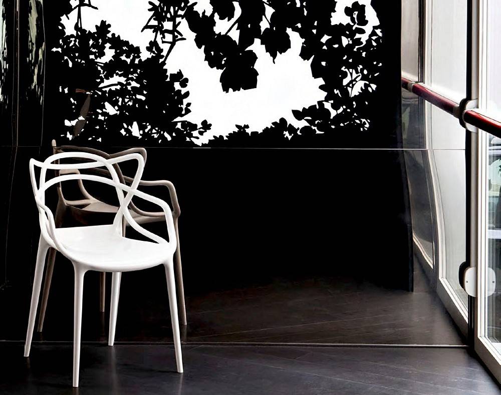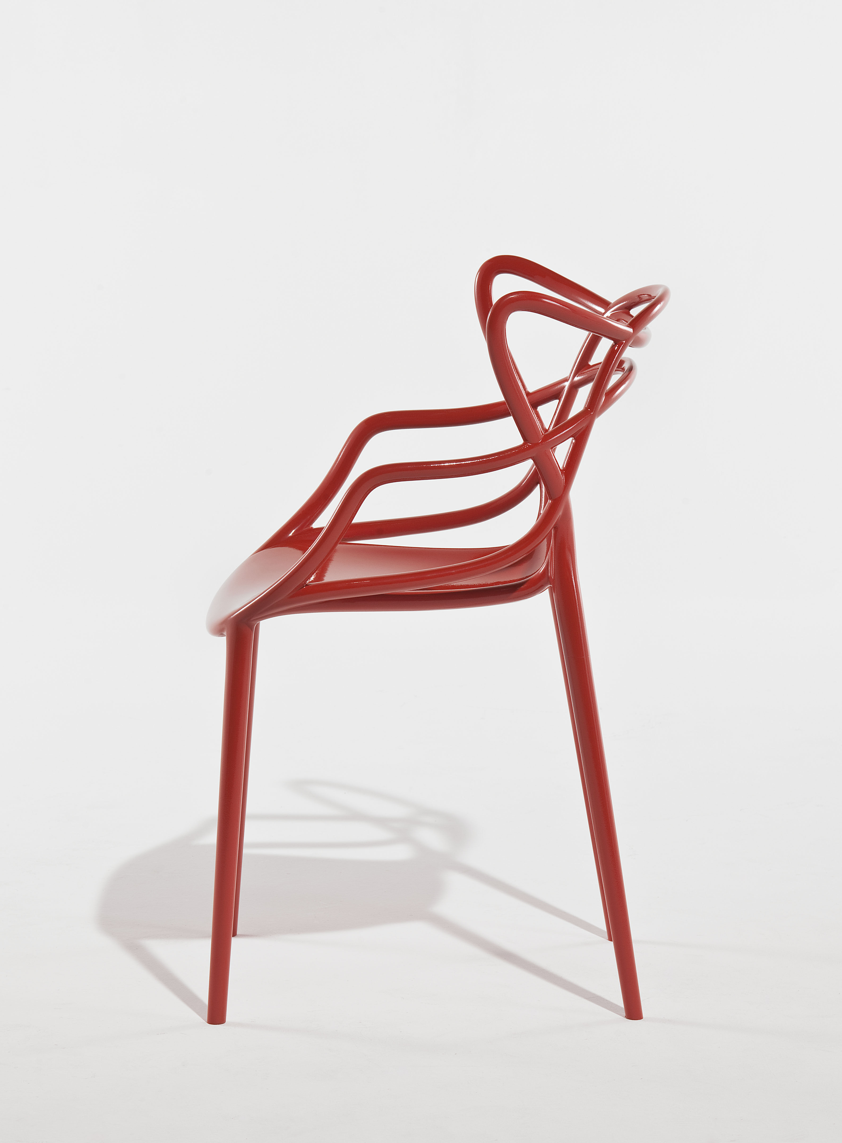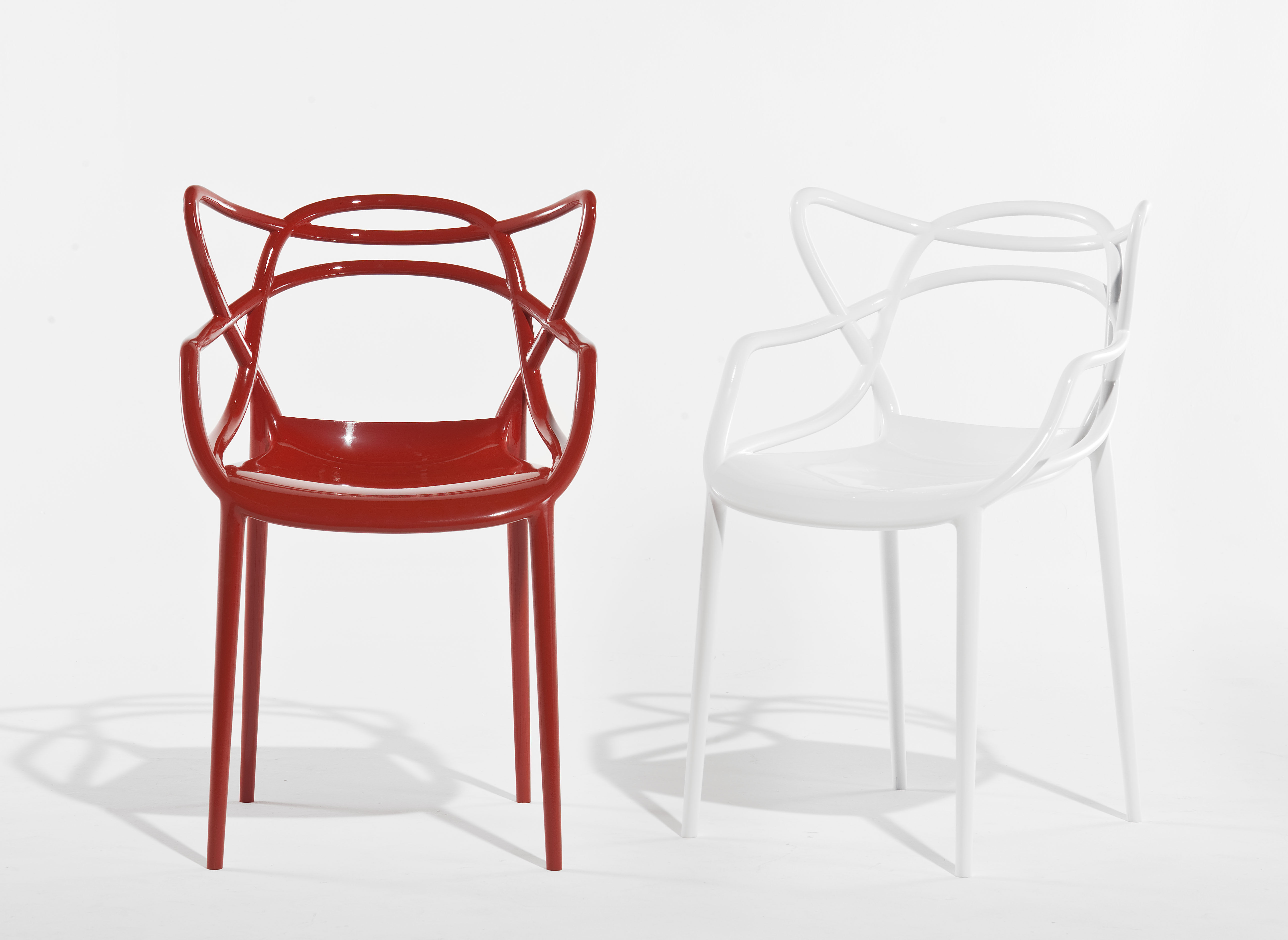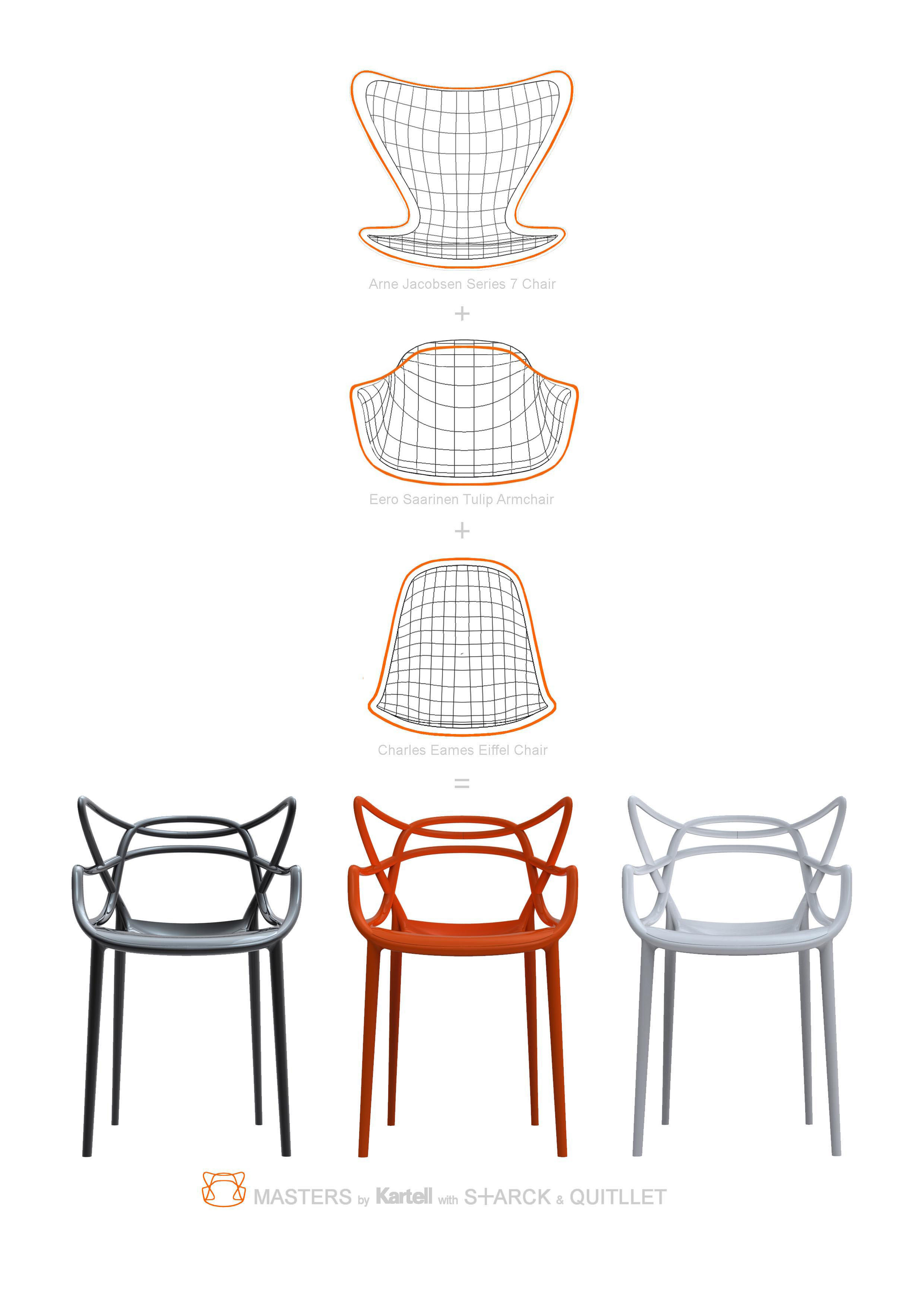 Яркая модель стула Masters - это союз двух дизайнеров Филиппа Старка с Евгением Куитлитом. Авторы создали стул-"цитату", где "зашифрованы" силуэты трех знаменитых моделей от прославленных дизайнеров ХХ века. Это стул "Series 7” от Арне Якобсена (Arne Jacobsen), кресло “Tulip” от Ээро Сааринена (Eero Saarinen) и стул “Eiffel” от Чарльза Имза (Charles Eames). Соединение трех дизайнерских шедевров позволяет создать "новый продукт, новый проект, отражение нашего изменившегося мира" – считает Филипп Старк. Высота сидения 46 см.