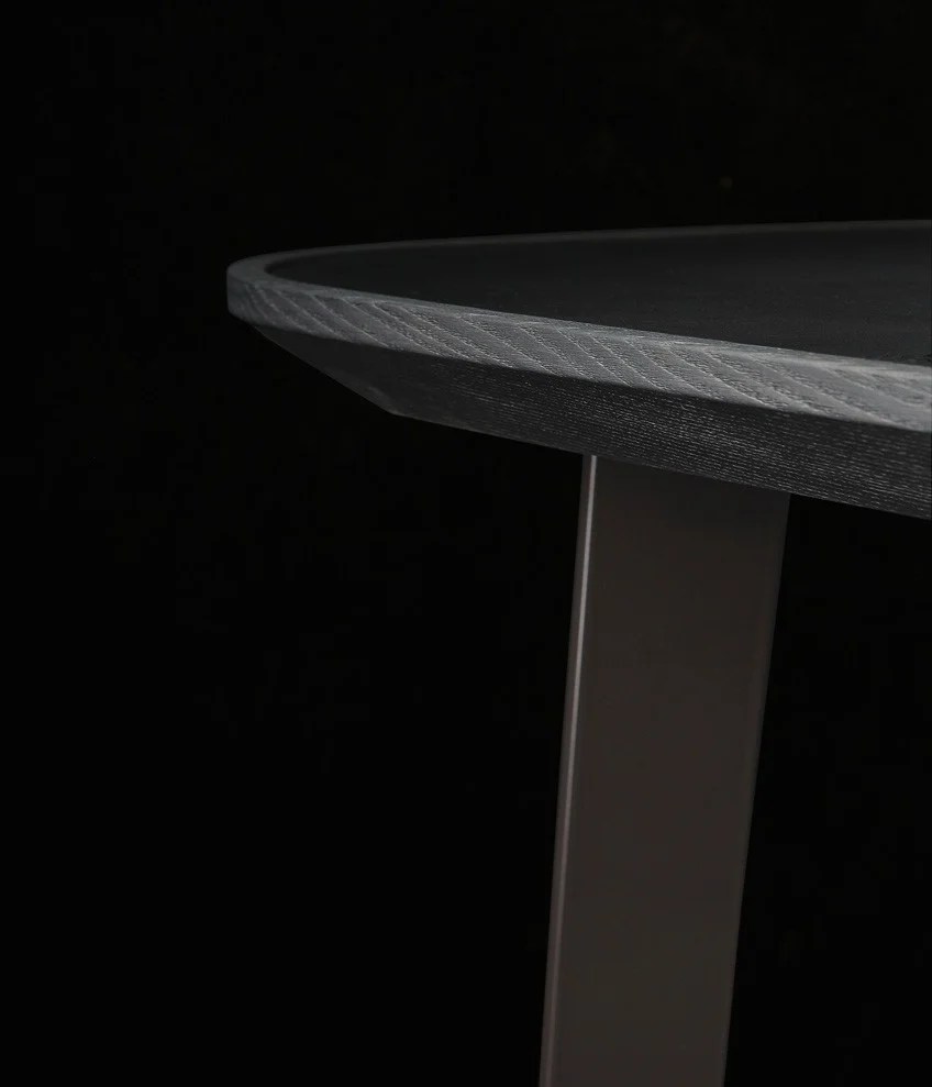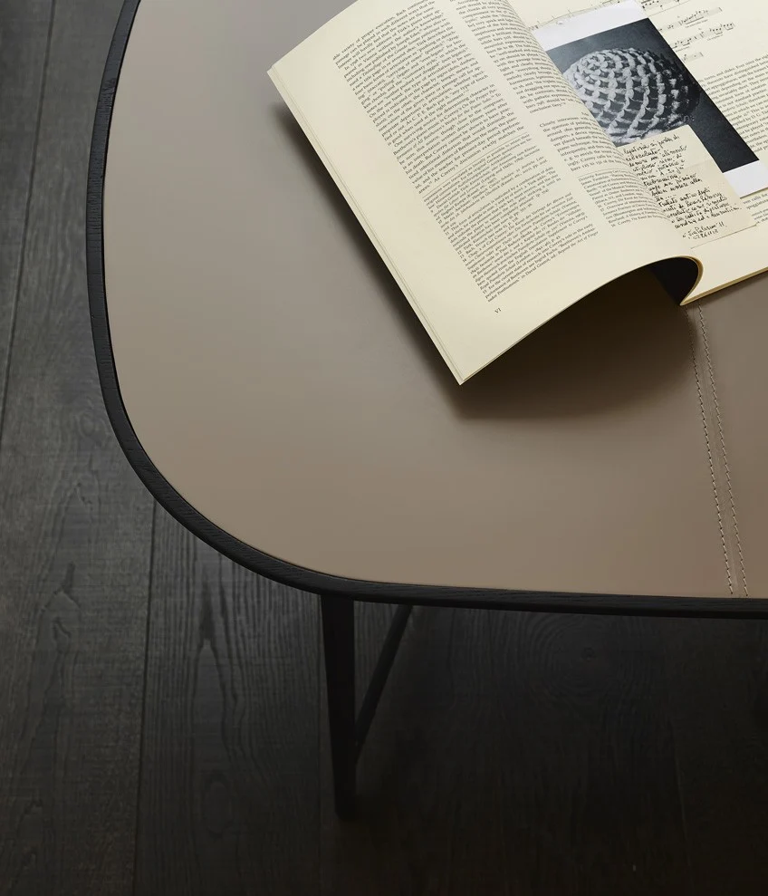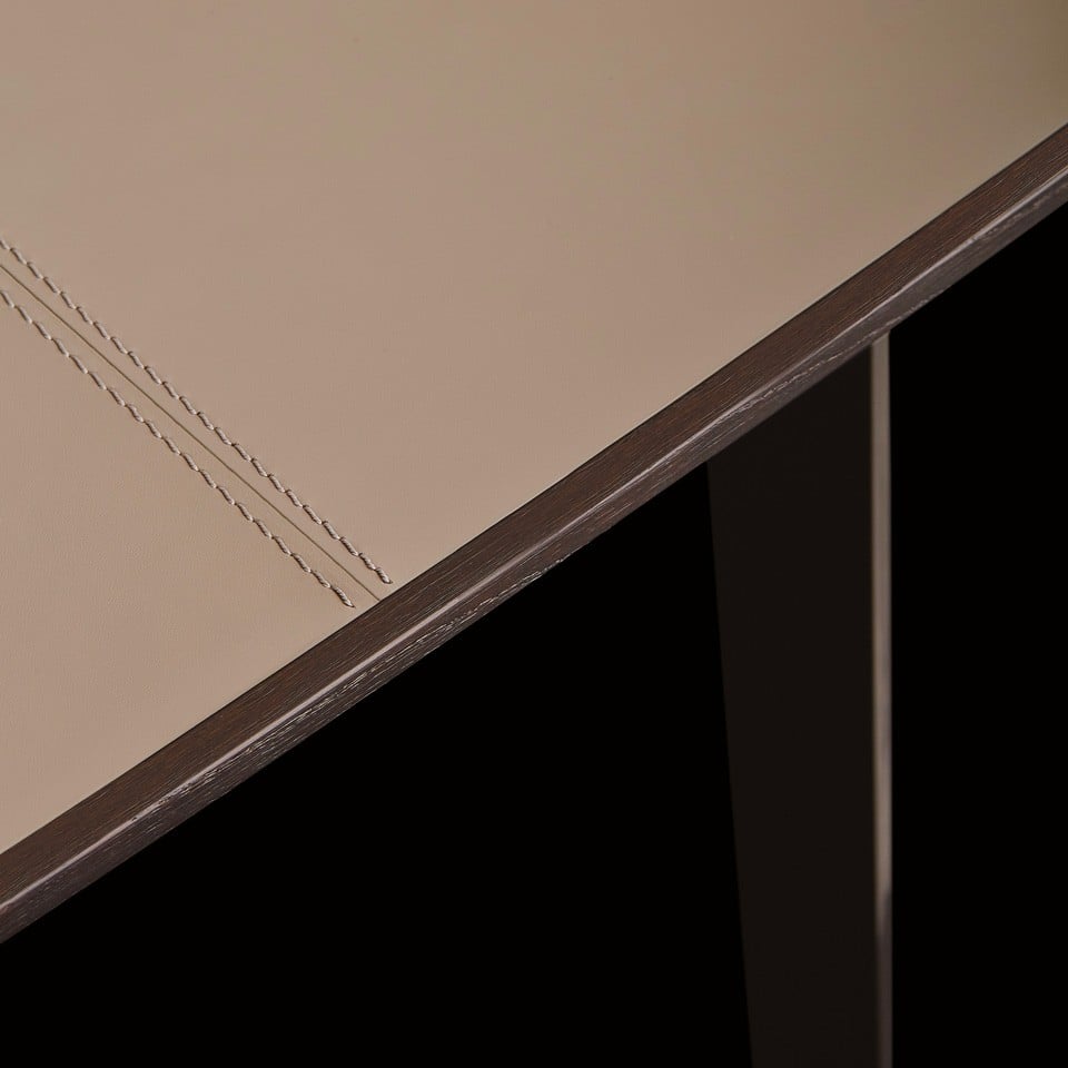 Тонкий силуэт и изящный профиль стола придают ему лёгкость и воздушность. Окрашенная металлическая конструкция, деревянная рама и кожаная вставка на столешнице создают гармоничный баланс между строгостью и элегантностью.