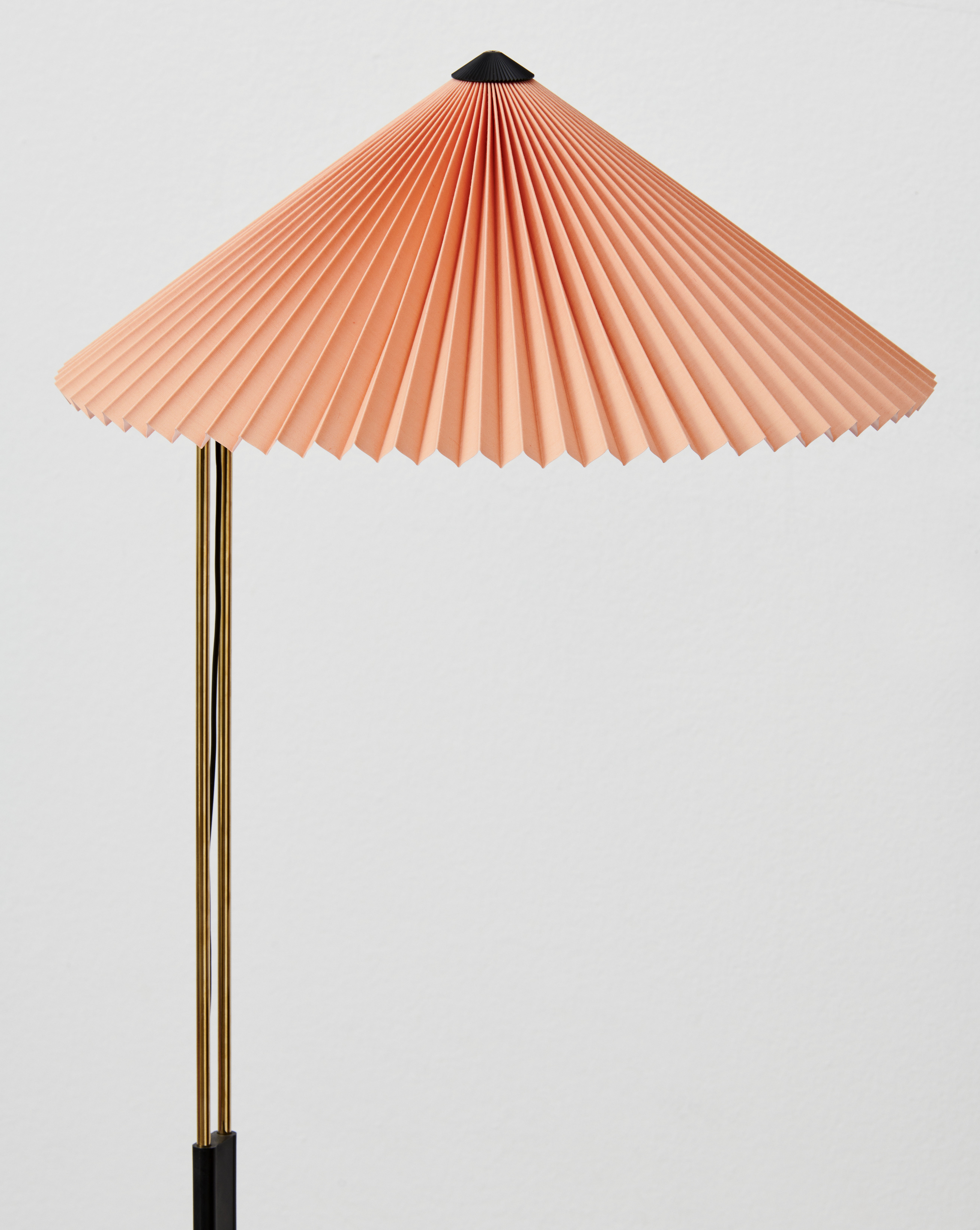 Основа торшера — тонкая рама из полированной латуни и стали. Металл блестит, но не бросается в глаза — его сдержанный блеск добавляет изделию элегантности. Матовая чёрная фурнитура создаёт приятный контраст и придаёт конструкции чёткость. В основании использованы прочные соединения из цинкового сплава — они не только надёжны, но и органично вписываются в общий дизайн.