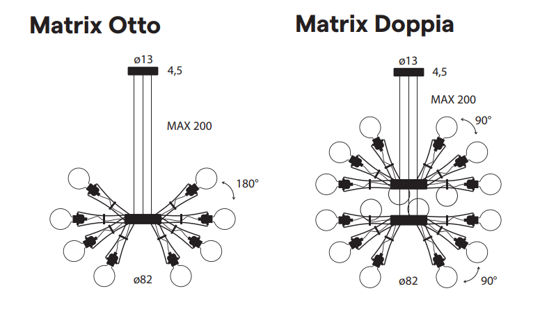 Ещё одной выдающейся моделью в линейке является Matrix Doppia, воплощающий идею постмодернистской универсальности. Его конструкция включает 16 подвижных кронштейнов, сгруппированных в две симметричные ветви по восемь элементов каждая. Такое решение позволяет создавать бесконечное множество конфигураций, от строгих геометрических форм до асимметричных композиций, подстраивая свет под любую задачу.