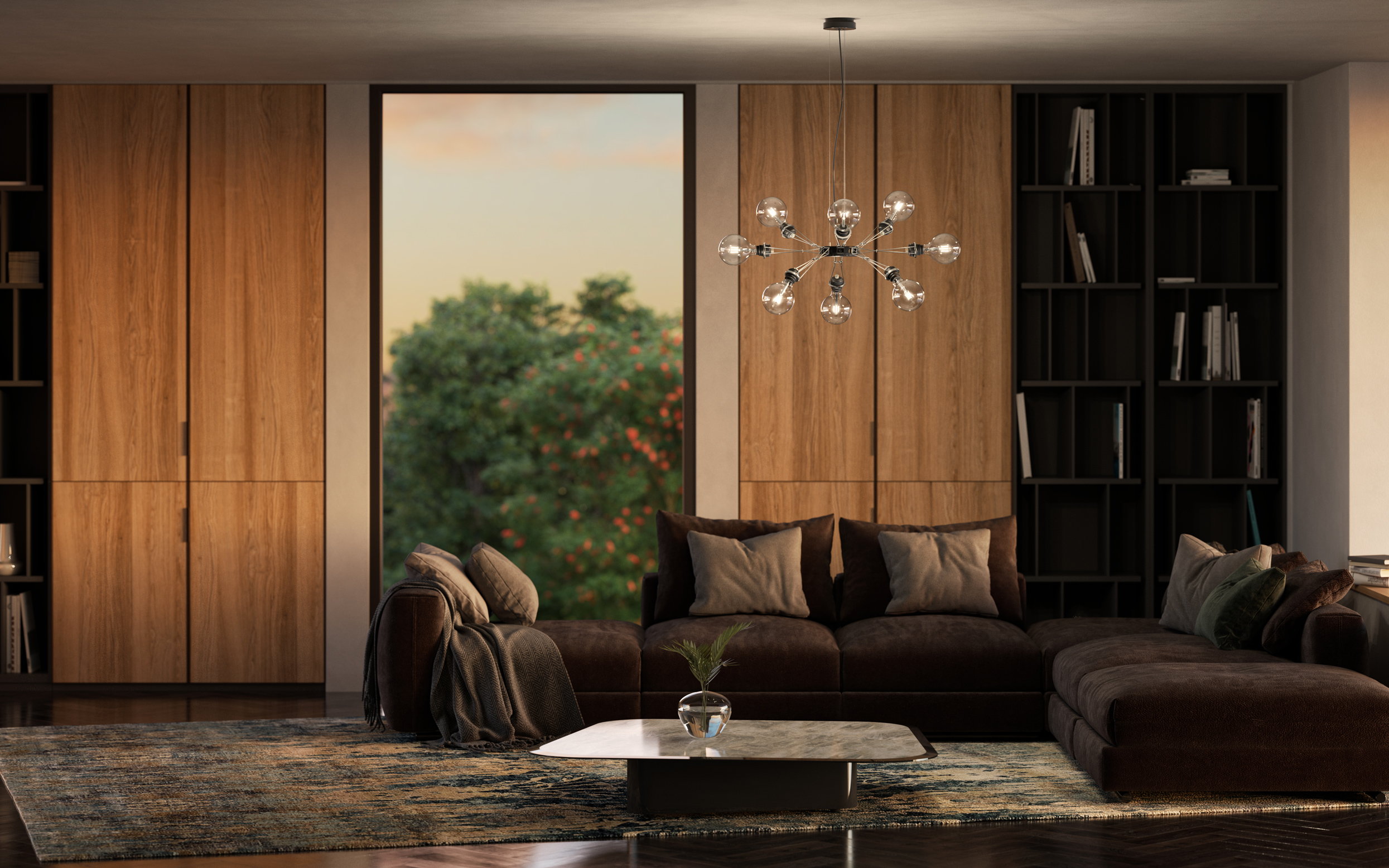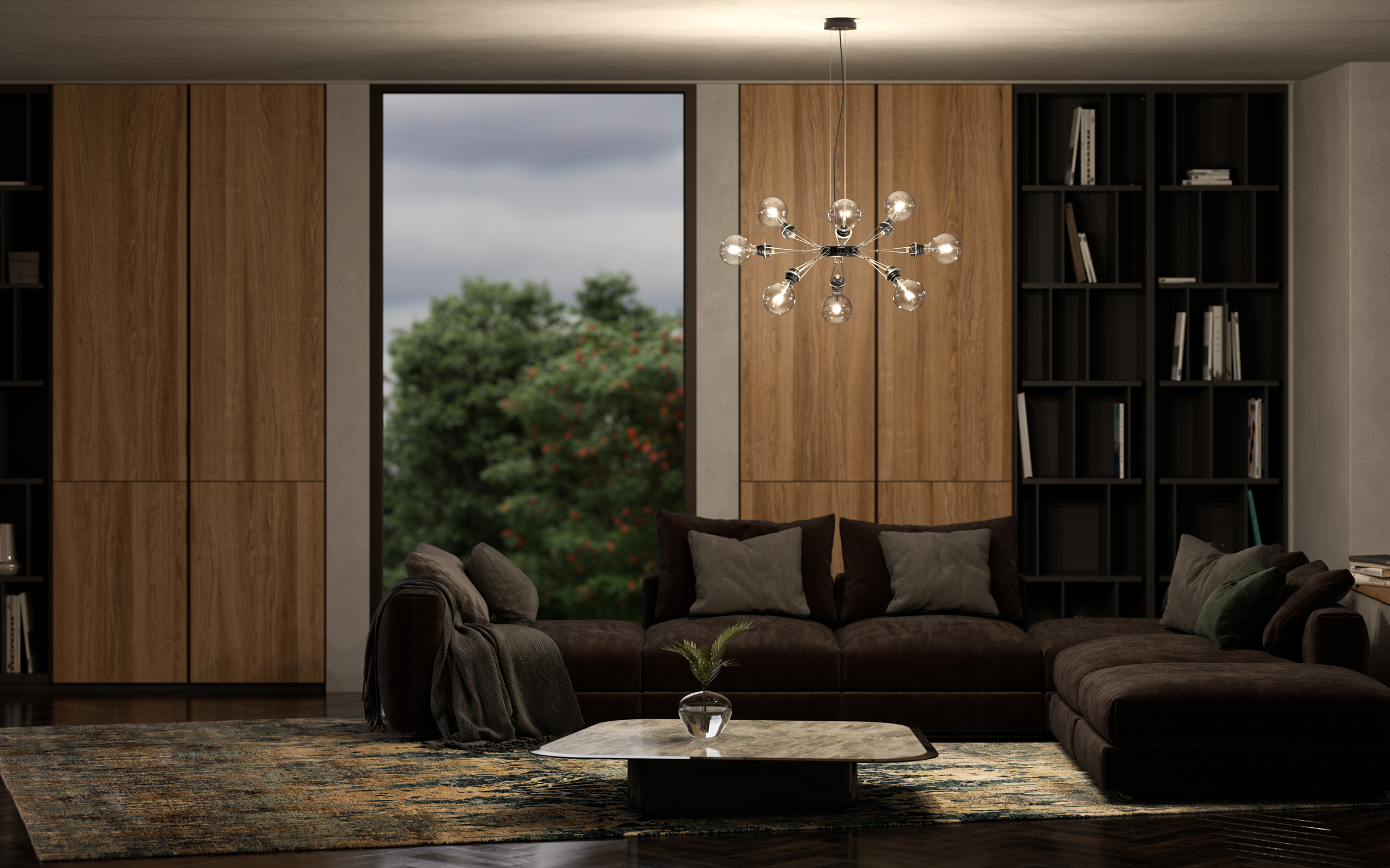 Matrix Otto особенно эффектно смотрится в просторных интерьерах. Гостиных, холлах, галереях и выставочных пространствах его футуристичный дизайн становится ярким акцентом. Прямое и рассеянное освещение делает его стильным решением. Светильник становится и функциональным решением. Доступный в двух вариантах отделки — матовом никеле и мягком чёрном покрытии — светильник легко вписывается в разные стилистические концепции.