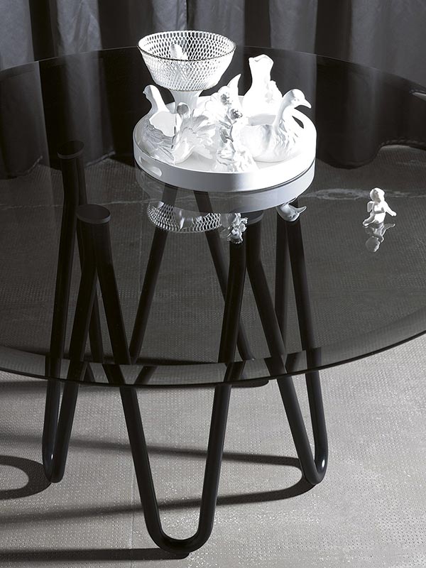 Основание стола Meduse изготавливается из крепкого металла и покрывается лаком в трех вариантах цвета: белый, черный или бронзовый. Круглая столешница выполняется из темного закаленного стекла или дуба, покрытого лаком. Подробнее уточняйте у менеджеров или в PDF инструкции.