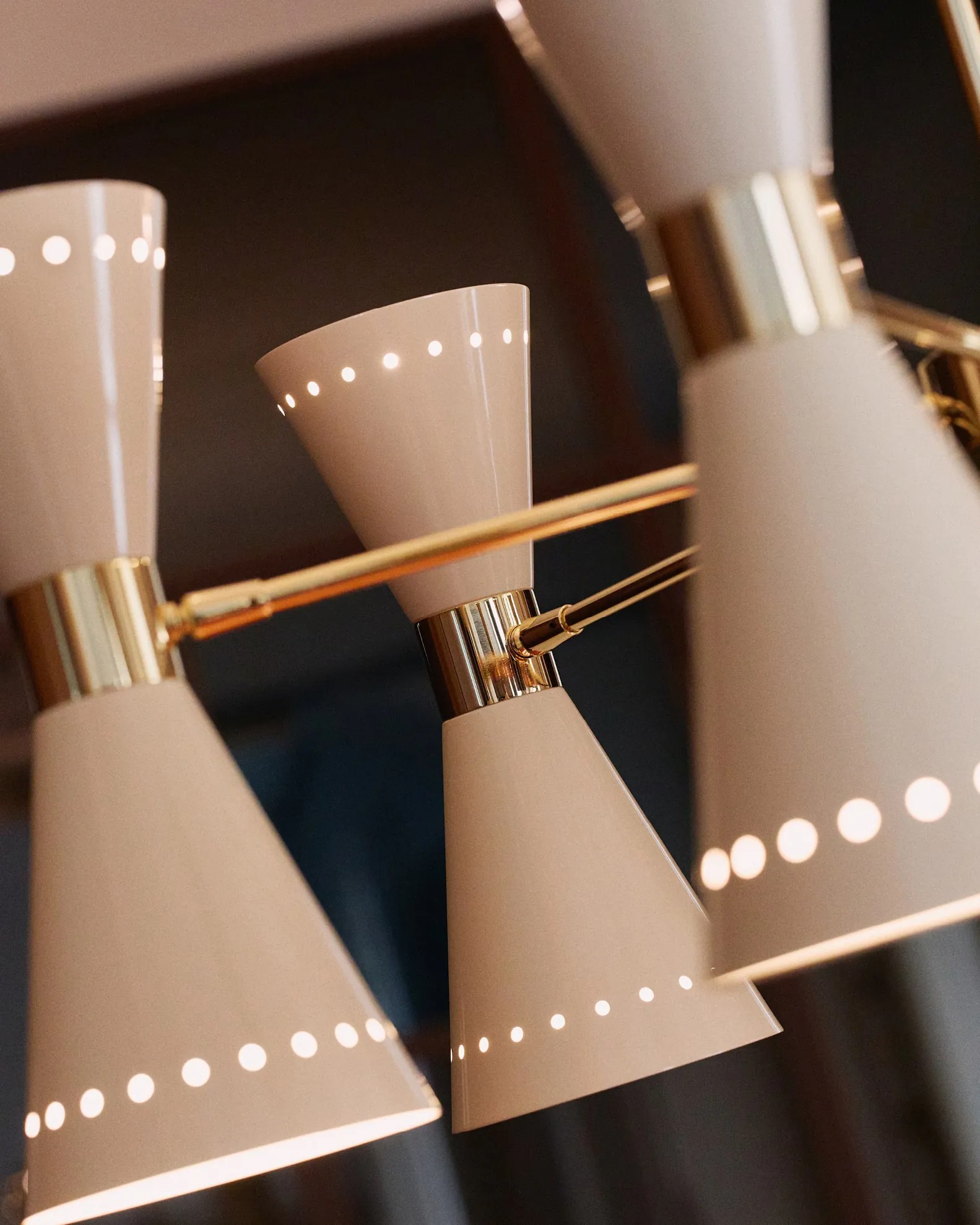 Главная особенность светильника — регулируемые абажуры в форме двойного конуса. Они создают необычное освещение. Прямые лучи света сочетаются с мягким отражённым свечением. Благодаря этому в помещении возникает тёплая, уютная атмосфера.