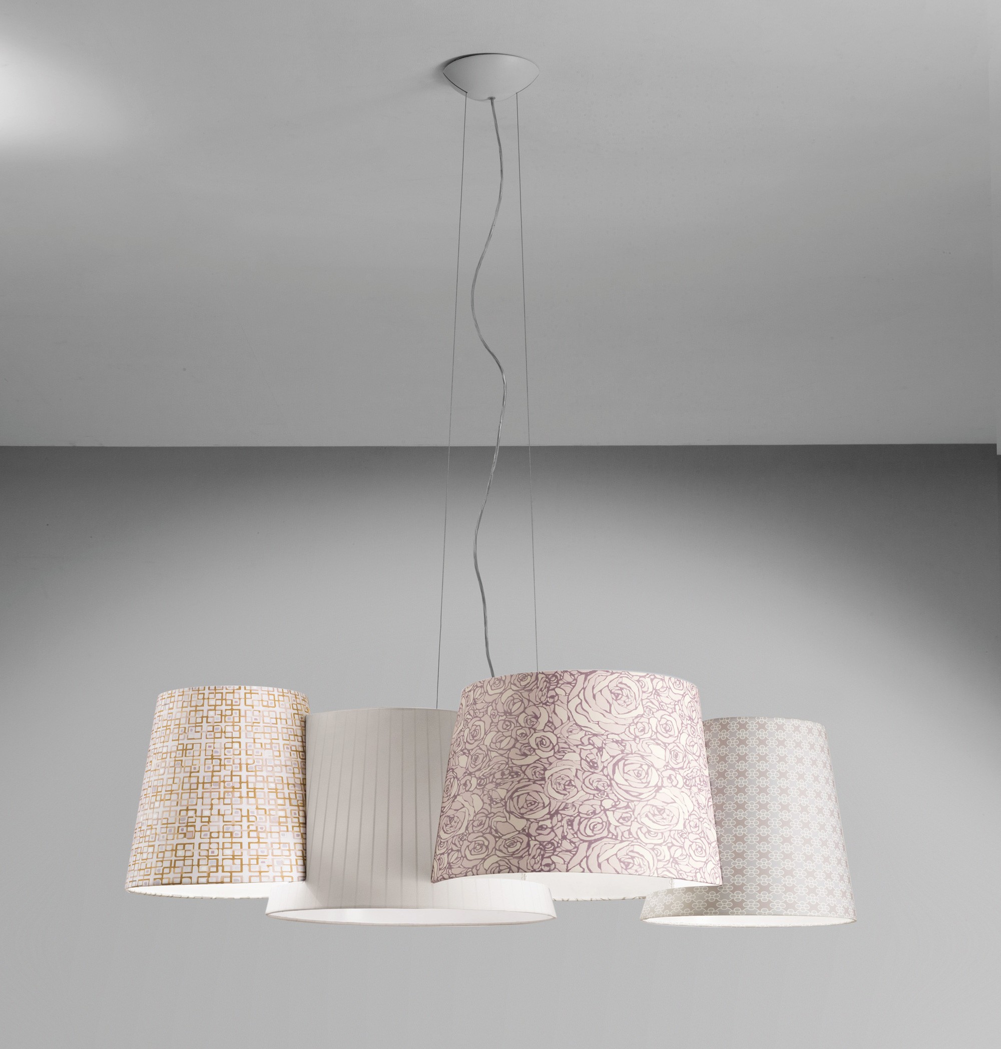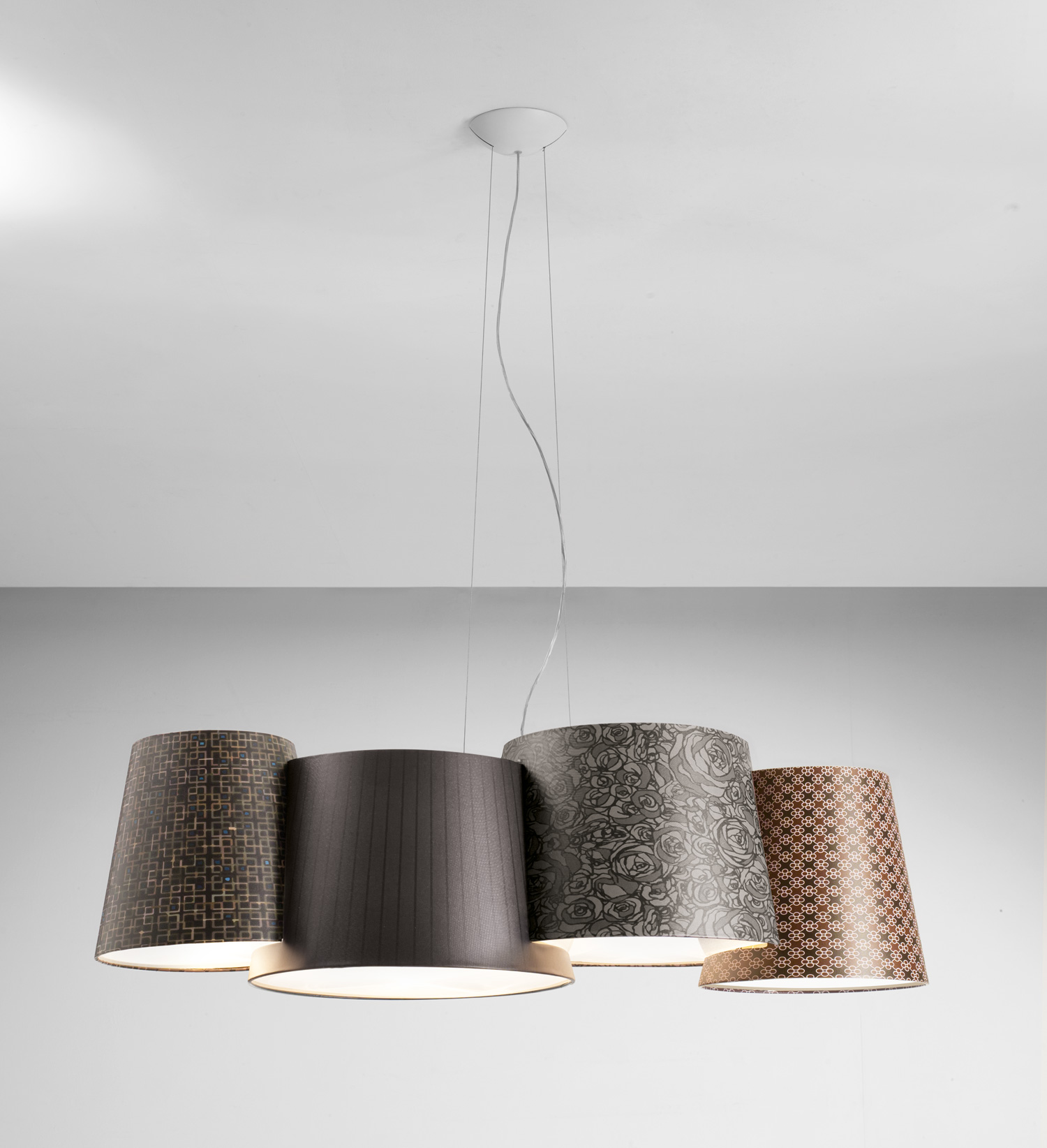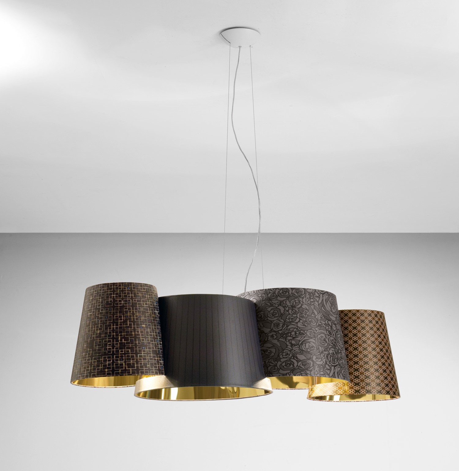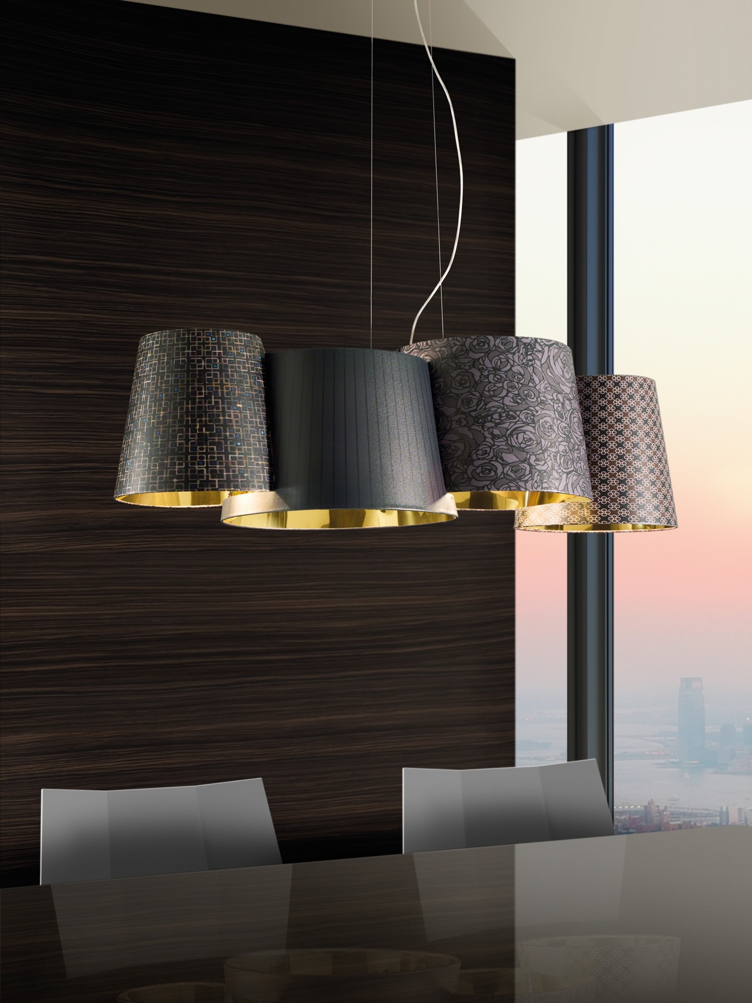 Эксклюзивная коллекция светильников Melting pot от AxoLight представляет эклектичные инсталляции для дизайнерского оформления интерьеров. Абажуры светильников покрыты абстрактными узорами темной или светлой расцветки, а внутри окрашены золотой или белый цвет. Для абажура вы можете выбрать любой узор, предложенный фабрикой.