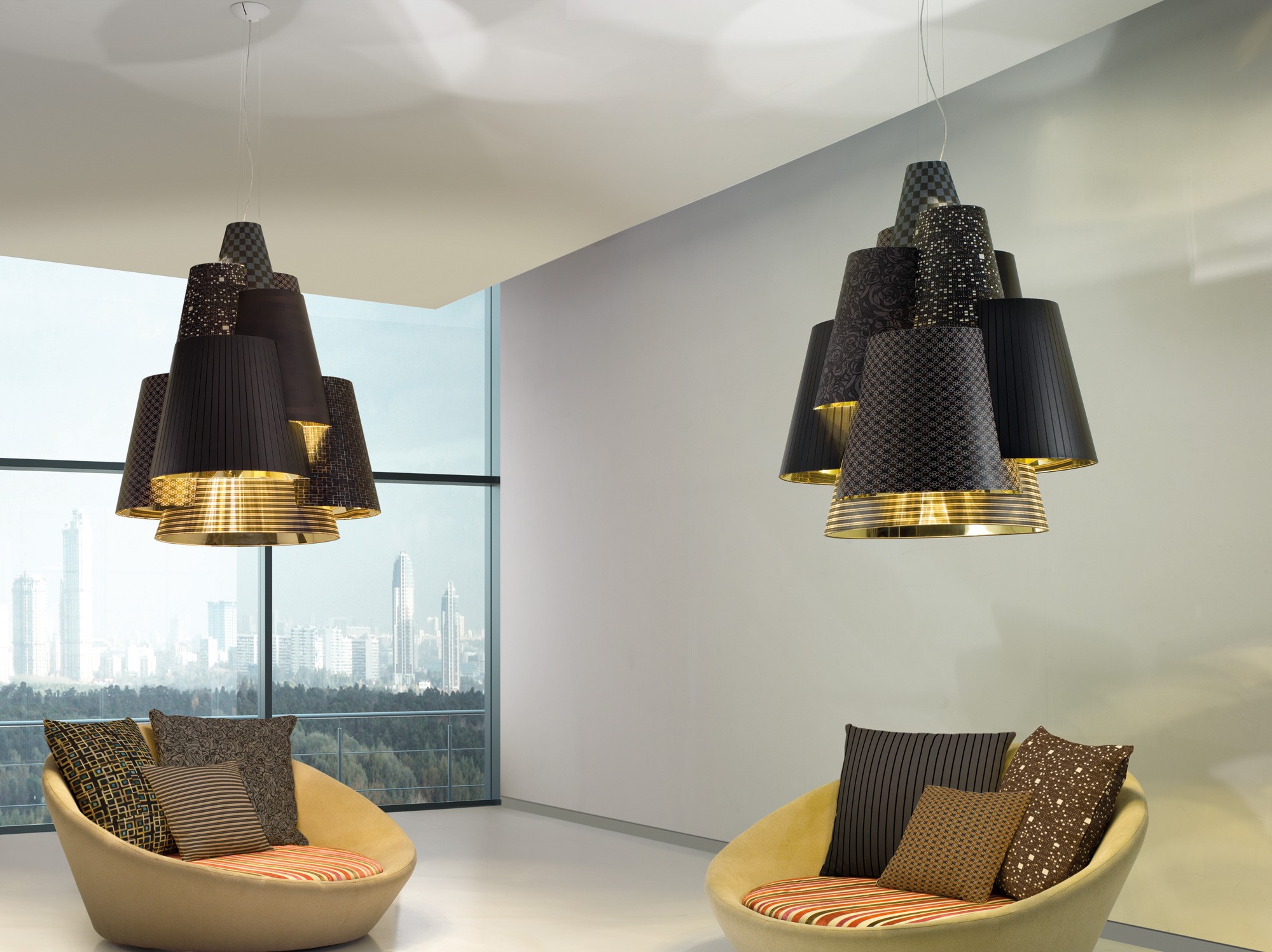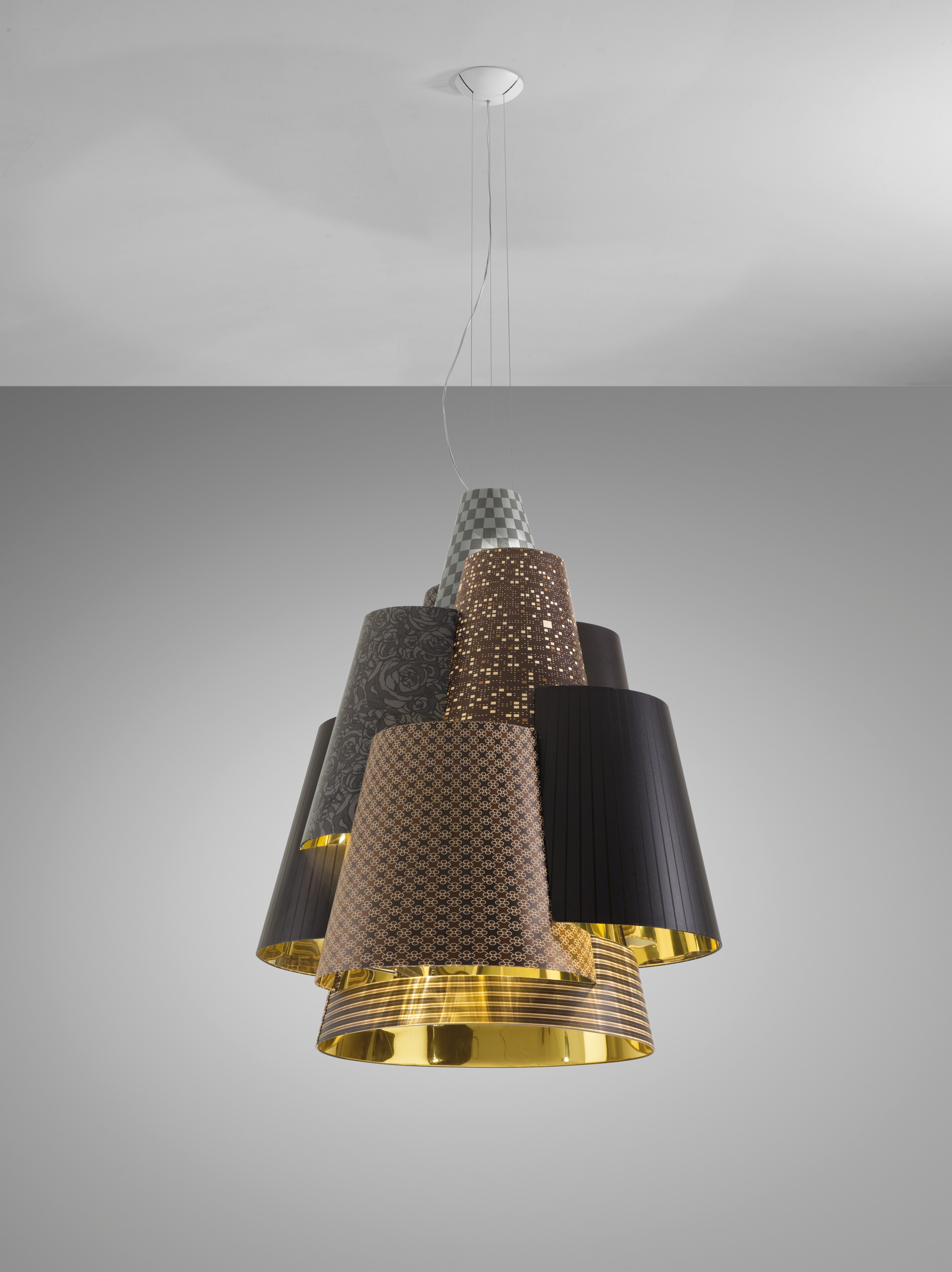 Эксклюзивная коллекция светильников Melting pot от AxoLight представляет эклектичные инсталляции для дизайнерского оформления интерьеров. Абажуры светильников покрыты абстрактными узорами темной или светлой расцветки, а внутри окрашены золотой или белый цвет. Для абажура вы можете выбрать любой узор, предложенный фабрикой.