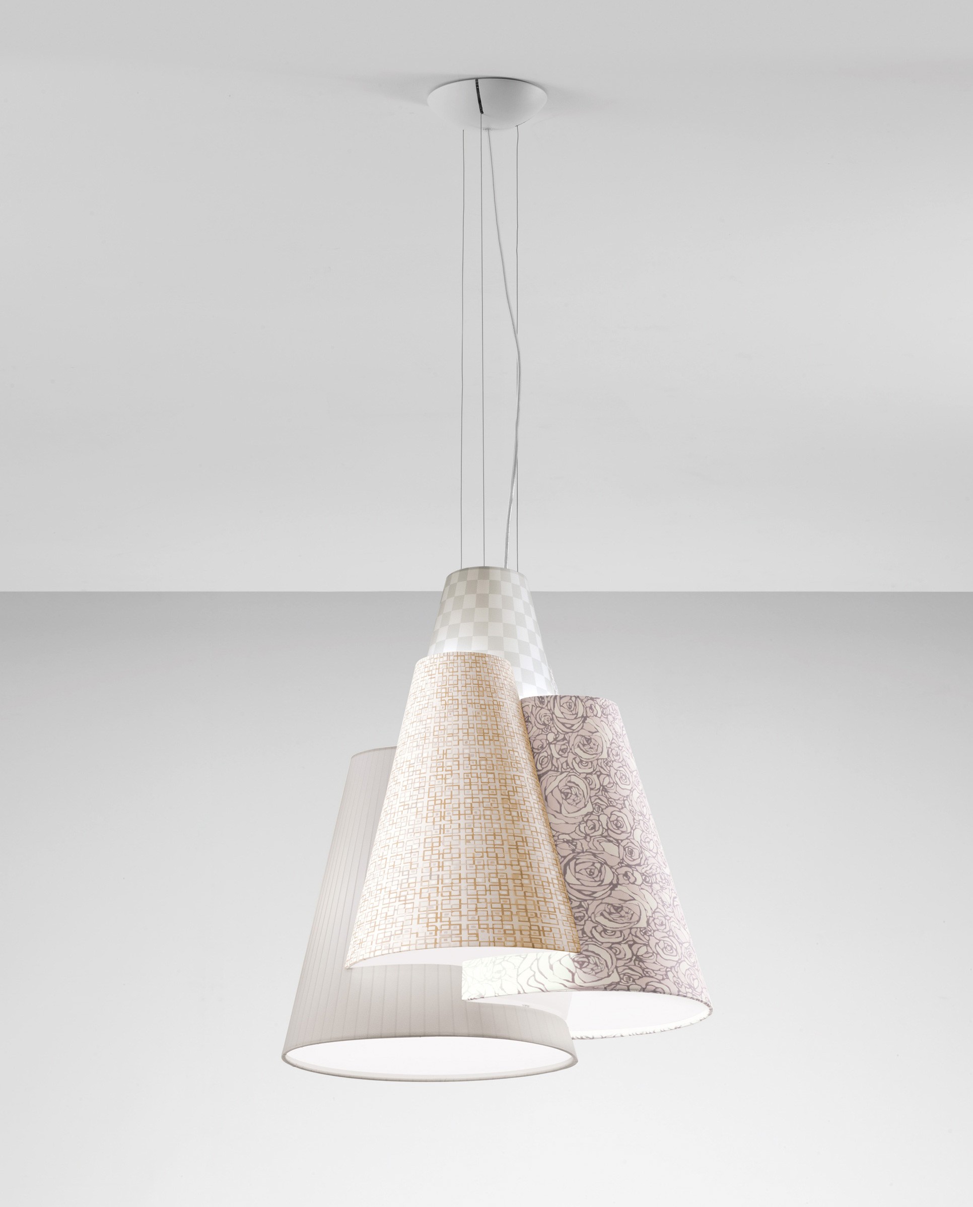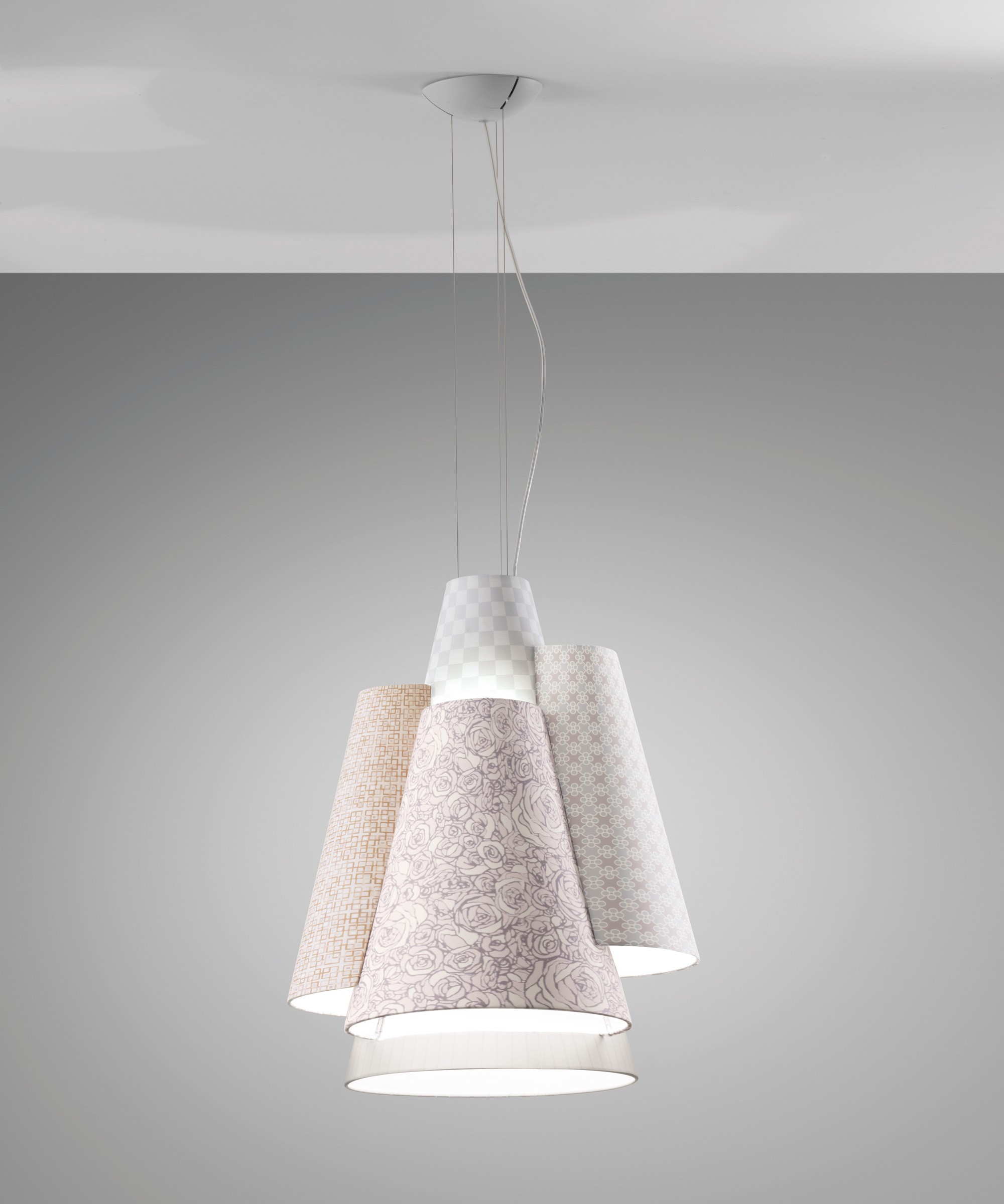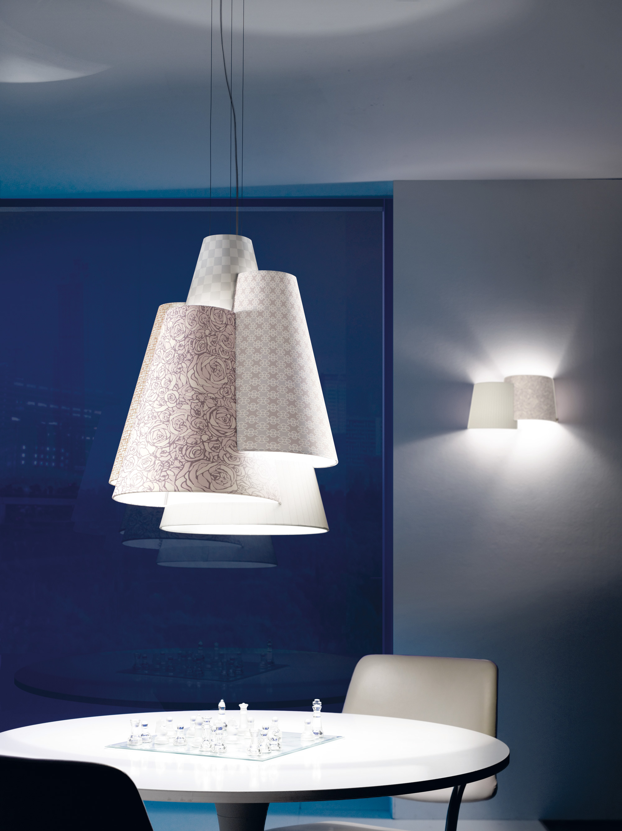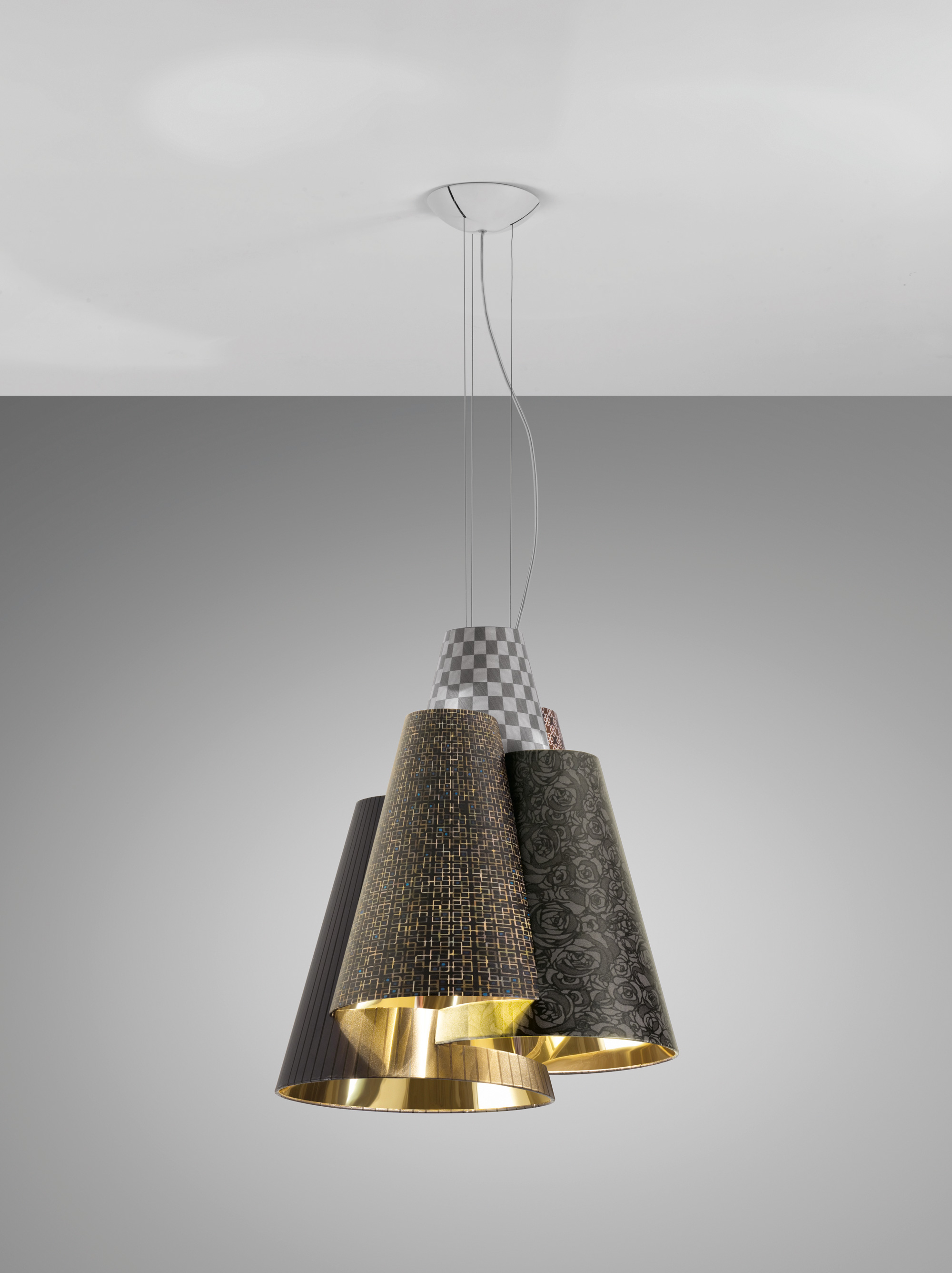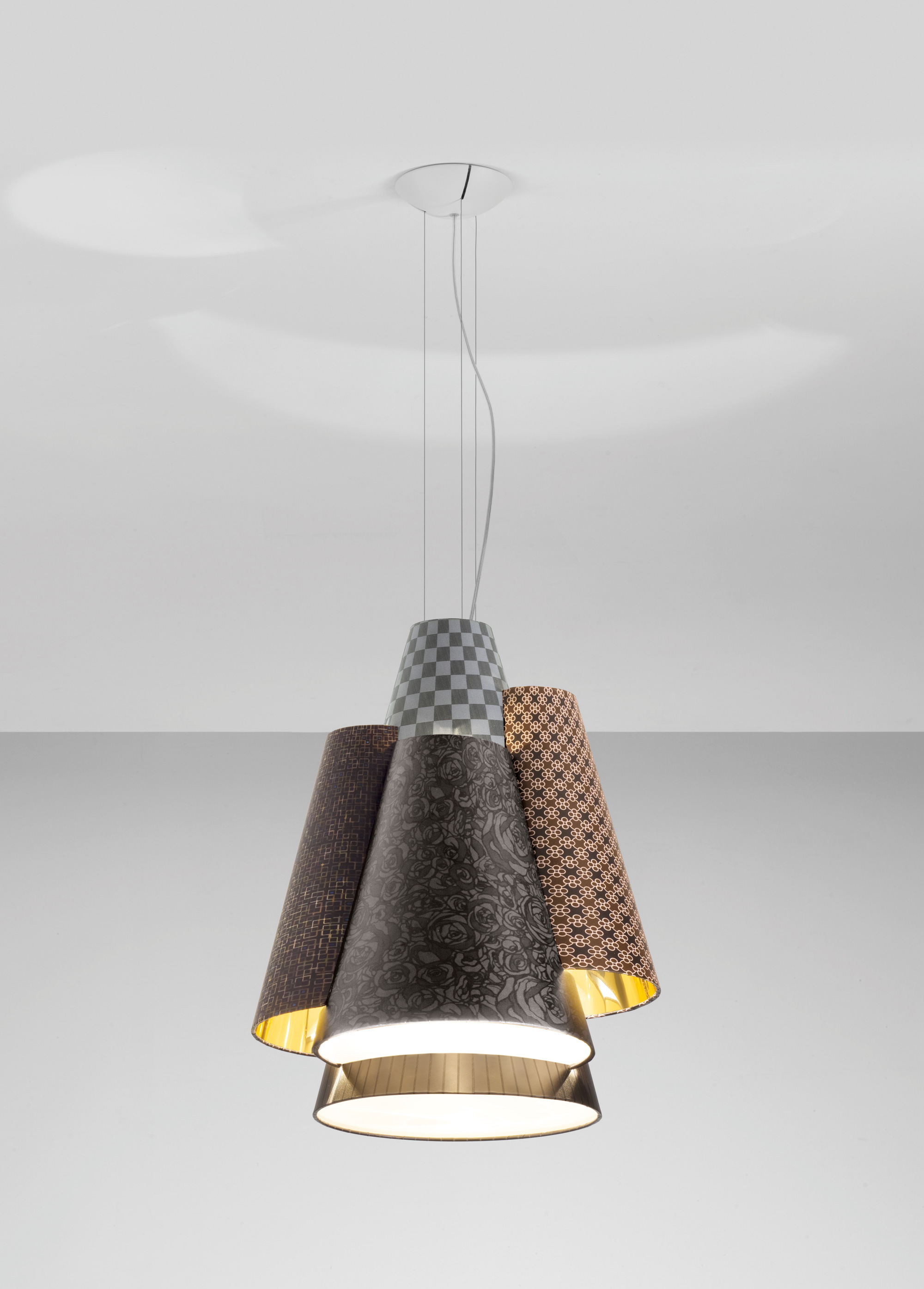 Эксклюзивная коллекция светильников Melting pot от AxoLight представляет эклектичные инсталляции для дизайнерского оформления интерьеров. Абажуры светильников покрыты абстрактными узорами темной или светлой расцветки, а внутри окрашены золотой или белый цвет. Для абажура вы можете выбрать любой узор, предложенный фабрикой.