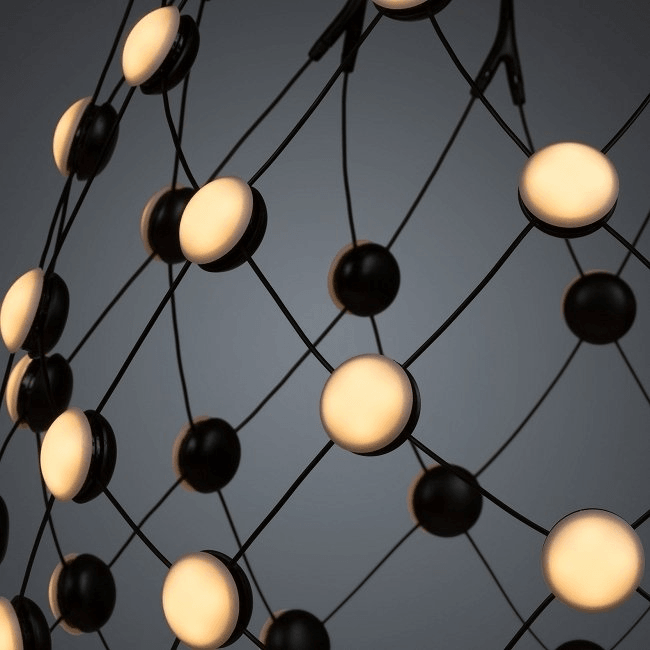 Подвесной светильник Mesh Suspension представляет собой уникальное произведение архитектурного освещения, создающее поистине завораживающее впечатление. Его конструкцию можно сравнить с воздушной паутиной, сотканной из тонких и гибких кабелей, образующих ажурный каркас. Именно здесь расположены миниатюрные светодиоды, расположенные на пересечении нитей, создавая волшебный эффект мерцания, словно звезды на ночном небе.