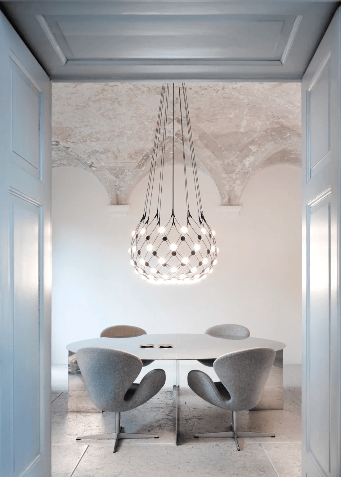 Эта сложная, но практически невесомая структура создает иллюзию полного исчезновения самой конструкции, превращаясь лишь в проводника света — истинного героя сцены. Свет свободно распространяется сквозь тонкие нити, рассеиваясь мягким сиянием и заполняя пространство уникальным образом.