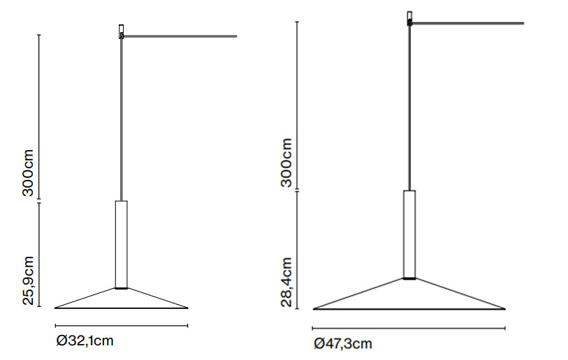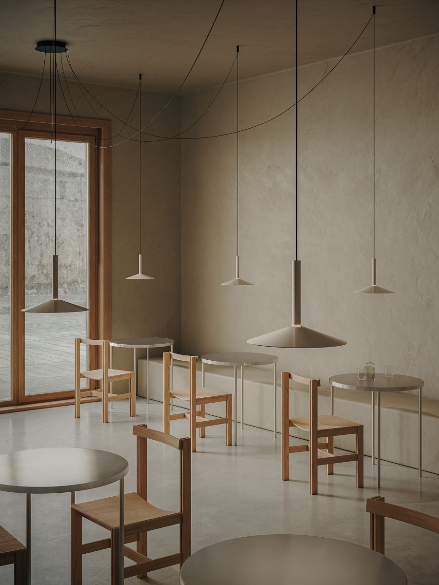 Каждый светильник имеет цилиндрический корпус со встроенным светодиодом и может быть дополнен различными коническими абажурами — устрично-белыми или чёрными, разных размеров. Линза, почти незаметная, равномерно распределяет свет. В версии на 24 В несколько светильников можно подключить к одному источнику питания, что позволяет создавать комплексные световые решения для больших помещений.