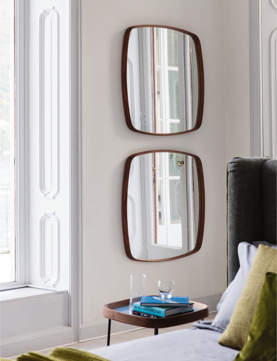 Рамы зеркал изготовлены из высококачественного орехового массива Canaletta, который является визитной карточкой компании Porada. Древесина Canaletta известна своим уникальным рисунком и плотностью, что придает зеркалам особую выразительность и долговечность. Мягкие формы рам с закругленными углами создают ощущение легкости и изящества, гармонично сочетаясь с жесткими геометрическими линиями зеркал.