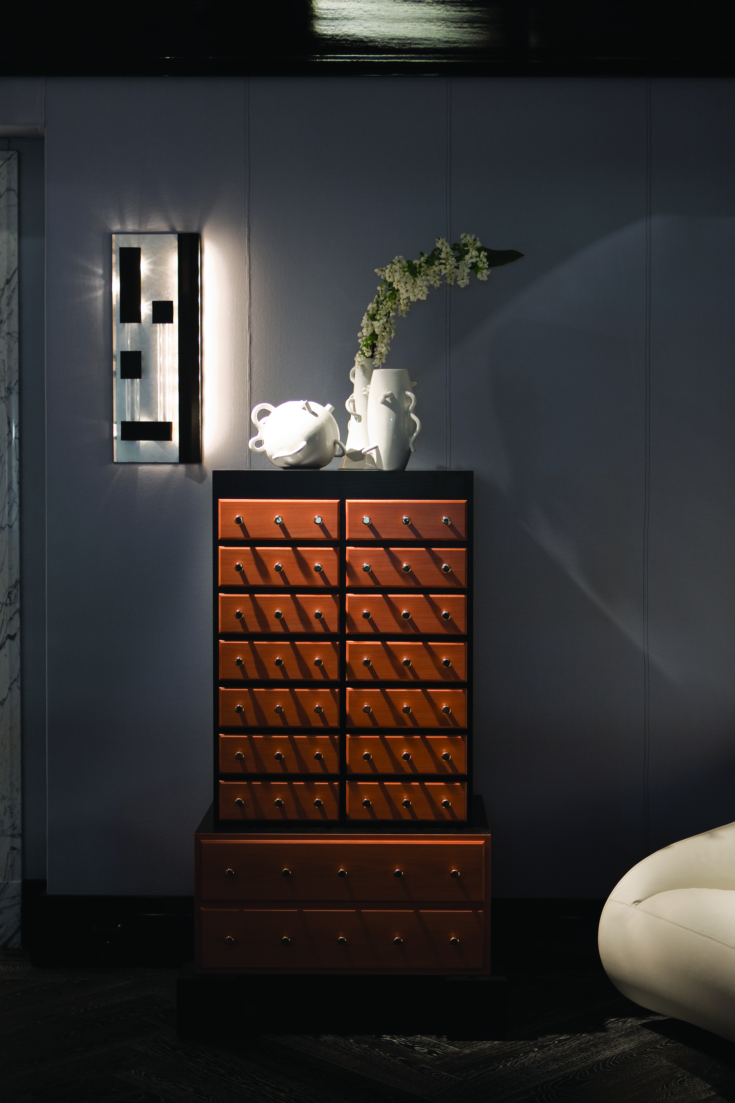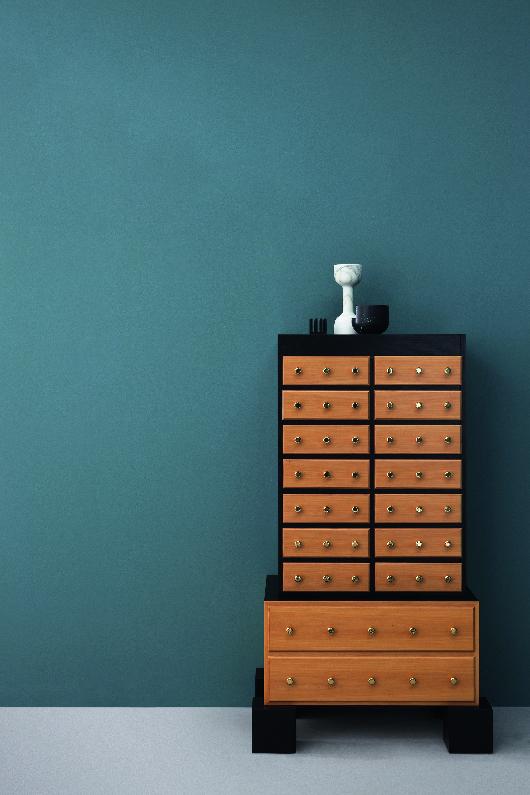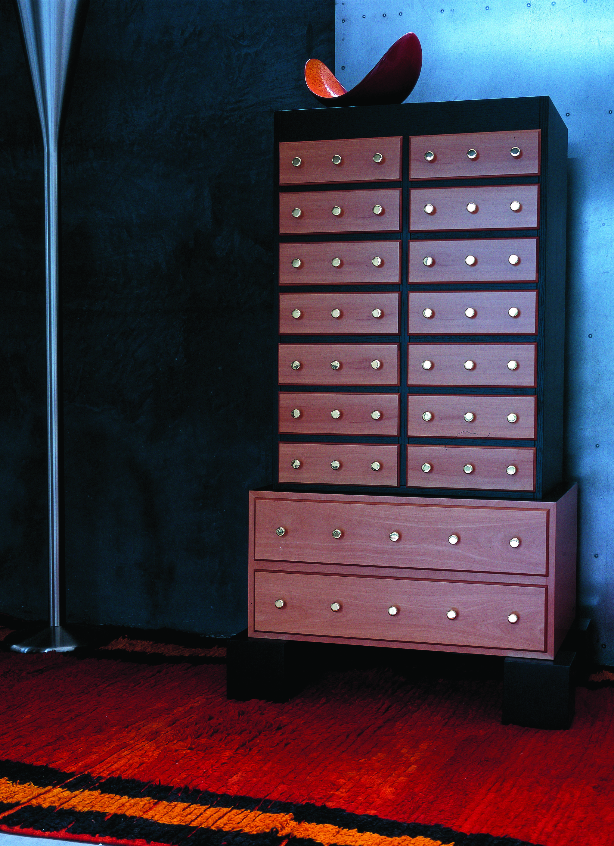Оригинальный комод Mombasa от дизайнера Этторе Соттаса (Ettore Sottsass) входит в лимитированную коллекцию от Zanotta. Фасад комода выполнен из полированной древесины груши. Топ, боковины, массивные ножки и декоративные планки предлагаются в шпоне тонированном в темно-коричневый цвет ясеня. Сохранена текстура натуральной древесины. Ручки выдвижных ящиков выполнены из латуни. Подробности вы можете уточнить у наших менеджеров, а также найти в ПДФ инструкции.