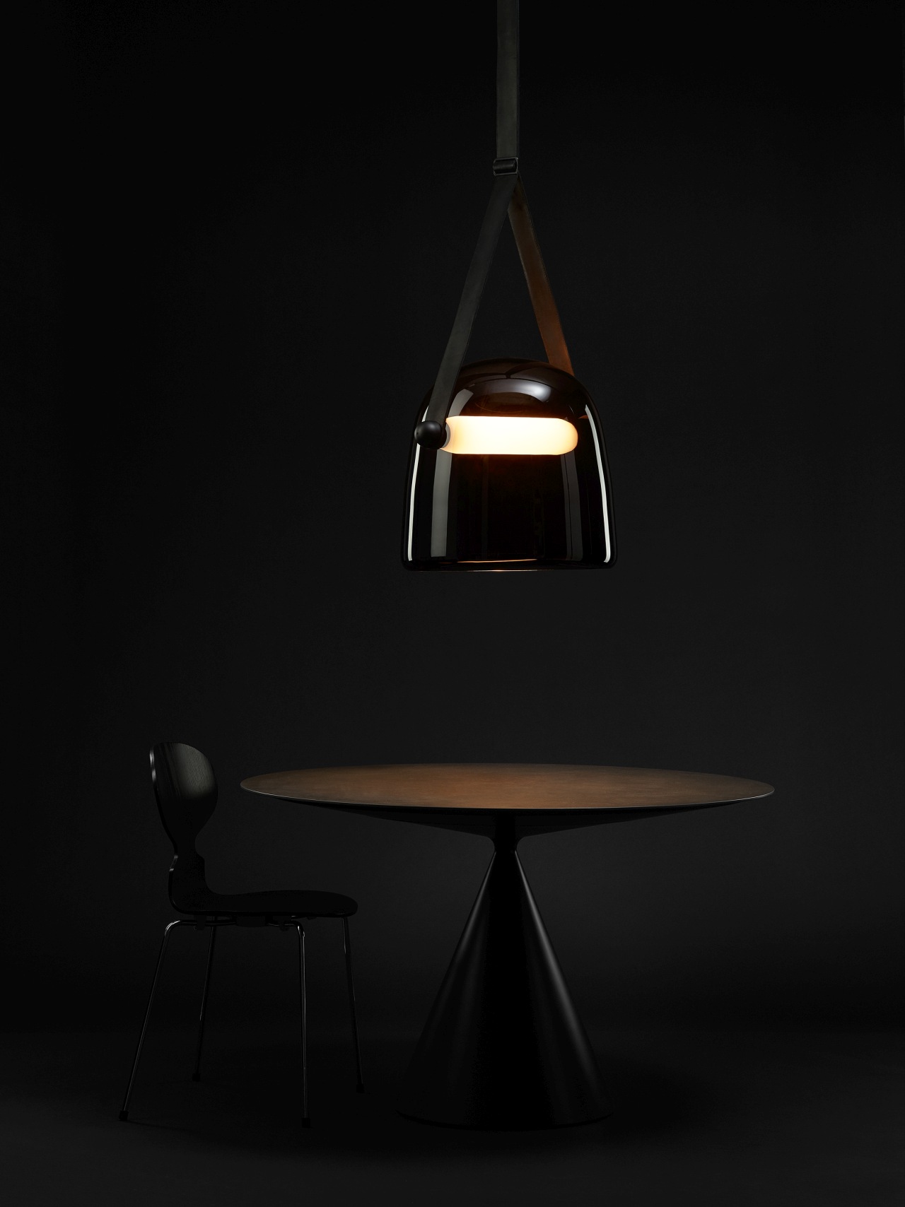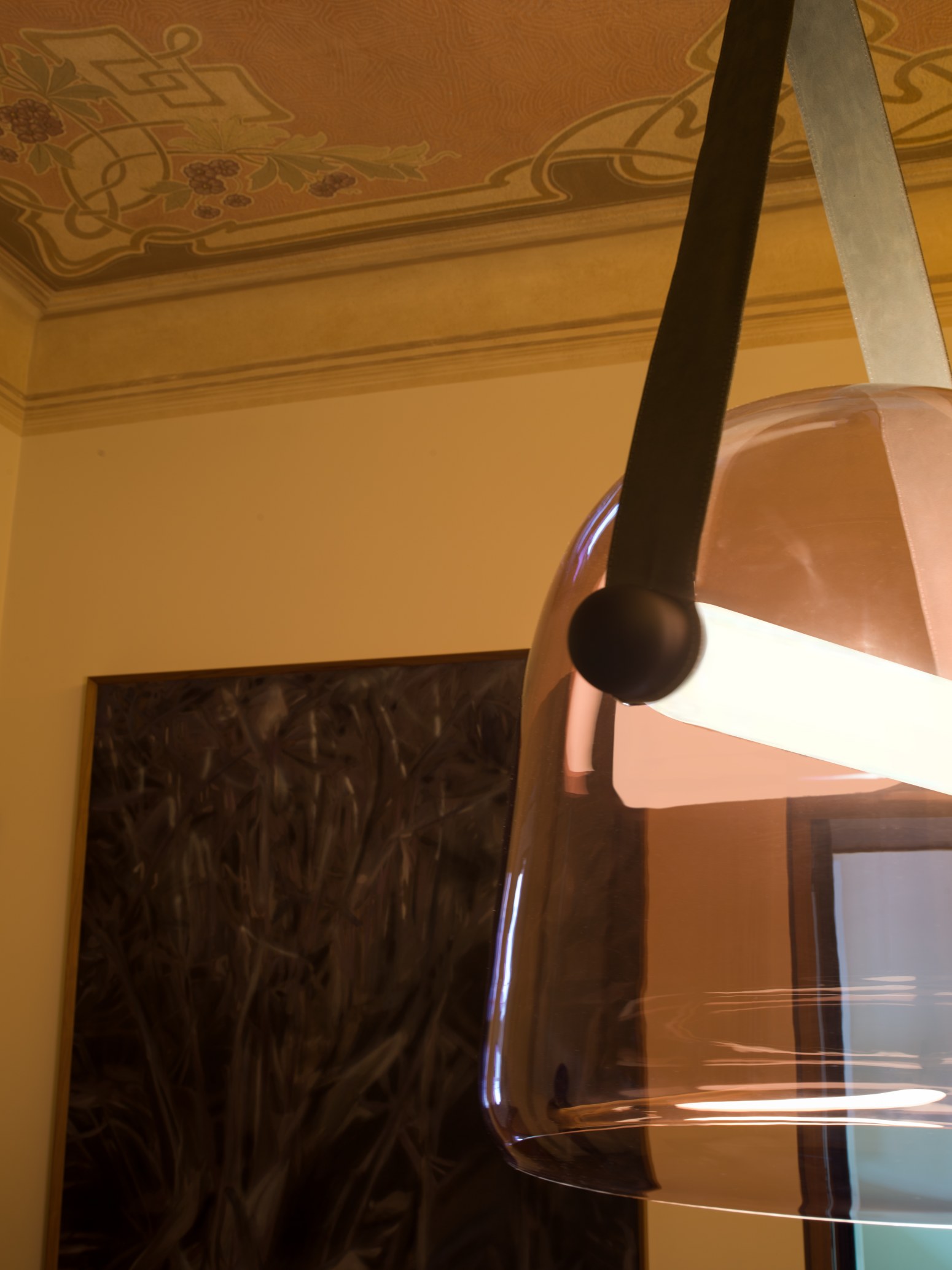 Абажур светильника выполнен из стекла и представлен в различных цветовых решениях. Кожаные подвесные ремни бывают чёрного, серого, натурального и коричневого цветов. Они придают светильнику особый шарм и элегантность.