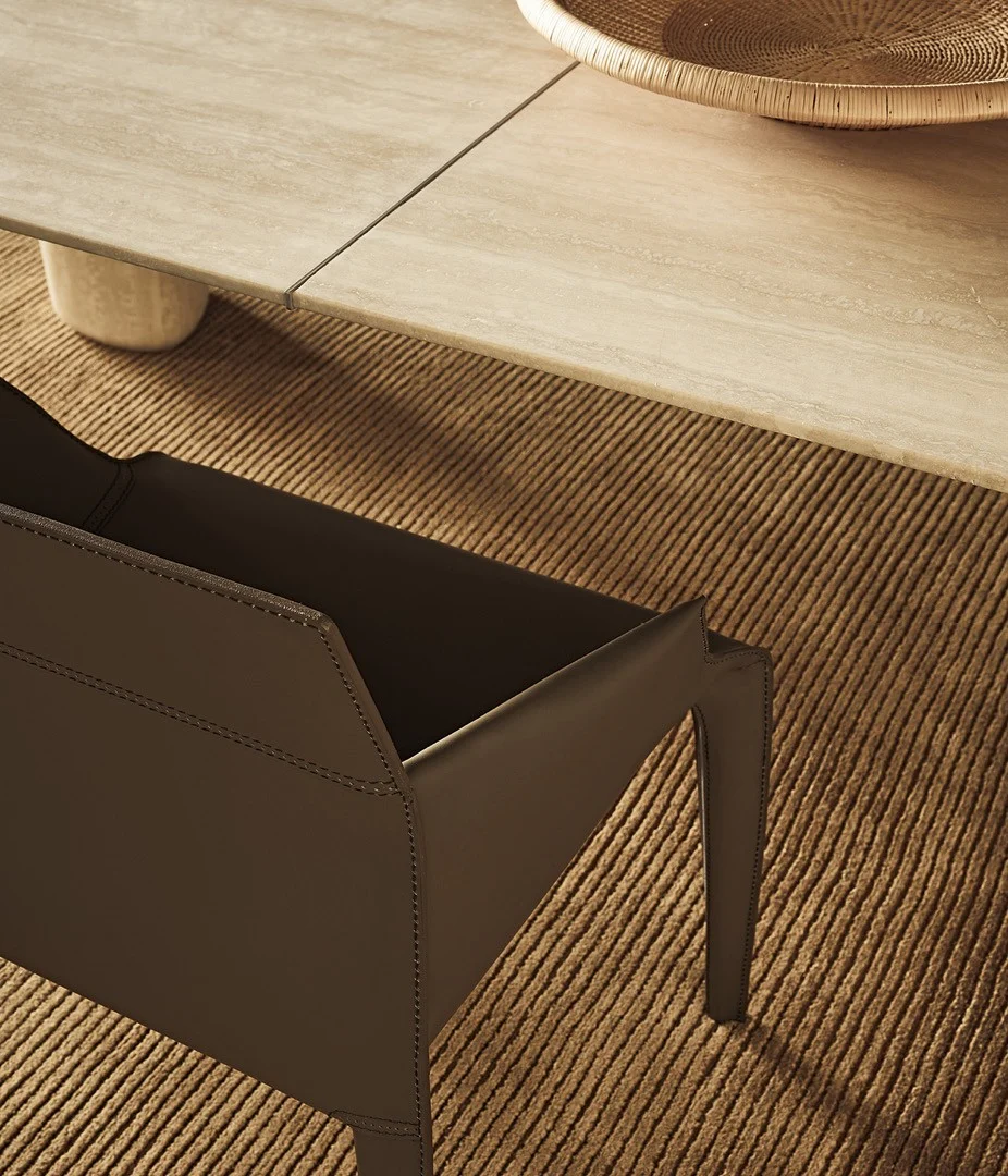 Стол Monolith существует на пересечении эпох — его мощные, будто высеченные временем формы несут генетическую память о первобытных дольменах, тогда как безупречные линии и филигранная работа с материалами говорят на языке contemporary design. Черный вяз с его глубоким теплым рисунком или благородный травертин с геологическими прожилками — выбор столешницы становится философским жестом, определяющим характер всего объекта.