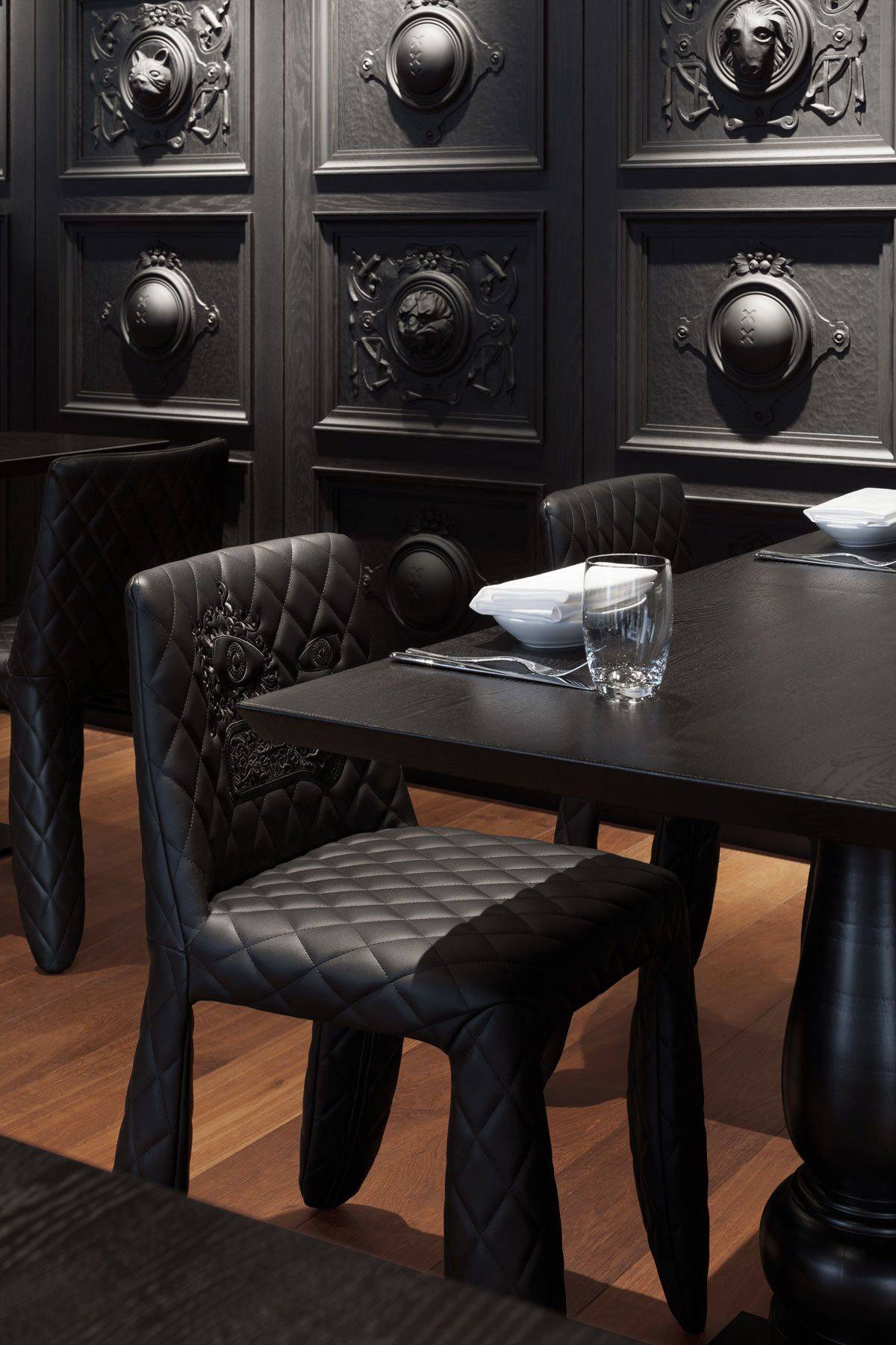 В коллекцию Monster входят барные и обеденные стулья с подлокотниками или без них. Основание стула выполняется из крепкой стали. Для обивки применяется стеганная искусственная кожа или шерсть в различных цветах. Доступен вариант модели с оригинальной вышивкой на спинке. В качестве упругого и мягкого наполнителя используется пенополиуретан. Подробную информацию о данной модели уточняйте у менеджеров или в PDF инструкции.