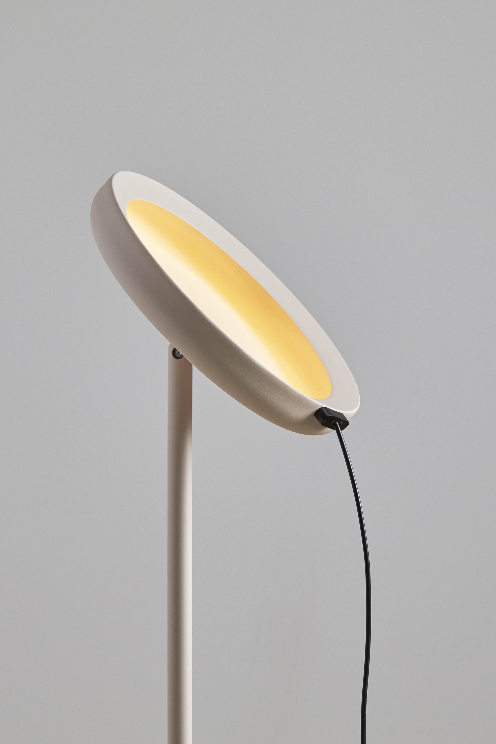Абажур торшера имеет круглую форму и сложенные края, которые скрывают встроенную светодиодную ленту. Благодаря этому обеспечивается мягкое непрямое освещение, которое создаёт уютную и расслабленную атмосферу.