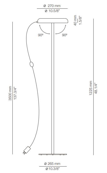 Торшер Mood Floor оснащён кнопочным диммером на шнуре, который позволяет регулировать яркость освещения. Универсальная вилка обеспечивает удобство подключения к любой стандартной электрической розетке.