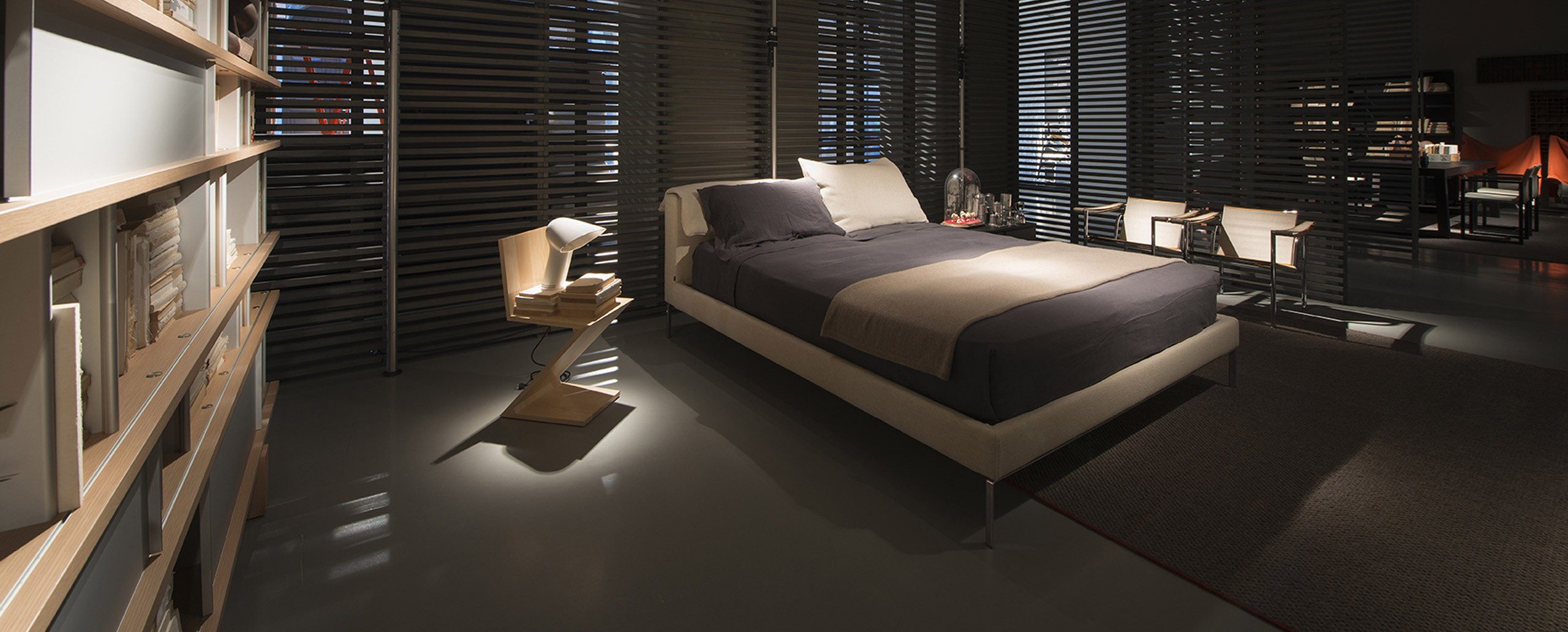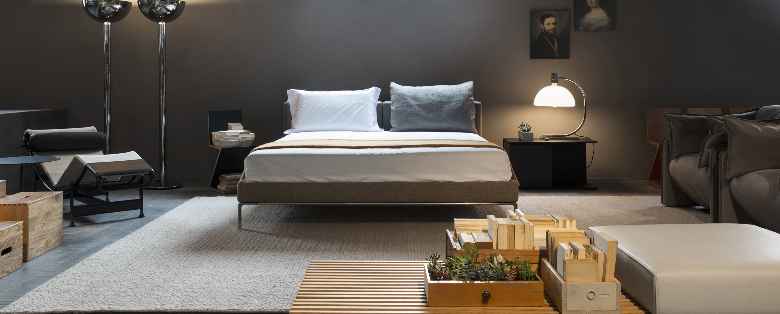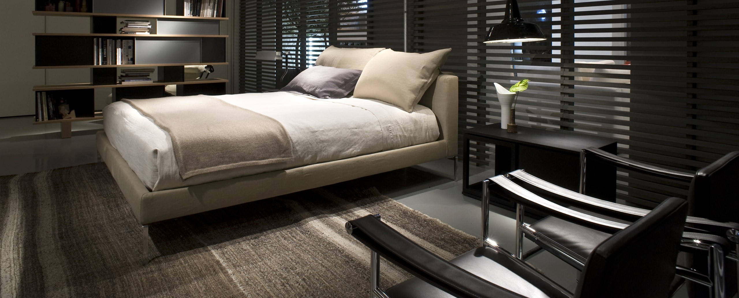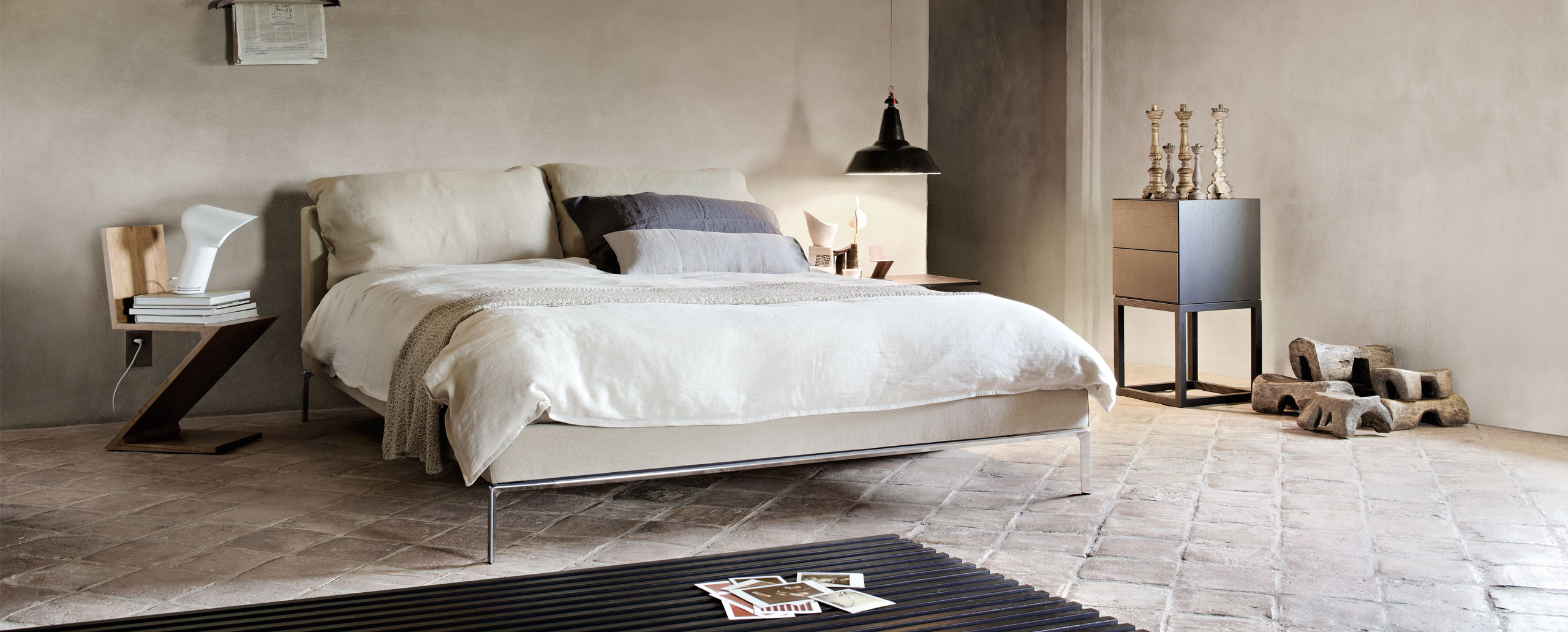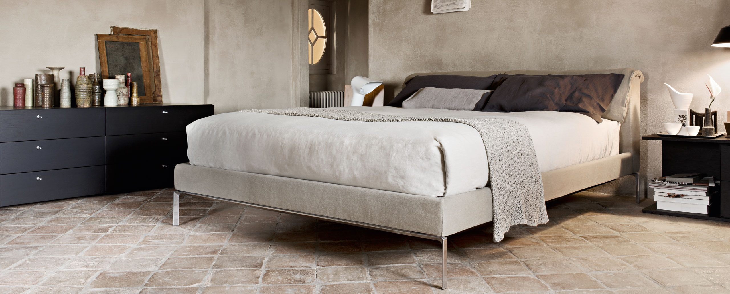 Двуспальная кровать Moov разработана знаменитым итальянским дизайнером Пьеро Лиссони (Piero Lissoni). Многослойность конструкции обеспечивается мягким изголовьем и каркасом из древесины тополя, поверх которого располагаются подушки. Они крепятся на верхней части спинки кровати с помощью системы роликов. Тонкие ножки изготовлены из литого полированного алюминия. Возможные варианты обивки: съемные чехлы из ткани или несъемные чехлы из кожи различных оттенков. Модель производится в нескольких размерах. Более подробную информацию можно уточнить у менеджера.