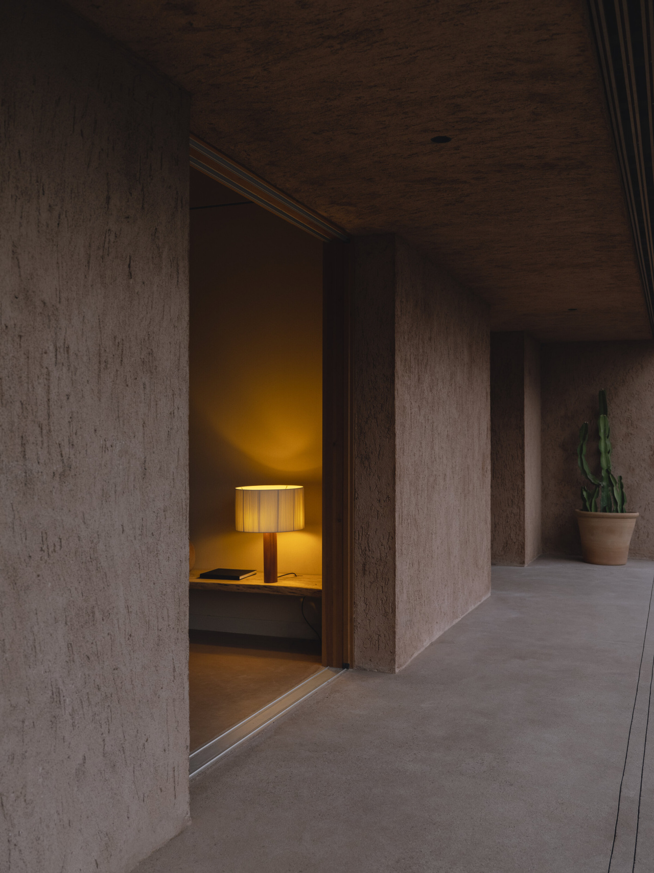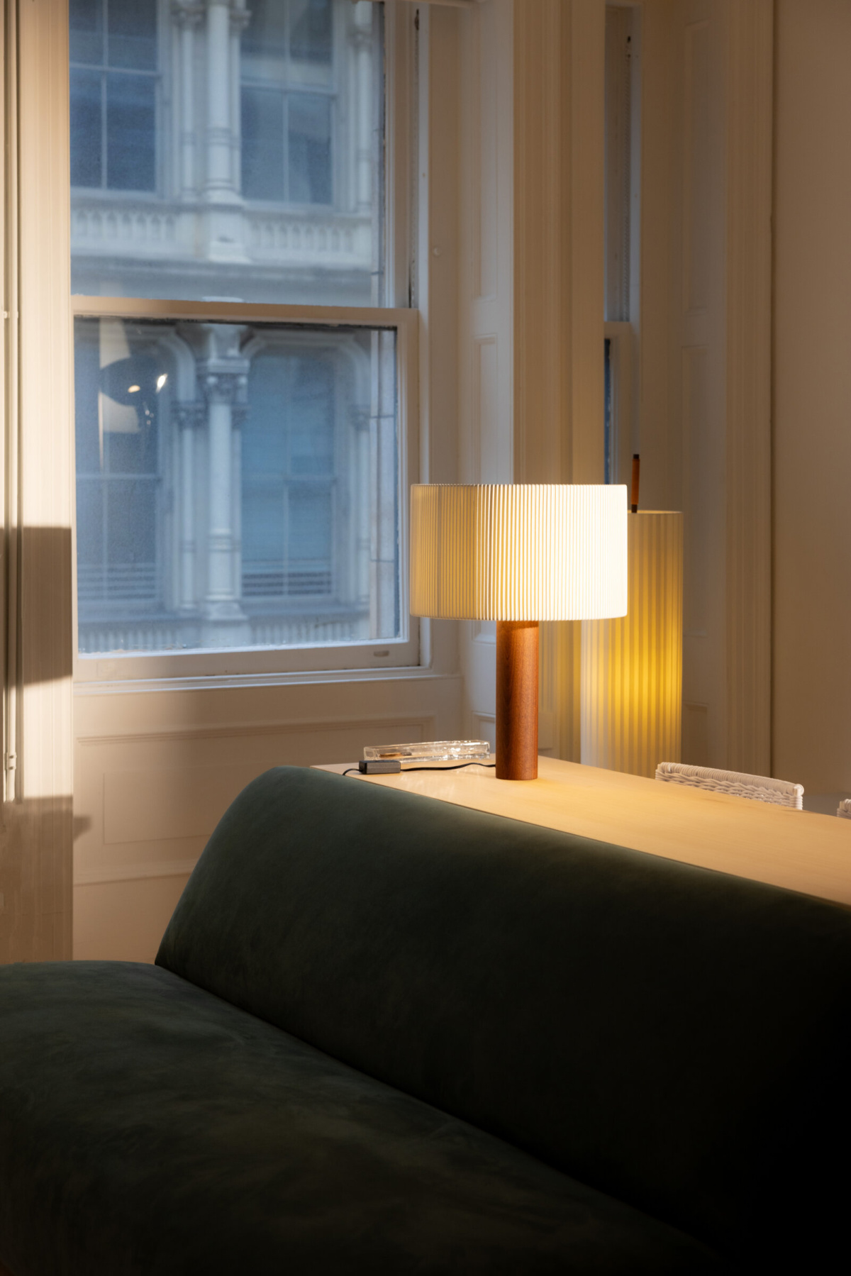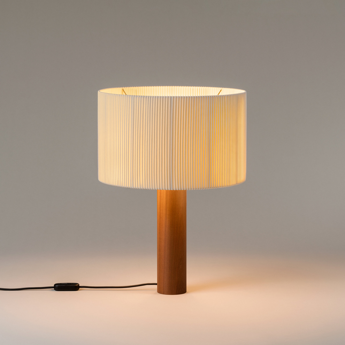 Особенность абажура — материал: белая хлопчатобумажная лента, которую обычно используют в переплётном деле. Его форма немного асимметрична — боковые рёбра образуют неровные складки. Когда светильник включён, эти складки создают красивую игру света и тени. Свет получается мягким и рассеянным, наполняет пространство тёплым сиянием.