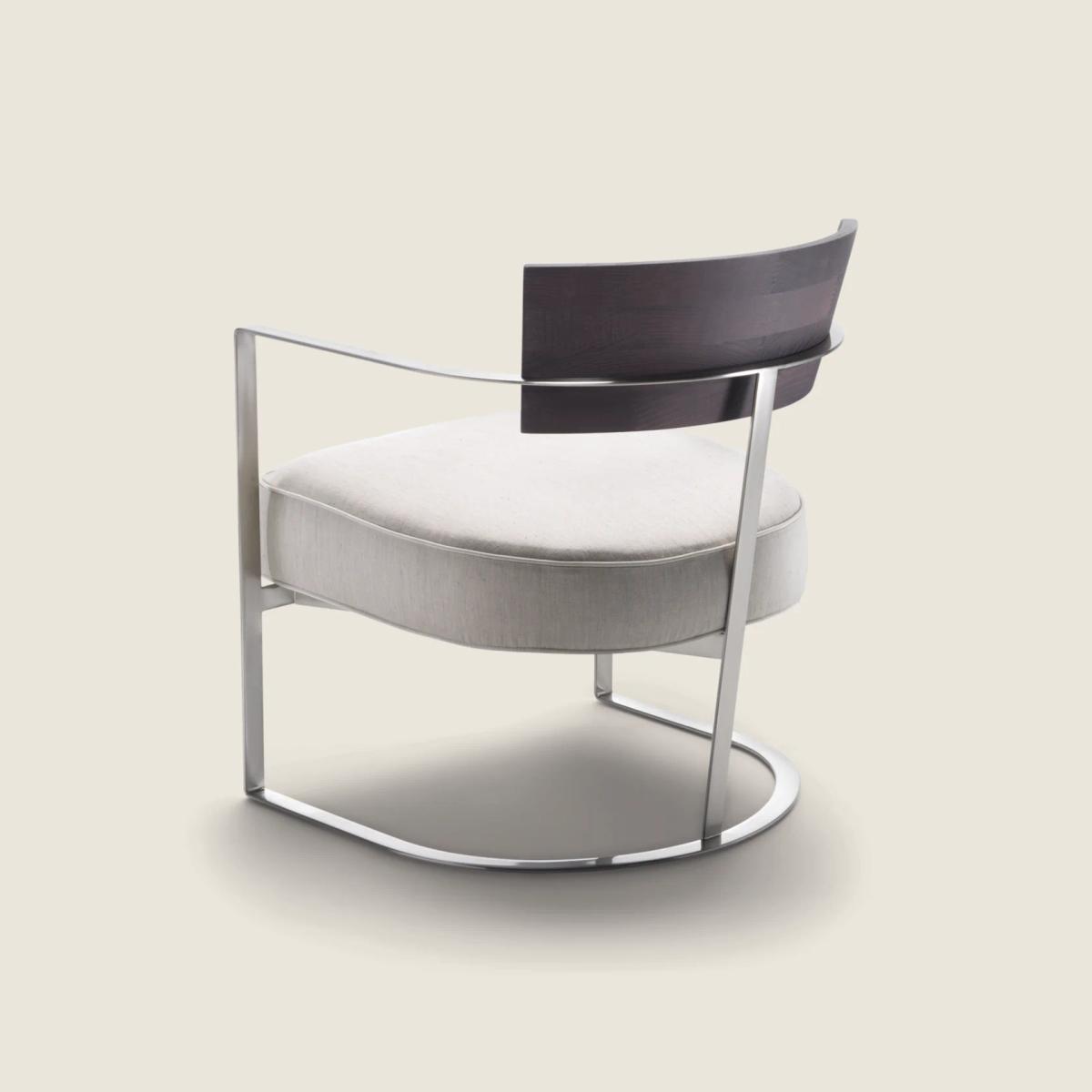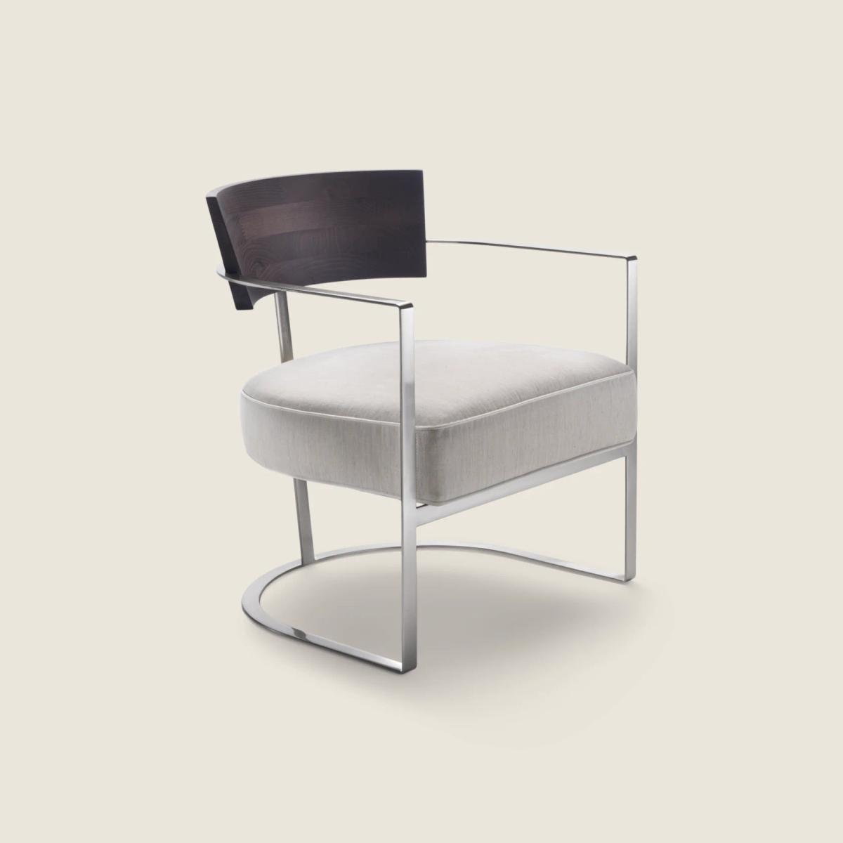 Основа кресла – прочный металлический каркас, выполненный в минималистичном стиле. Он не только обеспечивает устойчивость и долговечность, но и придает модели визуальную легкость. Предлагается в различных изысканных вариантах отделки: сатинированная, хромированная, вороненая, матовая титановая 710, черный хром или глянцевый антрацит. Он гармонично сочетается с массивной деревянной спинкой и мягким сиденьем, создавая ощущение легкости и изящества.