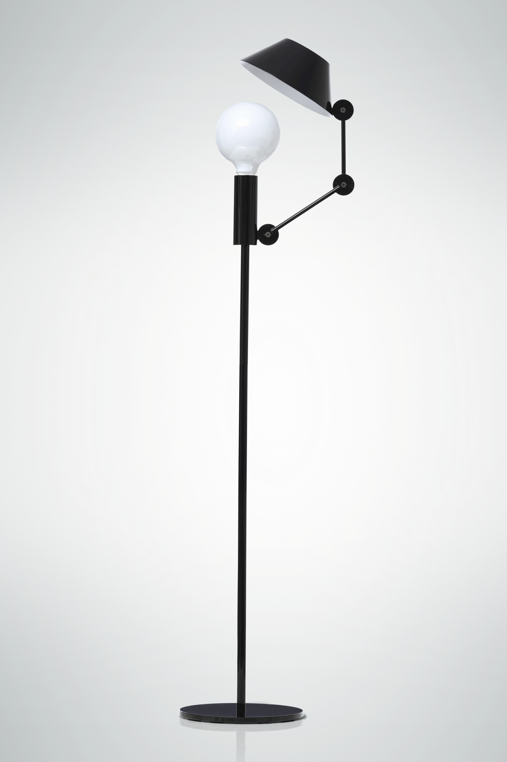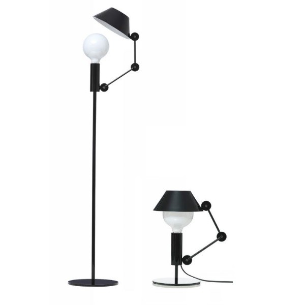 Настольная лампа и торшер серии Mr. light, с движущейся рукой и шляпой изготовлены в черном матовом цвете. Светильники имеют двухцветный диффузор, с белой матовой внутренней частью для широкого распространения света. Светоотдача в верхней части может быть уменьшена, благодаря покрытию лампы шляпой.