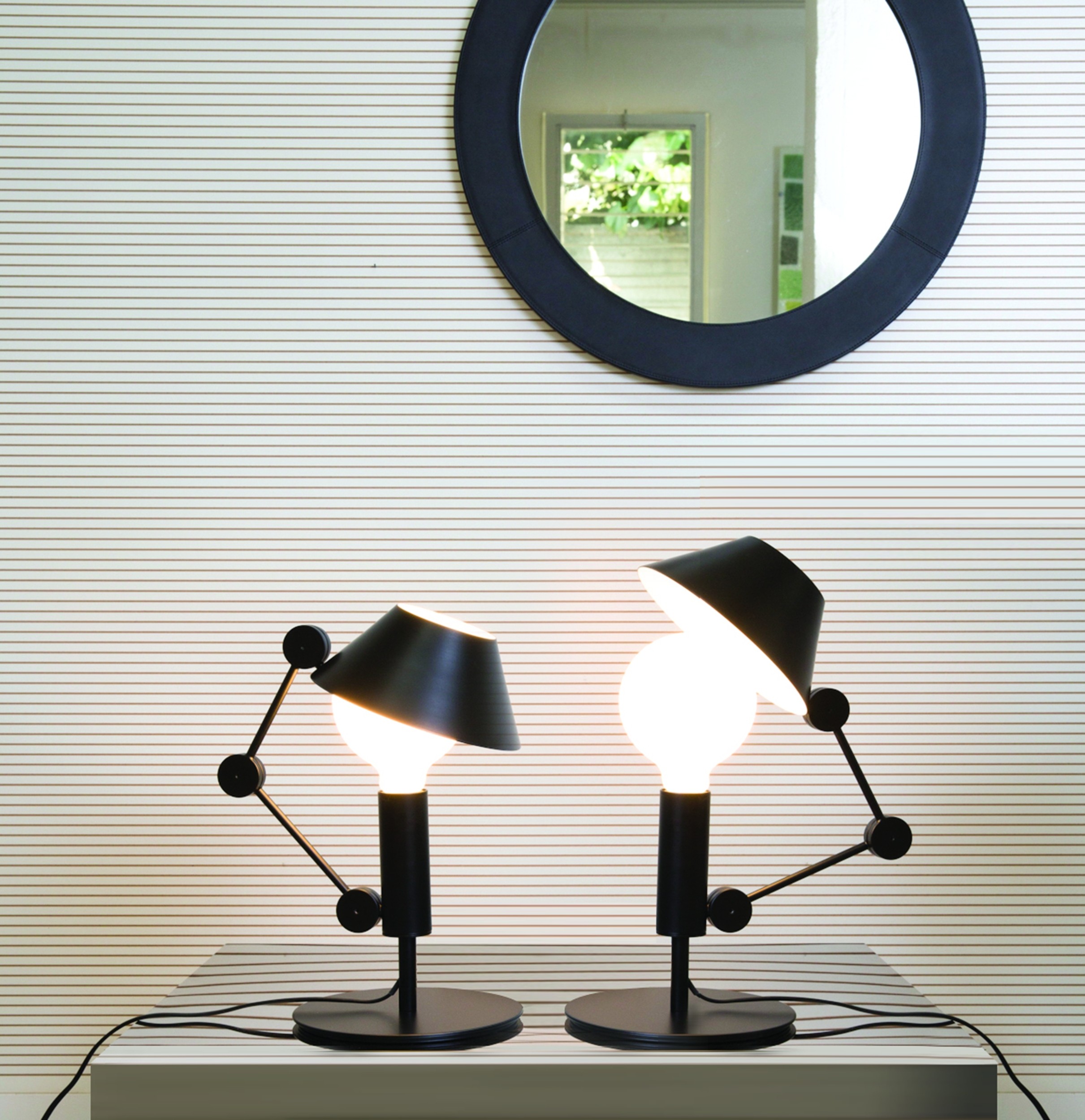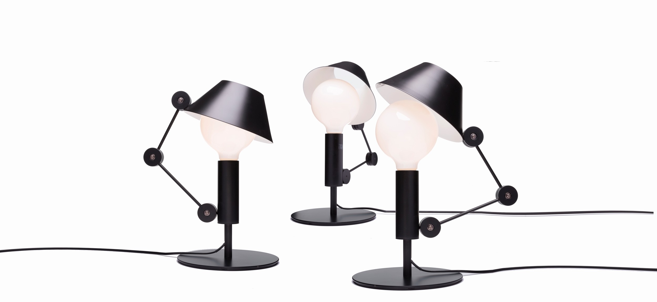 Настольная лампа и торшер серии Mr. light, с движущейся рукой и шляпой изготовлены в черном матовом цвете. Светильники имеют двухцветный диффузор, с белой матовой внутренней частью для широкого распространения света. Светоотдача в верхней части может быть уменьшена, благодаря покрытию лампы шляпой.