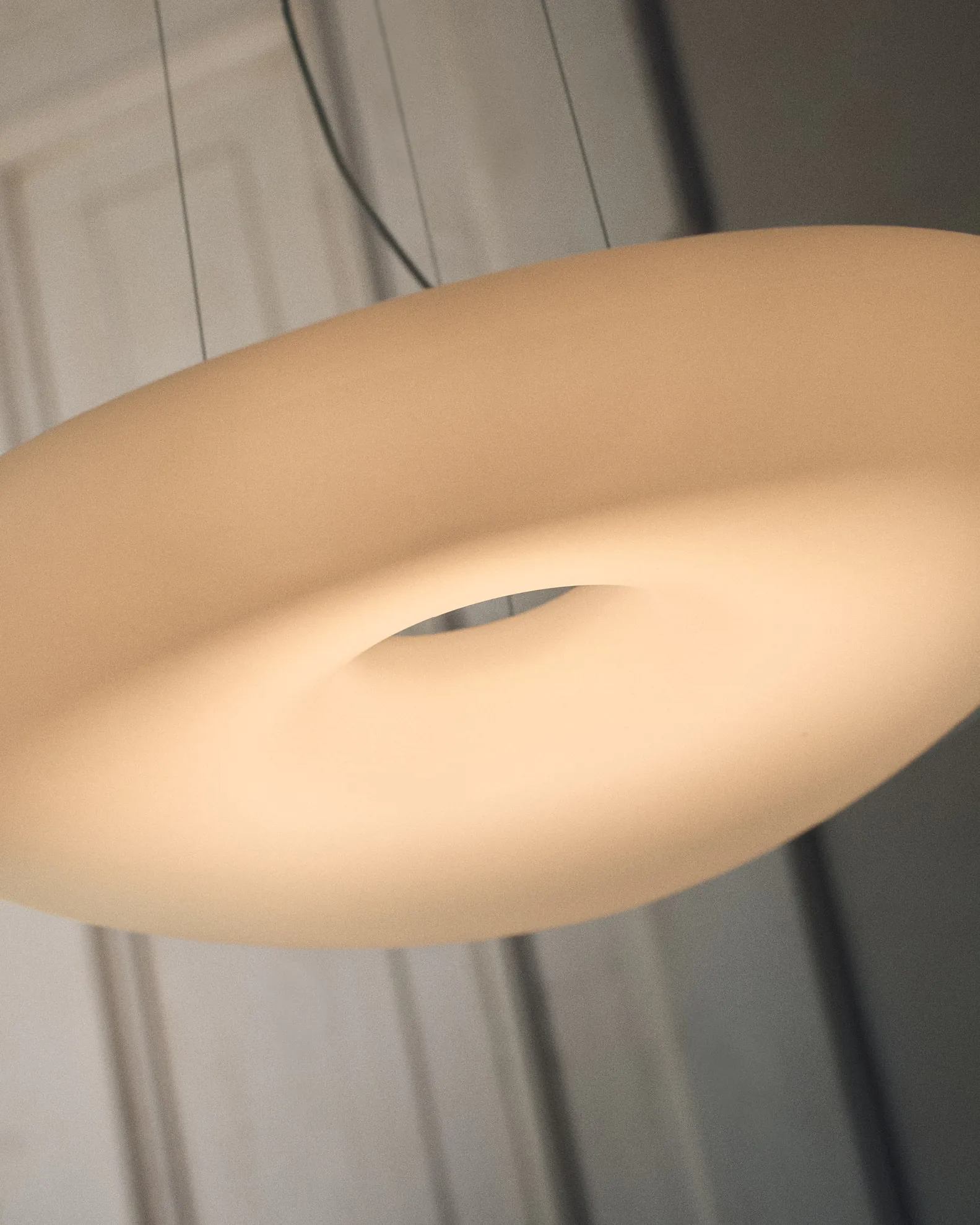 Конструкция продумана до мелочей. Белый полиэтиленовый рассеиватель не только равномерно распределяет свет, но и подчёркивает изящную форму светильника. Металлический плафон с белым покрытием добавляет элегантности, а стальные тросы надёжно удерживают конструкцию, оставаясь почти незаметными. Благодаря этому светильник выглядит невесомым и не перегружает пространство.