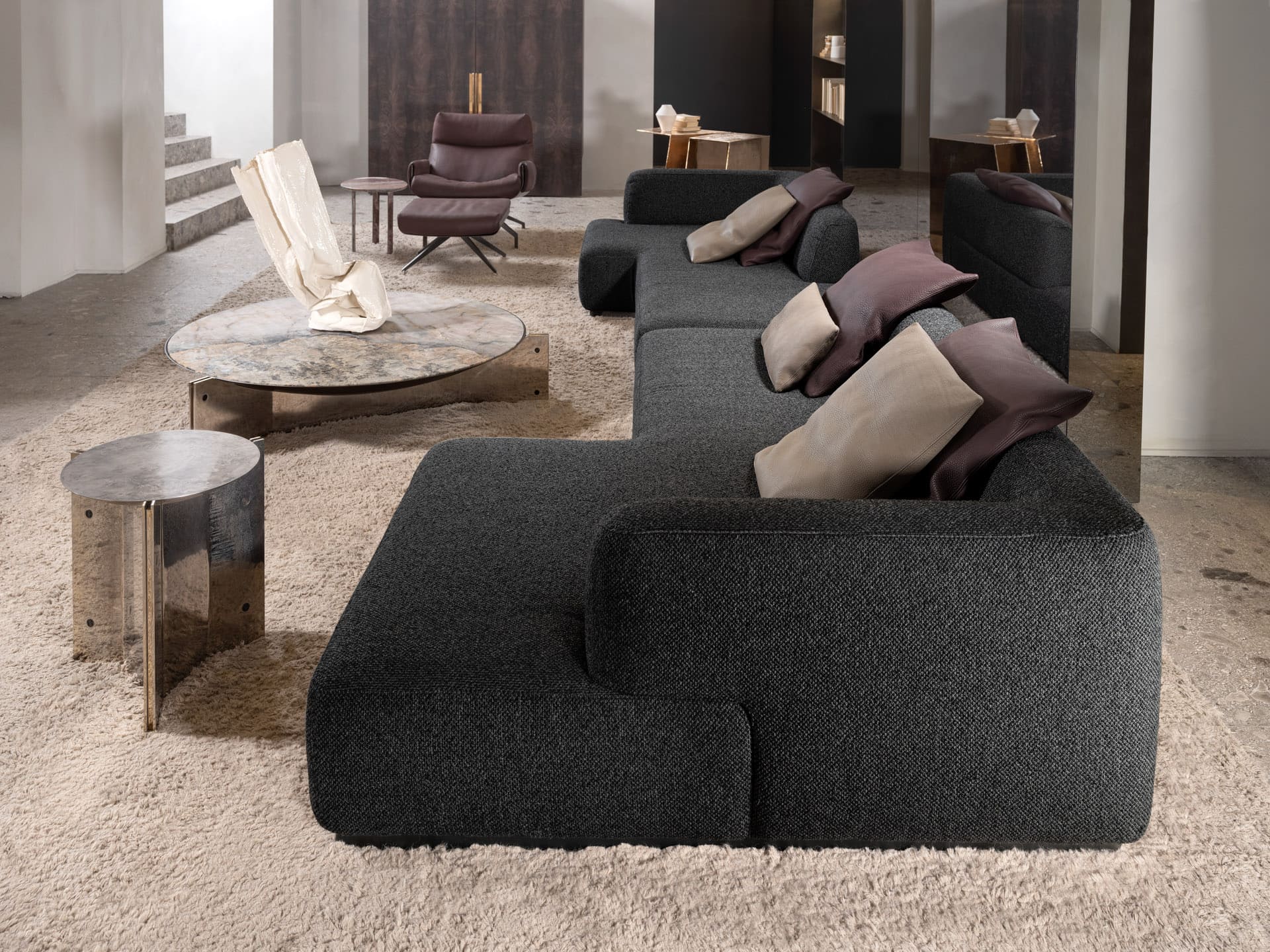 Чёрная полированная сталь центральной части столика придаёт ему современный вид. Этот материал также отличается высокой прочностью и долговечностью. Ножки столика доступны в двух цветах: «чёрная полированная сталь» и «светло-золотистый». Это добавляет больше возможностей для персонализации.