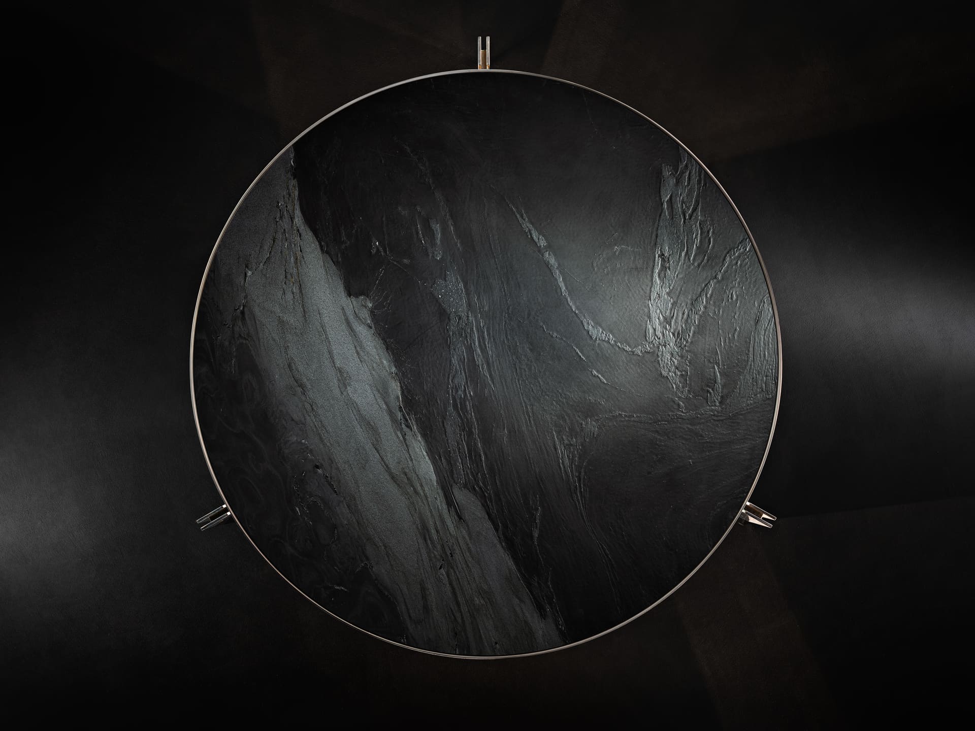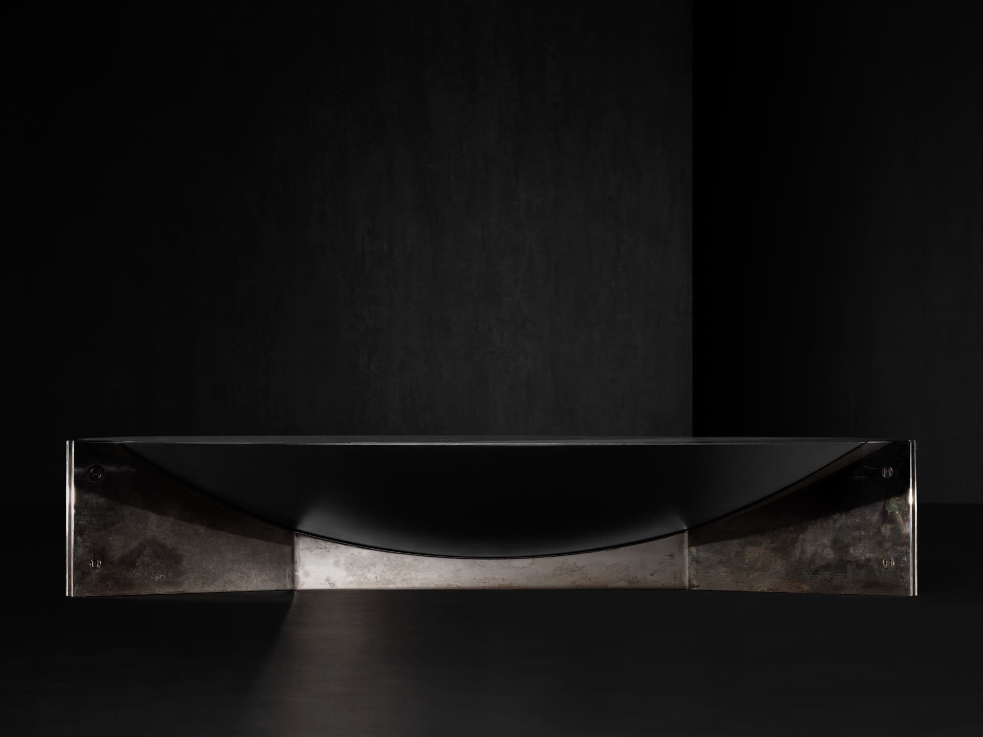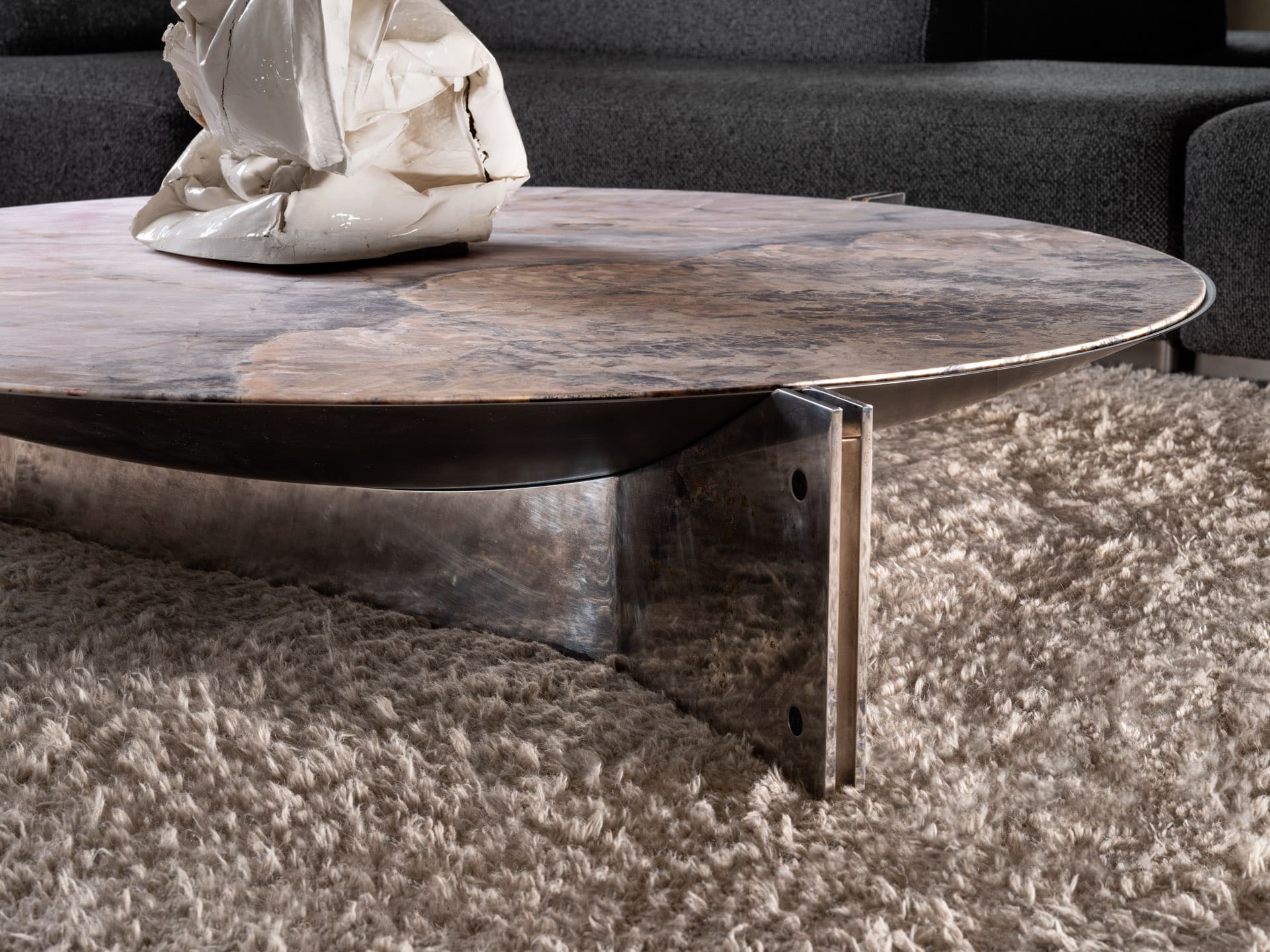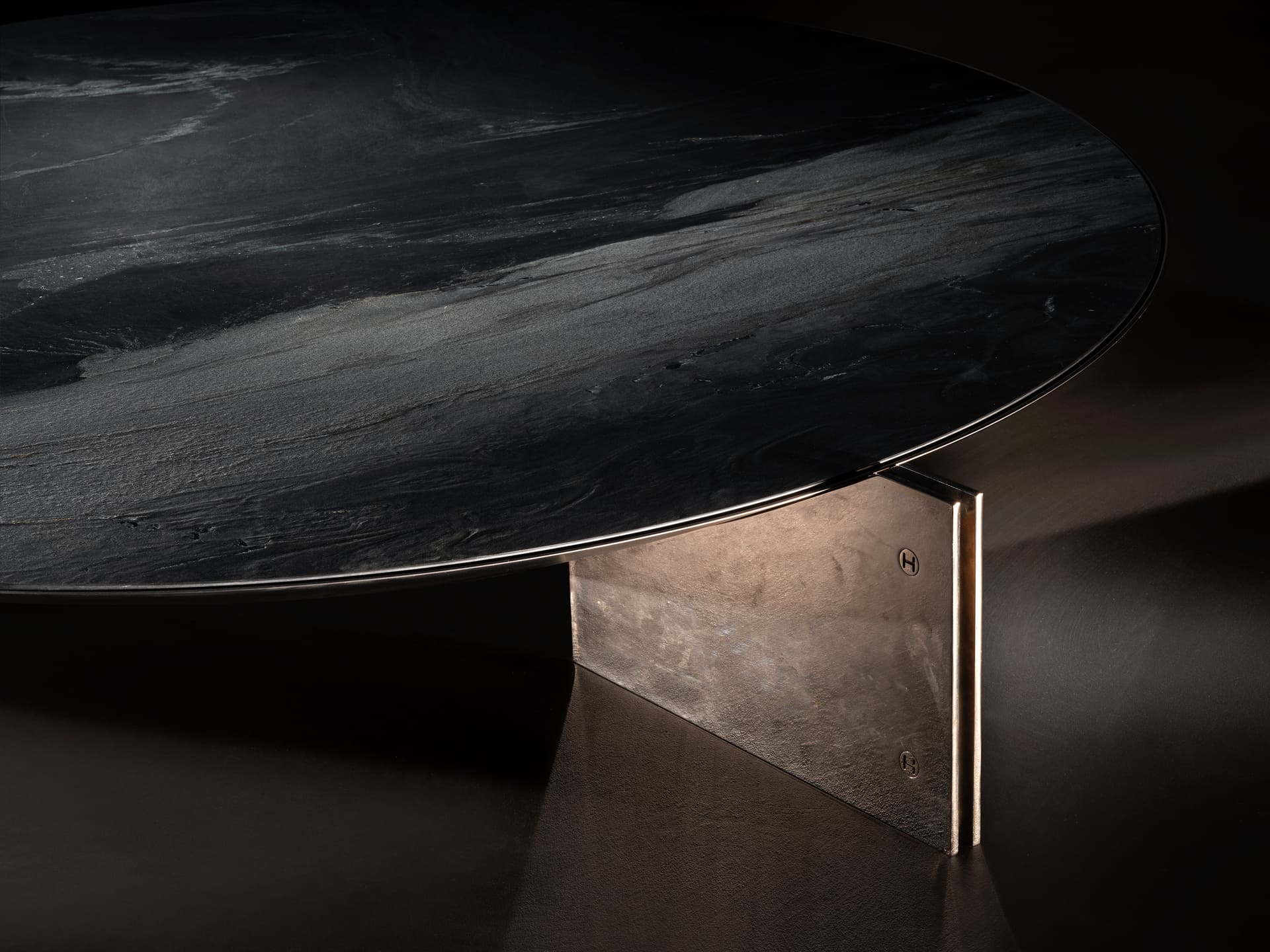 Центральная часть столика изготовленная из чёрной полированной стали толщиной 0,3 см, придаёт изделию элегантность и современный вид, а также добавляет нотку строгости и лаконичности. Ножки столика выполнены из гнутого металлического листа толщиной 0,8 см. Такое решение создаёт интересный диссонанс между двумя элементами, подчёркивая стремление бренда к уникальности и оригинальности.