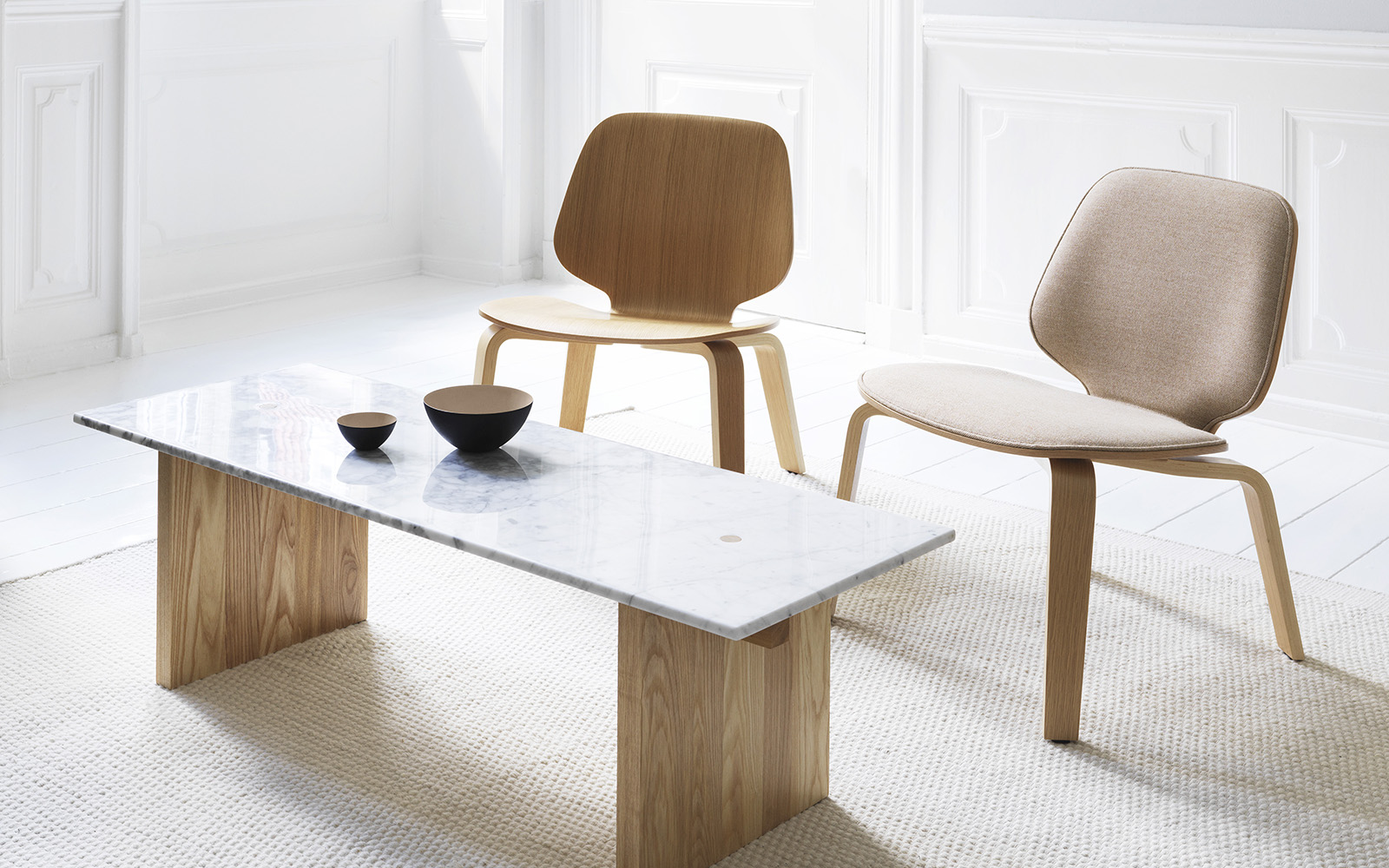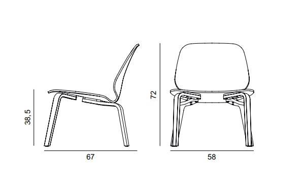 Стул My Chair Lounge состоит из оболочки, выполненной из формованного ореха, дуба или окрашенного шпона ясеня. Ножки изготовлены в тех же вариантах отделки — формованный орех, дуб или окрашенный ясень.