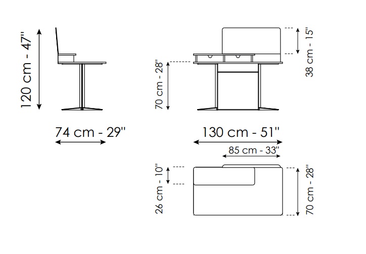 Столешница выполнена из натурального ореха Canaletto (Noce Canaletto) — материала, известного своей благородной текстурой и тёплым оттенком. Она опирается на металлическое основание, отличающееся строгостью форм и технологичным внешним видом, что создаёт интересный контраст между природной теплотой дерева и холодной графичностью металла.
