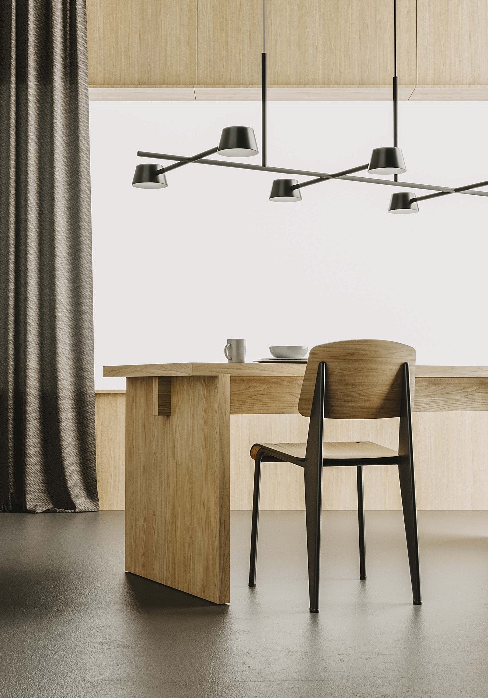 Светильник выполнен в матовом черном цвете, что придает ему изысканный и универсальный вид. Шесть световых голов также имеют матовое черное покрытие, создавая единый гармоничный образ.