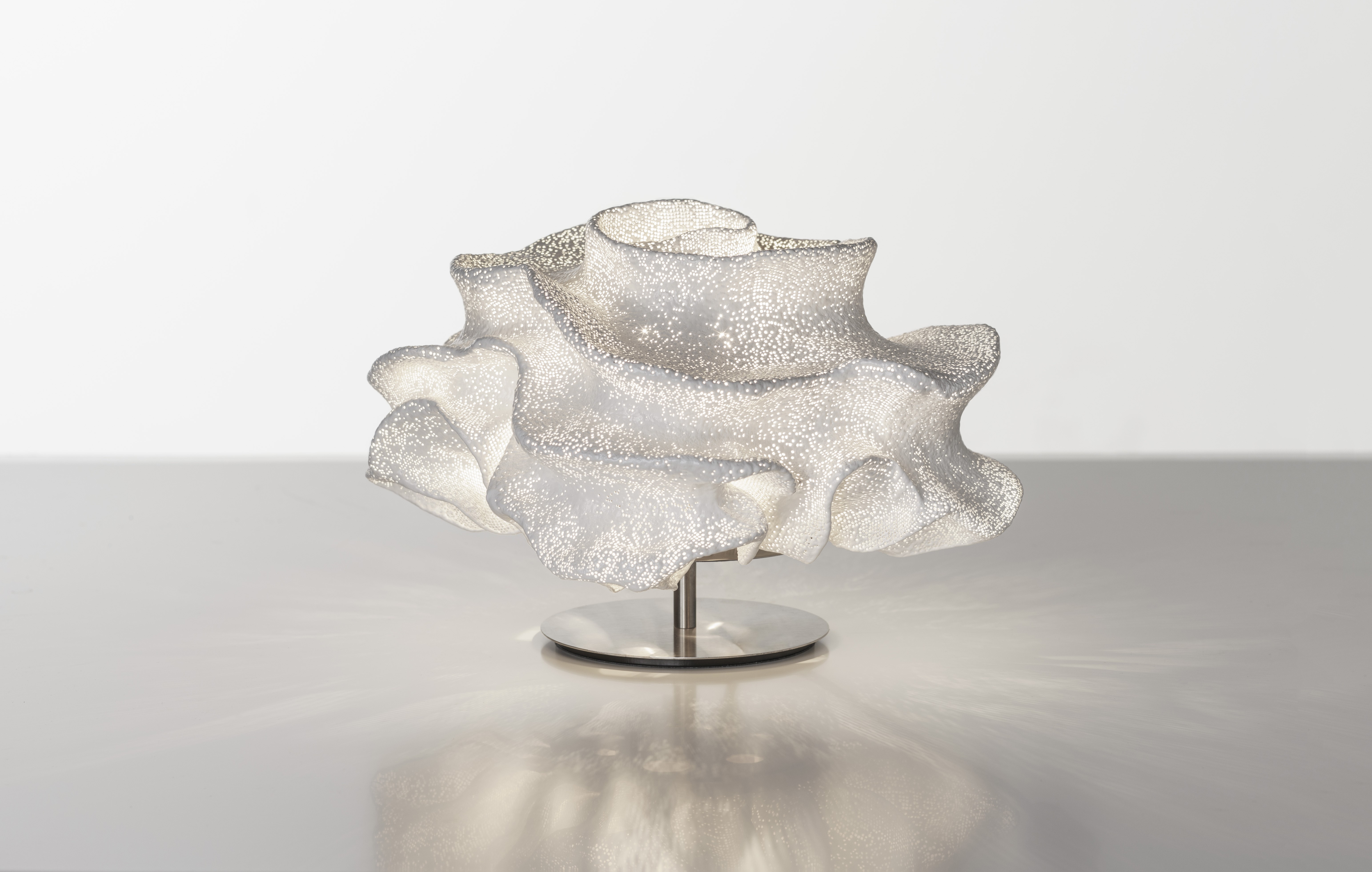 Каждый экземпляр светильника уникален: мастер придаёт материалу особые очертания, из‑за чего объёмные формы кажутся живыми, будто находящимися в постоянном движении. Складки сетки не просто формируют силуэт — они работают как особые «проводники» света. Проходя сквозь них, свет становится мягким и динамичным, создавая в пространстве причудливые светотеневые узоры.