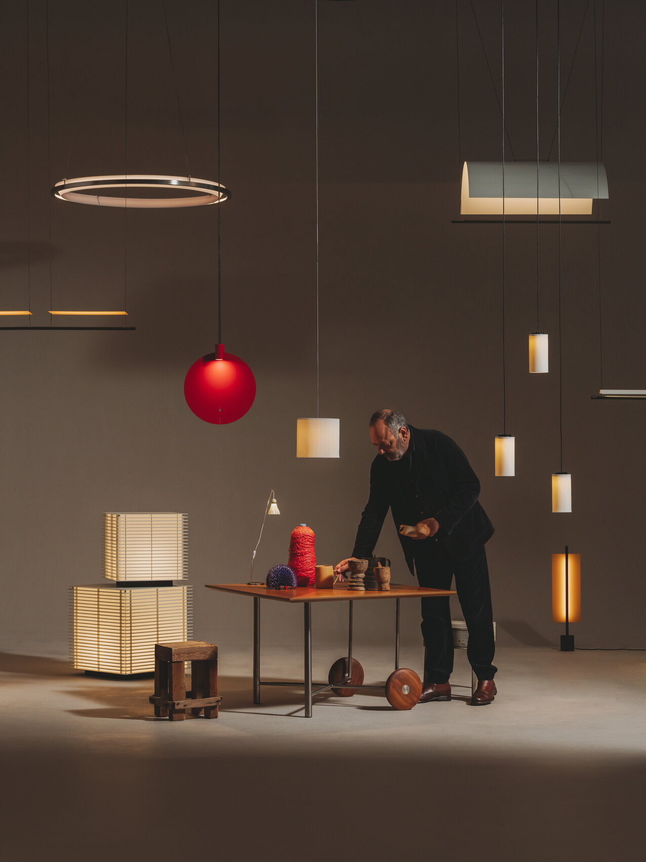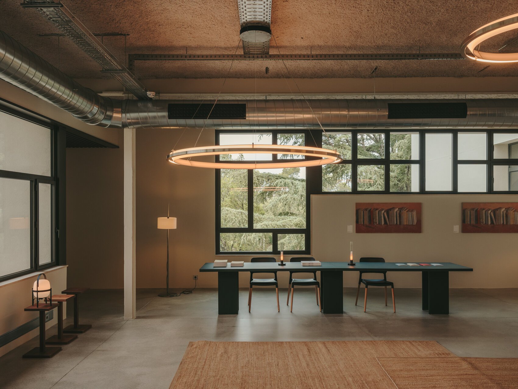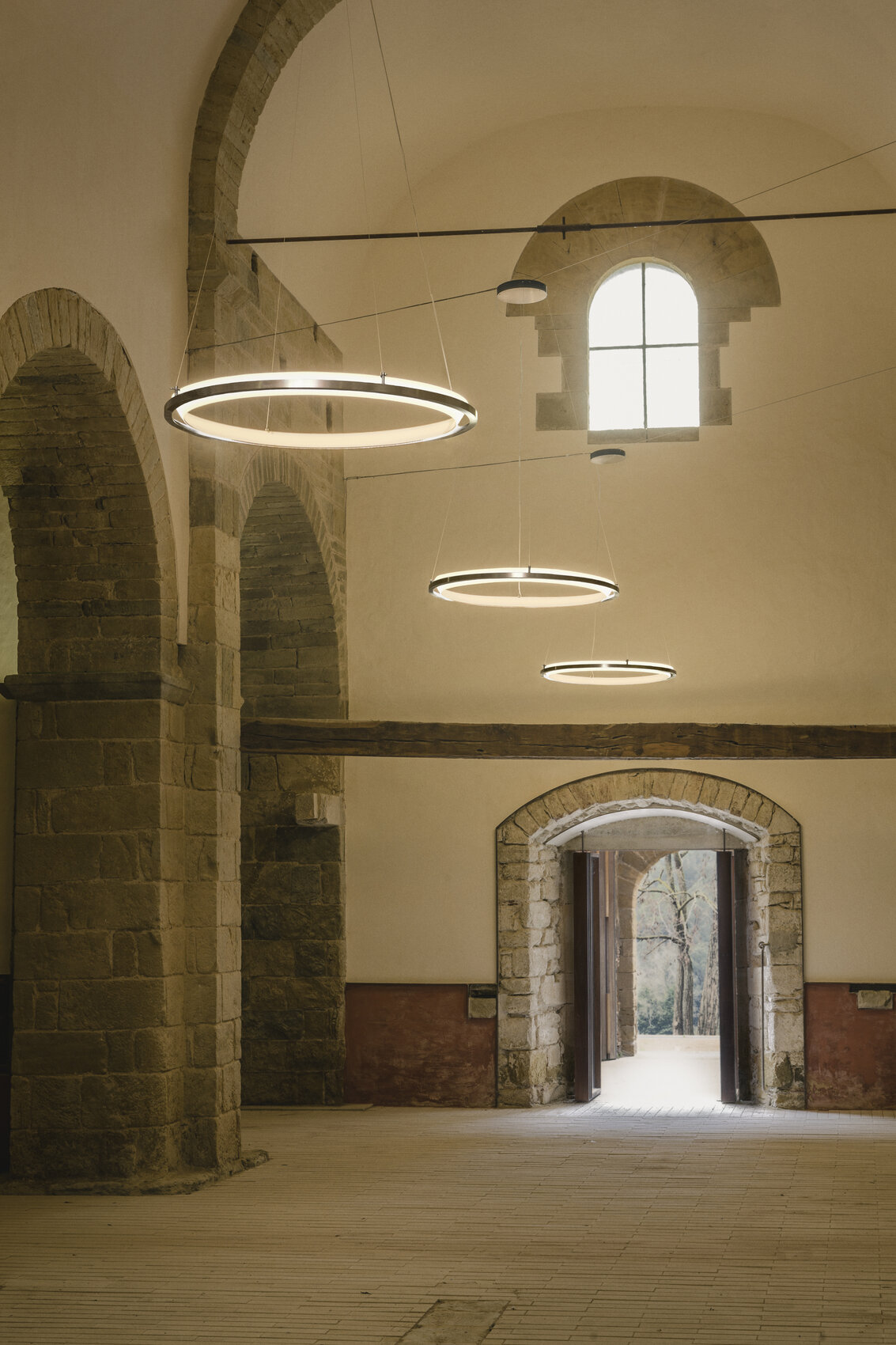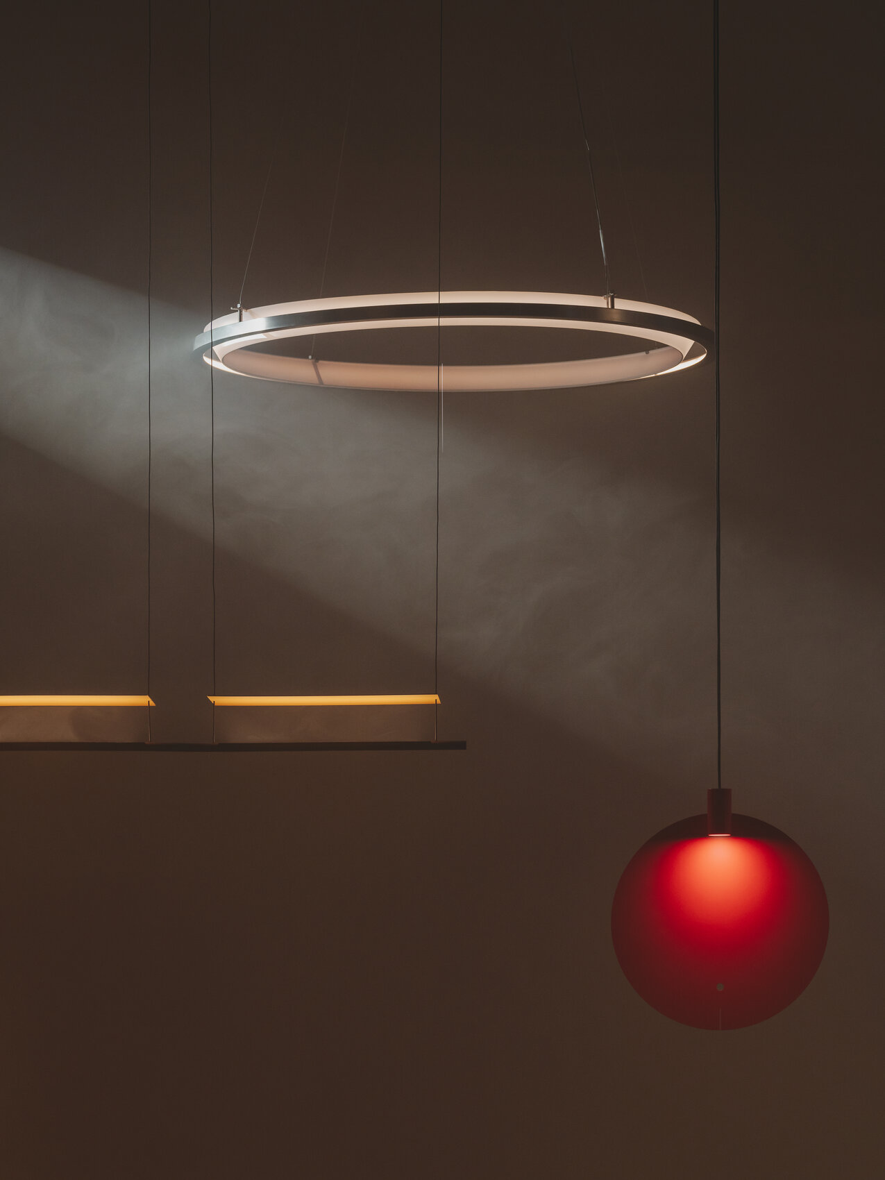 Композиционная геометрия светильника Nimba направляет свет в его пустой центр, откуда он равномерно распространяется во всех направлениях, создавая мягкое и приятное освещение.