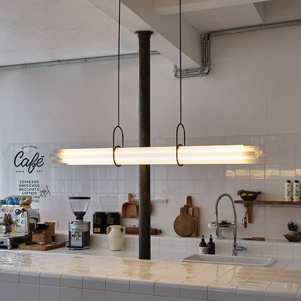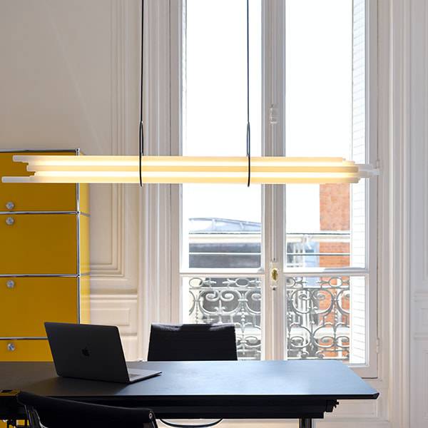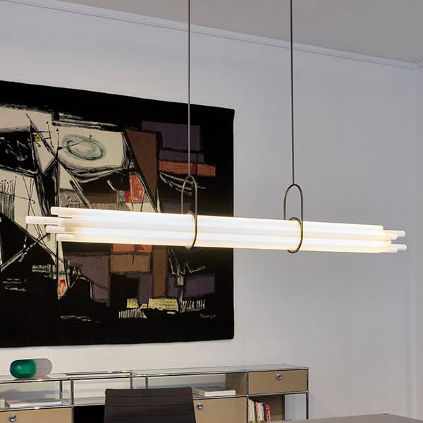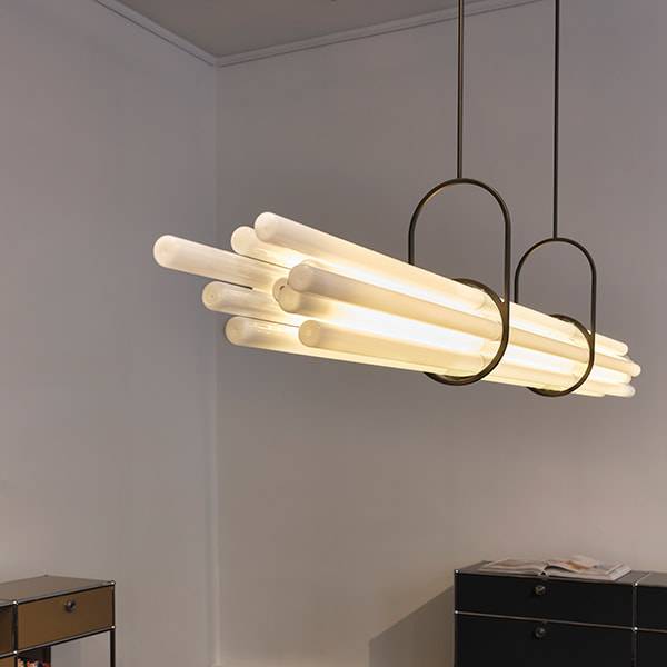 Себастьян Сумма проявил своё эстетическое мастерство, подвесив светильник к потолку с помощью пары кронштейнов, напоминающих гимнастические зажимы. Эти кронштейны уравновешивают связку труб, придавая светильнику особый шарм и стиль.