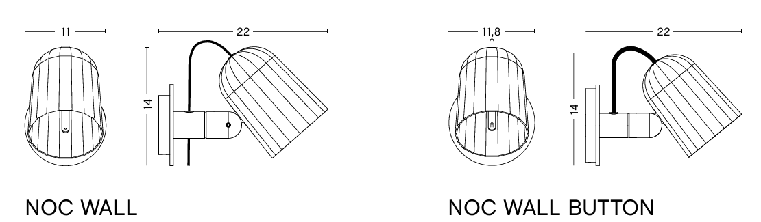 Основной светильник крепится к настенному кронштейну. У модели Noc кабель свободно свисает, что позволяет подключить светильник к розетке в удобном месте. В комплект входит двухметровый кабель с встроенным выключателем, что делает использование светильника ещё более удобным.