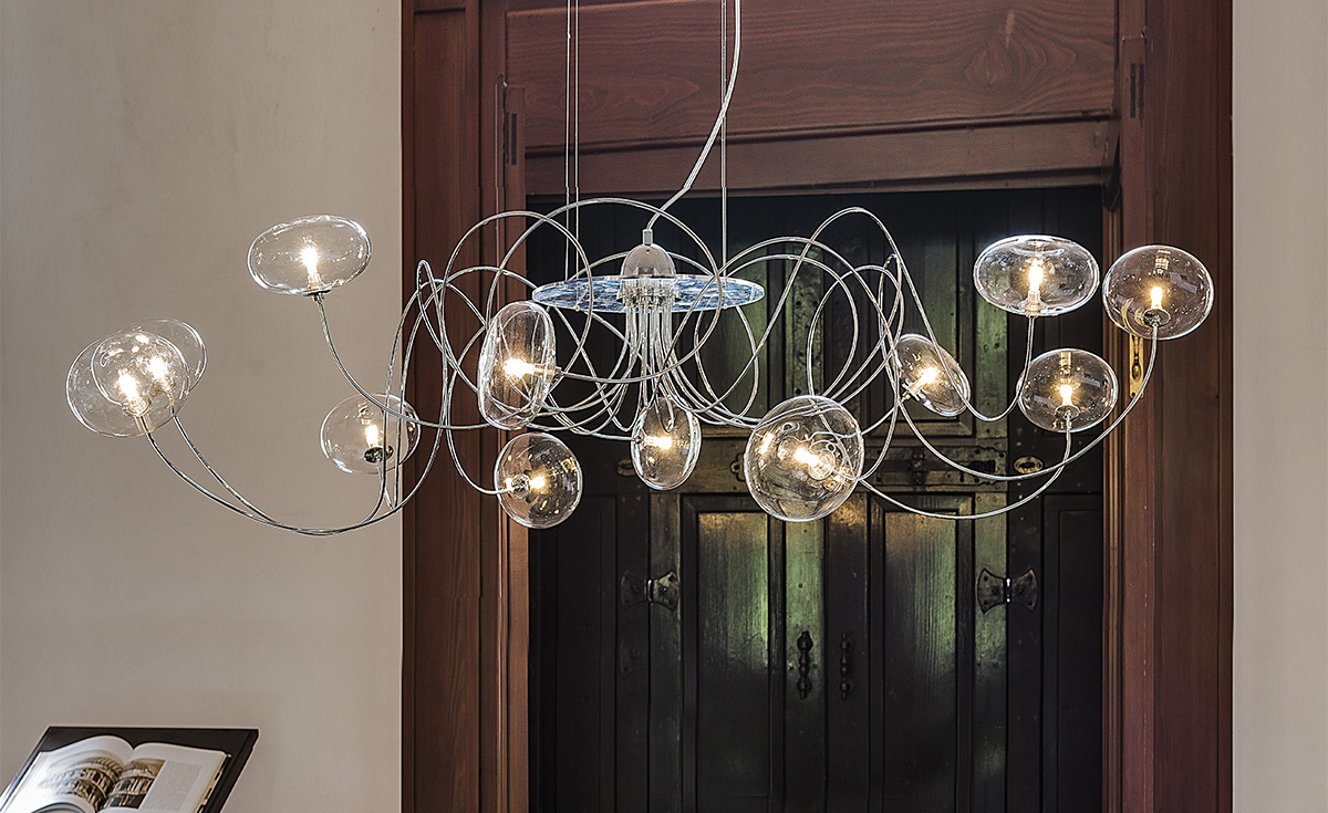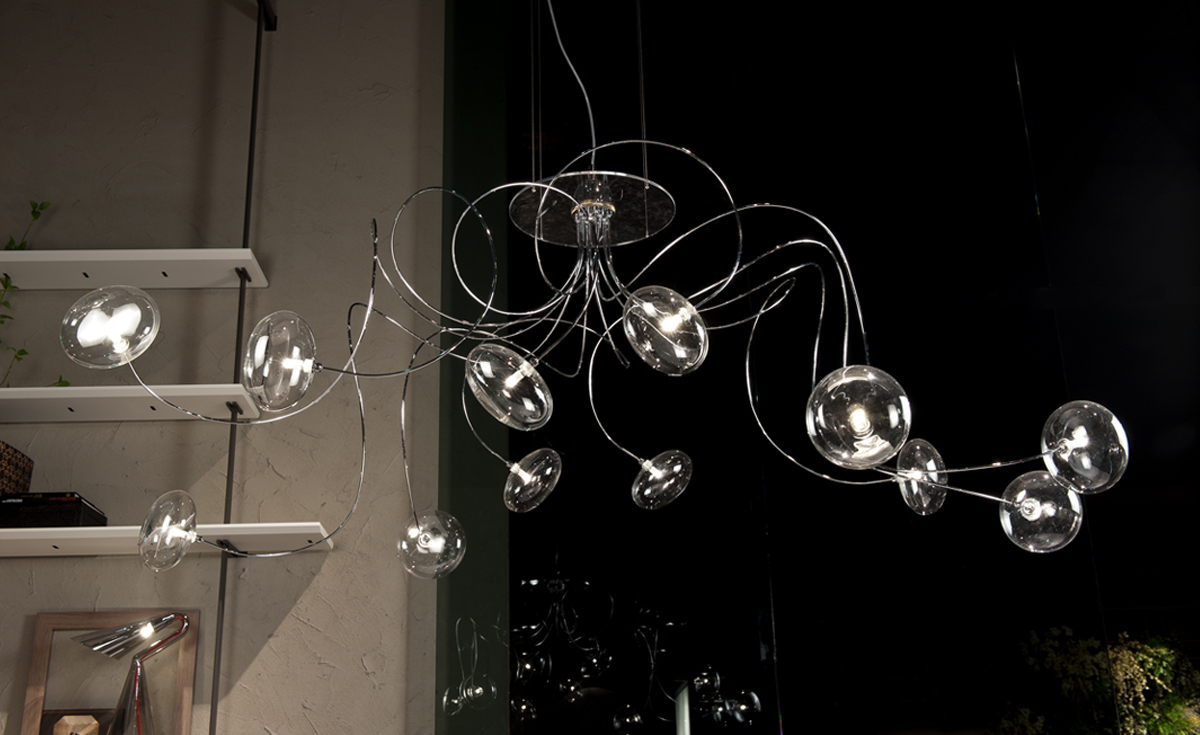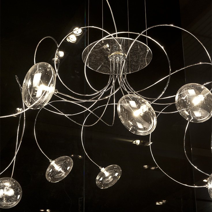 Люстра Oktopus представляет собой динамичную композицию из хрустальных плафонов, закреплённых на изогнутых металлических «щупальцах». Каждый элемент тщательно сконструирован для создания трёхмерного визуального эффекта, напоминающего застывший в движении морской организм. Плавные линии металлических штанг и игра света на гранях хрусталя формируют сложную световую хореографию, равномерно заполняя пространство мягким мерцающим освещением. Модель сочетает в себе скульптурную выразительность и функциональность, становятся акцентным элементом интерьера, обогащая его оригинальным и вневременным дизайном. Люстра особенно эффектна в помещениях с высокими потолками, где раскрывается её сложная пространственная структура.