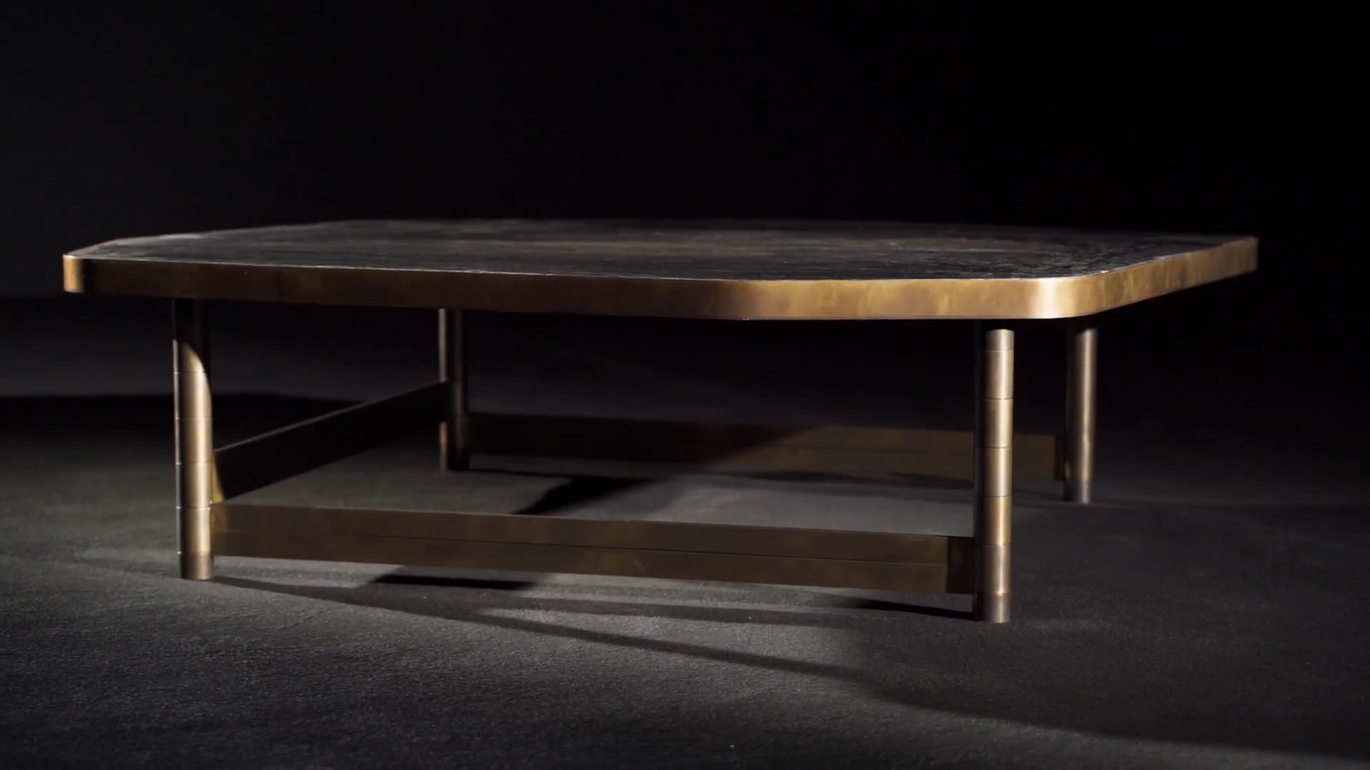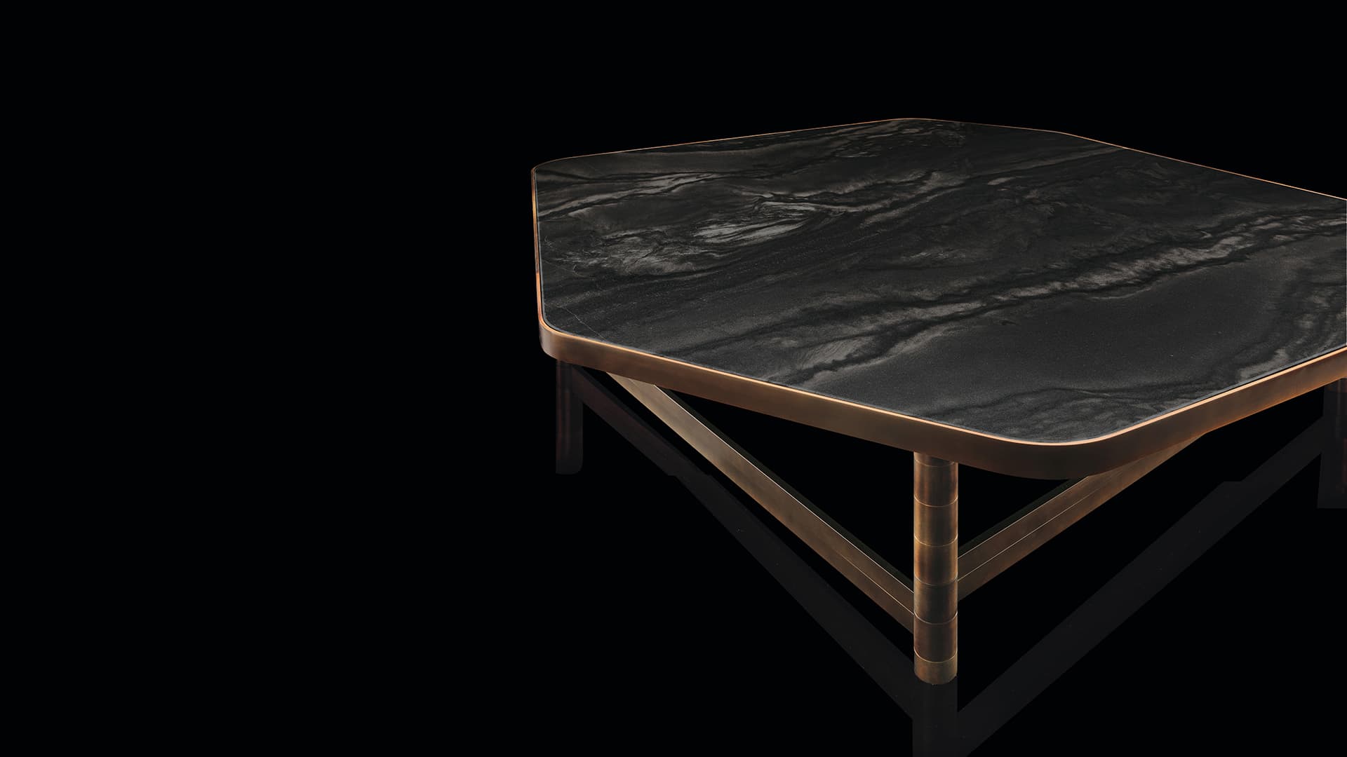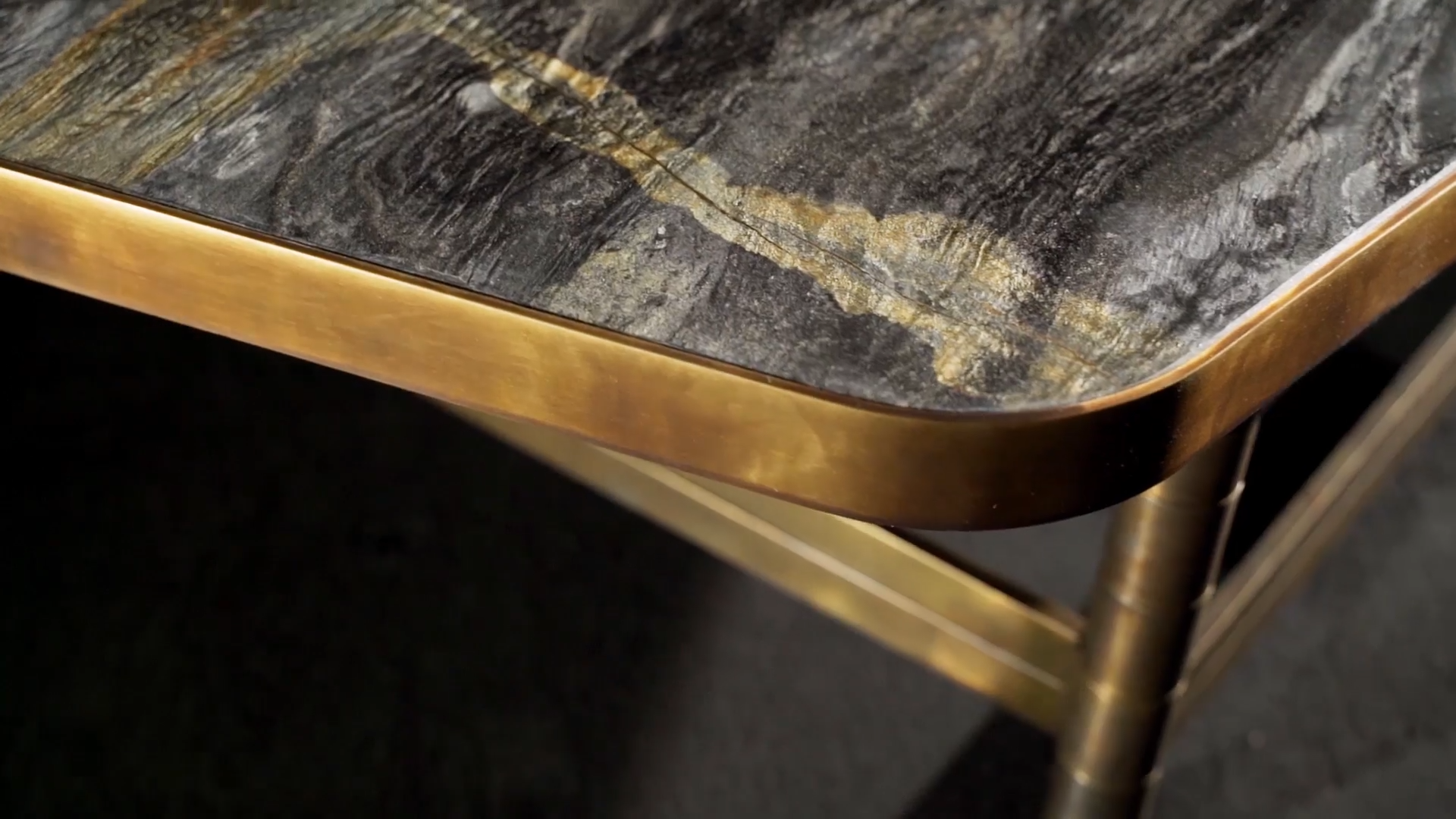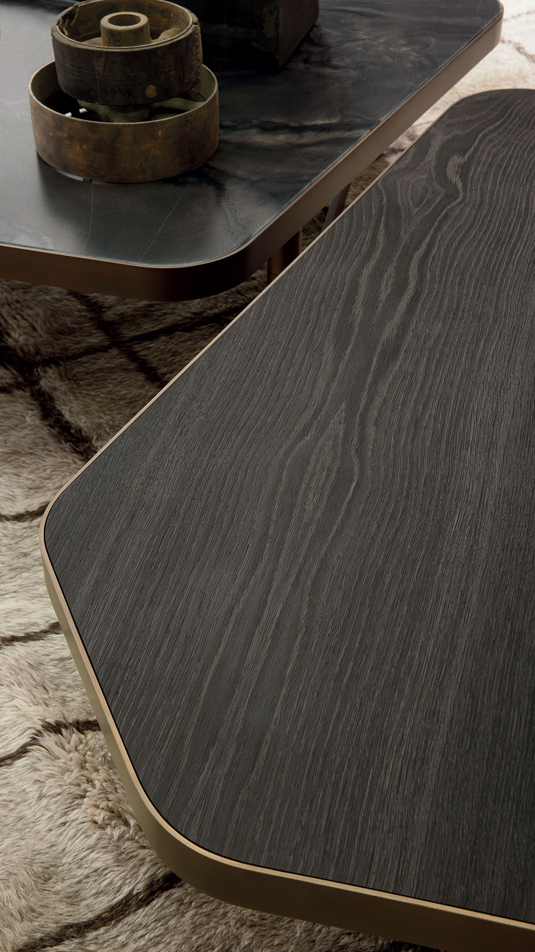 Ножки столиков изготовленные из круглых металлических труб диаметром 4 сантиметра, соединены между собой системой прямоугольных металлических стержней. Это придаёт конструкции прочность и изящество. Для изготовления ножек используется высококачественная сталь. Она доступна в двух вариантах отделки: чёрной полированной или покрытой полированной латунью. Такой выбор позволяет подобрать столик, идеально вписывающийся в общий стиль интерьера и становящийся его выразительной деталью.