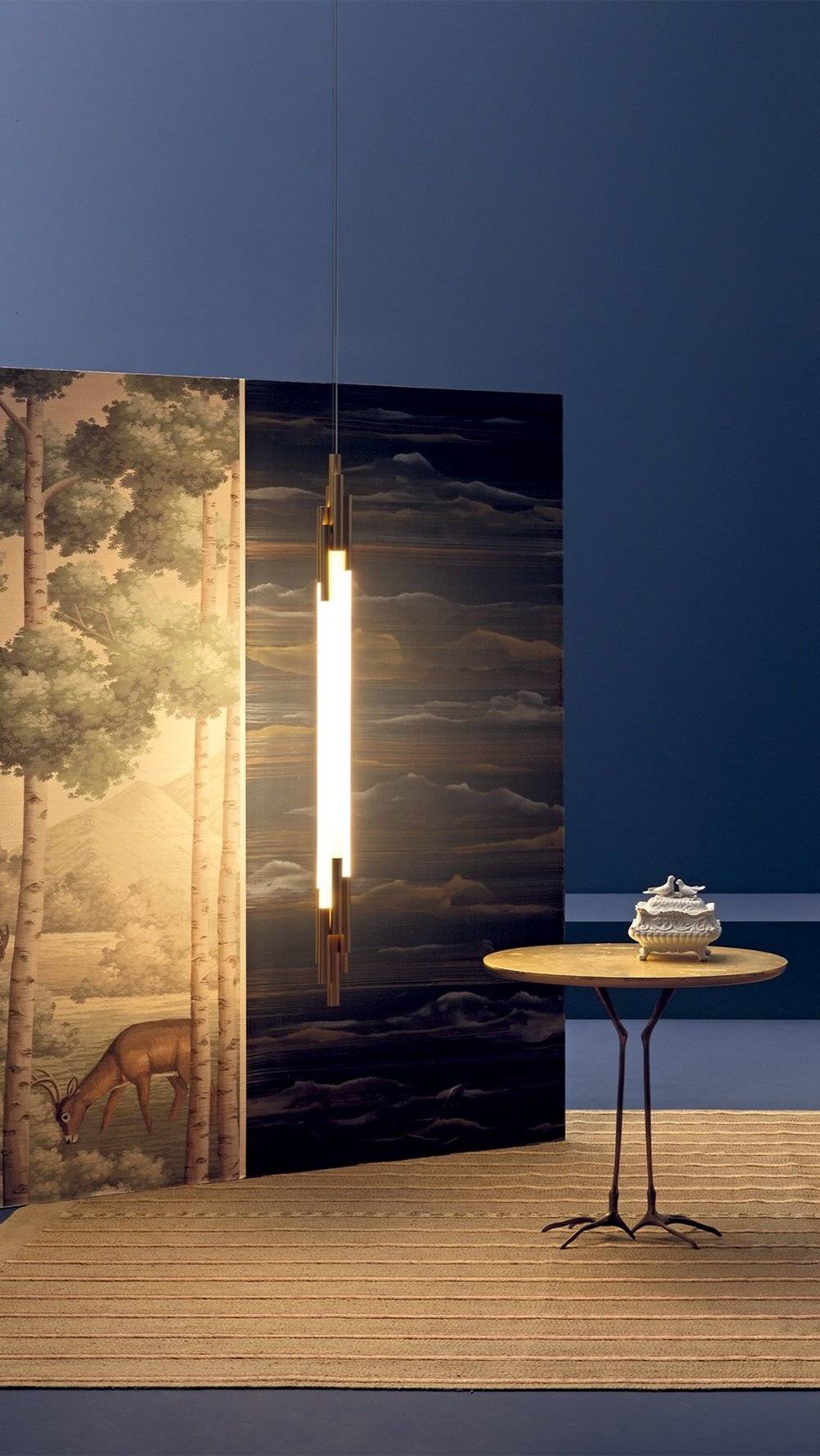Конструкция светильника включает в себя трубки из опалового стекла диаметром 2,5 см. Они гармонично сочетаются с элементами из анодированного алюминия и акрила. Такая комбинация материалов придаёт светильнику лёгкость и изящество.