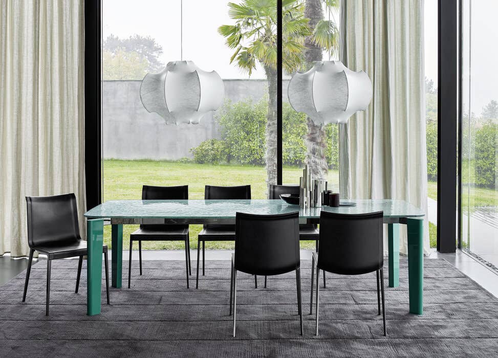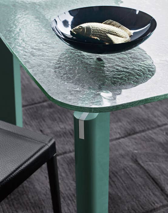 Особое внимание заслуживает версия стола со столешницей из витражного стекла. Её неровная, изысканная поверхность и светло-зелёный оттенок создают атмосферу свежести и природной гармонии. Витражное стекло пропускает мягкий, рассеянный свет, наполняя помещение теплом и уютом. Глянцевые лакированные ножки изумрудно-зелёного цвета идеально дополняют эту композицию, создавая эффектный контраст и подчёркивая природную красоту стола.