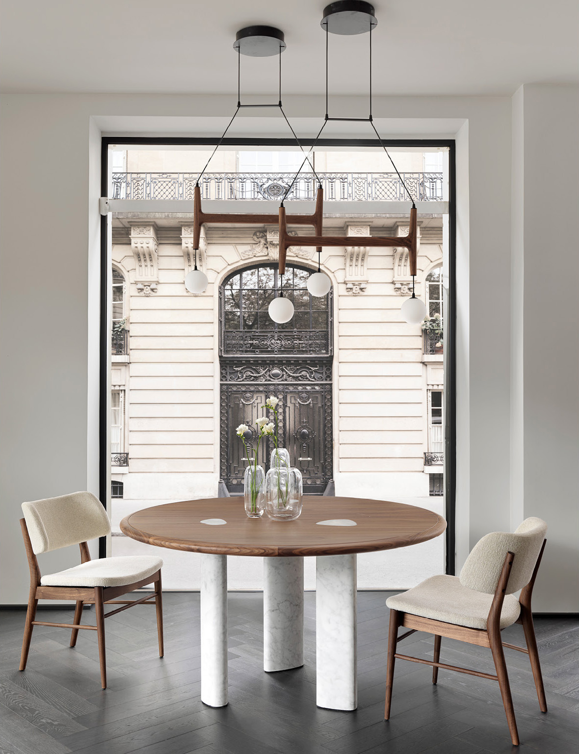 Мраморные ножки Osmose выполняют функциональную роль опоры. Их изящный и элегантный вид гармонично сочетается с формой и размером стола. Это создаёт ощущение естественности и баланса. Мрамор также используется в виде вставок на столешнице, перекликающихся с ножками по форме и расположению. Этот приём усиливает ощущение целостности и единства композиции. Он подчёркивает уникальность стола и его дизайнерское решение.