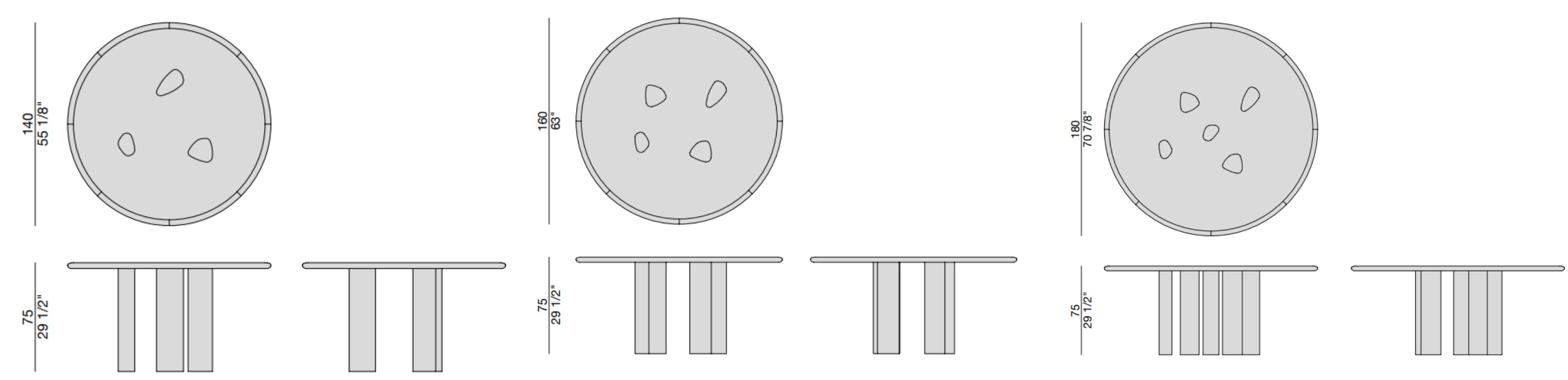 Стол Osmose tondo доступен в нескольких размерах: Ø 140 см с 3 ножками, Ø 160 см с 4 ножками и Ø 180 см с 5 ножками. Эти варианты позволяют подобрать идеальный стол для любого интерьера, будь то уютная домашняя кухня или просторное помещение ресторана.