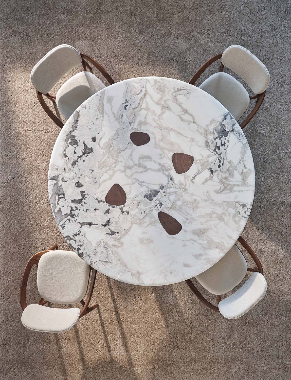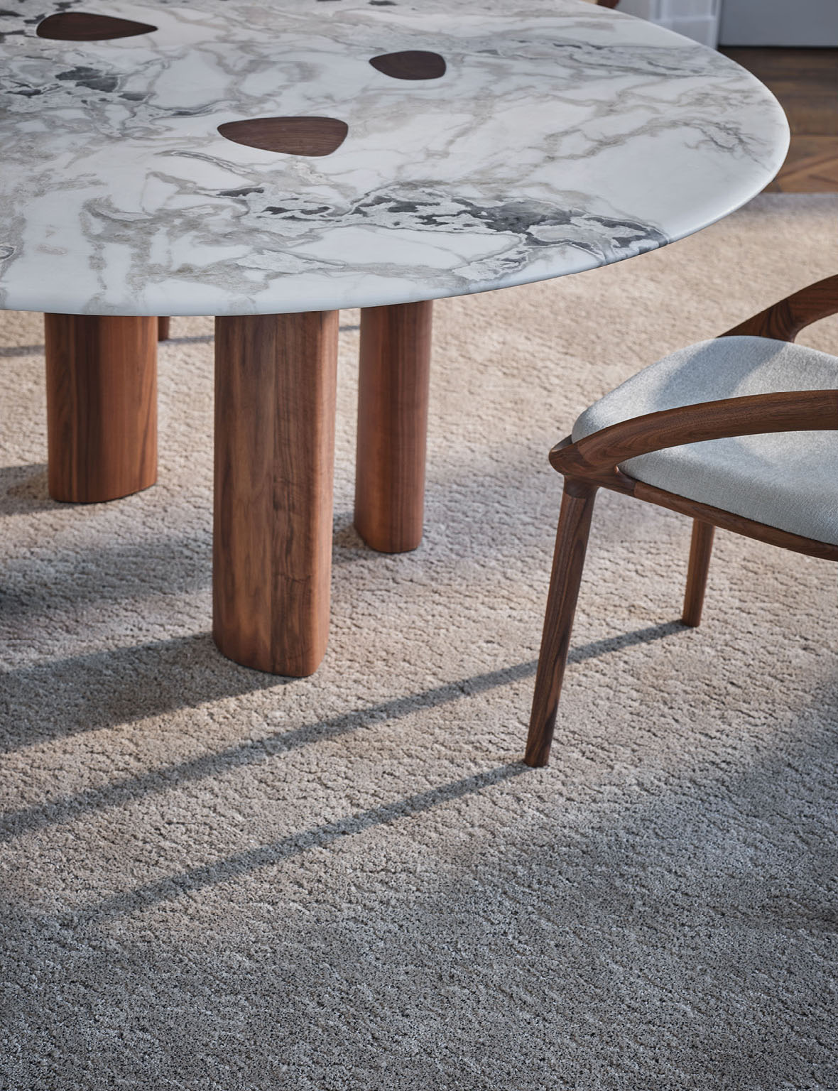 Oswood Tondo – это элегантный круглый обеденный стол, воплощающий гармонию природных материалов и изысканного дизайна. Он продолжает философию коллекции Osmose, переосмысливая взаимодействие дерева и камня, но в новом ключе: массив ореха каналетто и благородный мрамор меняются ролями, создавая визуальный и тактильный контраст.
