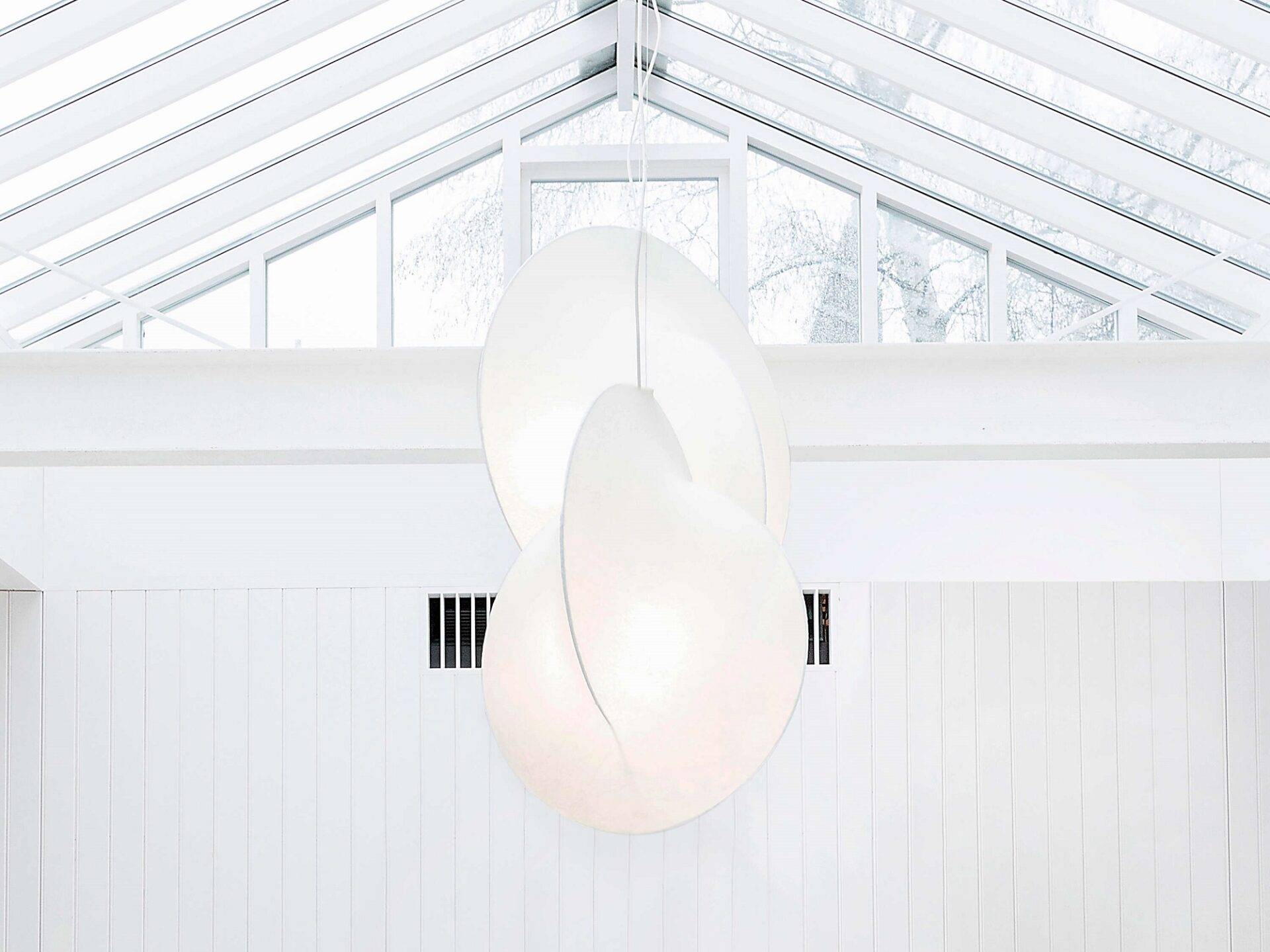 Конструкция основана на внутреннем каркасе из белой стали с порошковым покрытием, обеспечивающем прочность и лёгкость. На этот каркас наносится уникальный материал Cocoon — полупрозрачная полимерная смола, распыляемая вручную. После формирования плафона его поверхность покрывается прозрачным защитным слоем, что придаёт завершённость и долговечность. Форма пересекающихся колец визуально раскрывает пространство, добавляя глубину и ритм интерьеру.