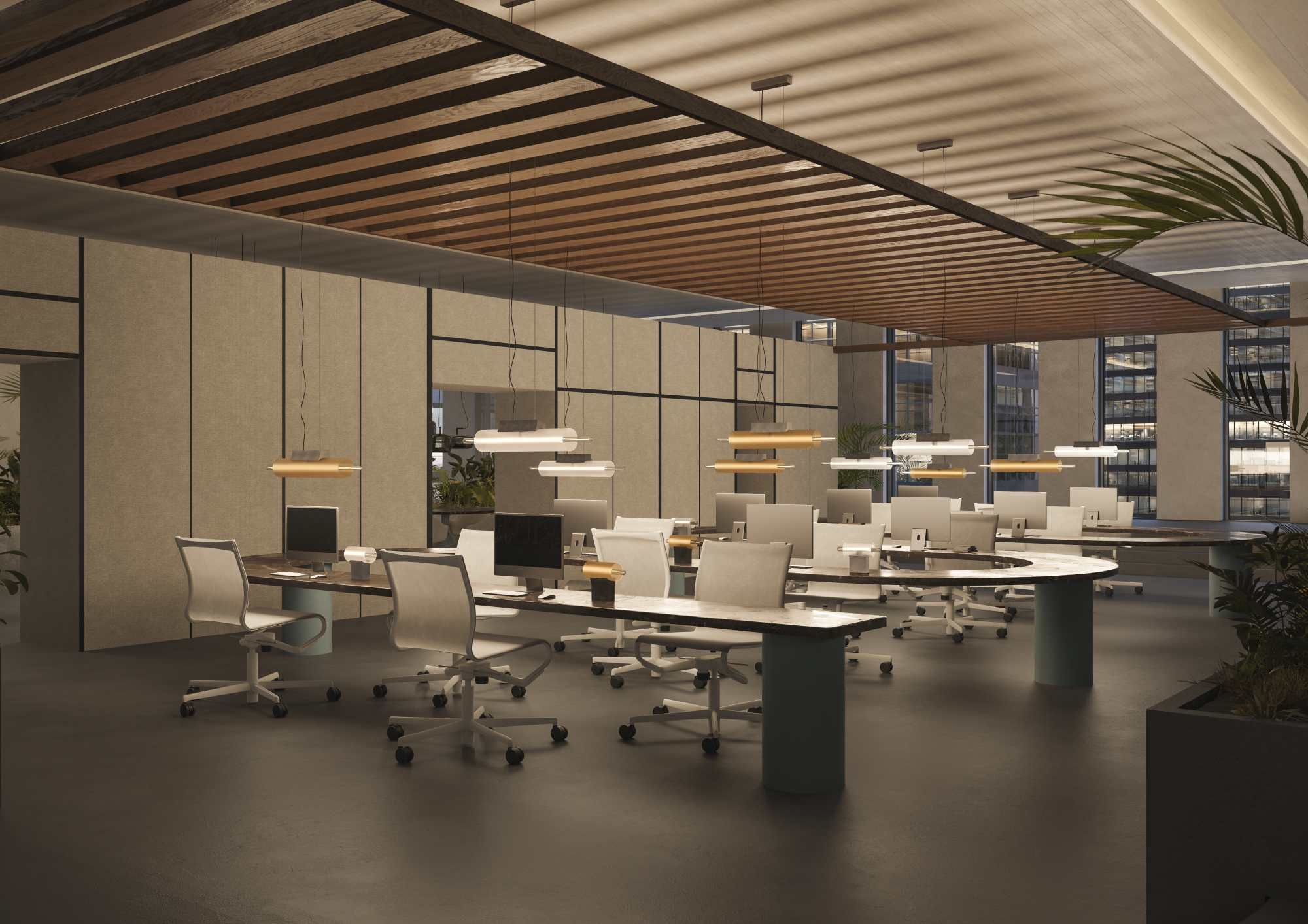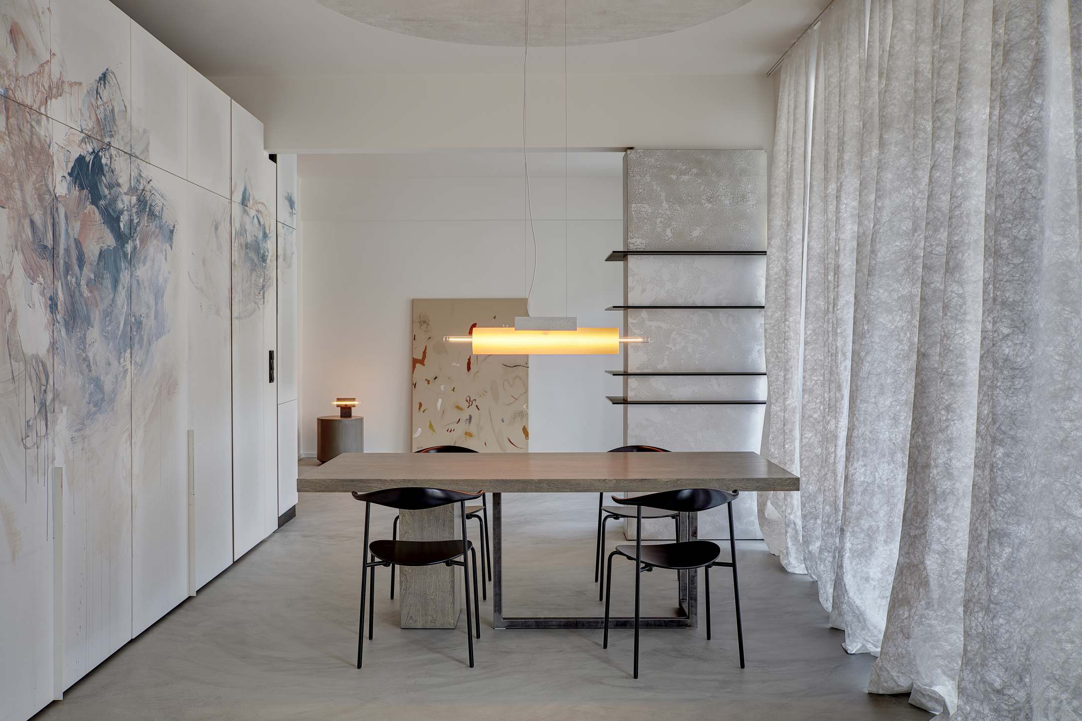 Выбрать можно и цвет: стекло бывает прозрачным, дымчато‑серым, янтарным или оливково‑зелёным. Бетонное основание может быть белым, натуральным или антрацитовым. Благодаря такому выбору светильник подойдёт для разных интерьеров.