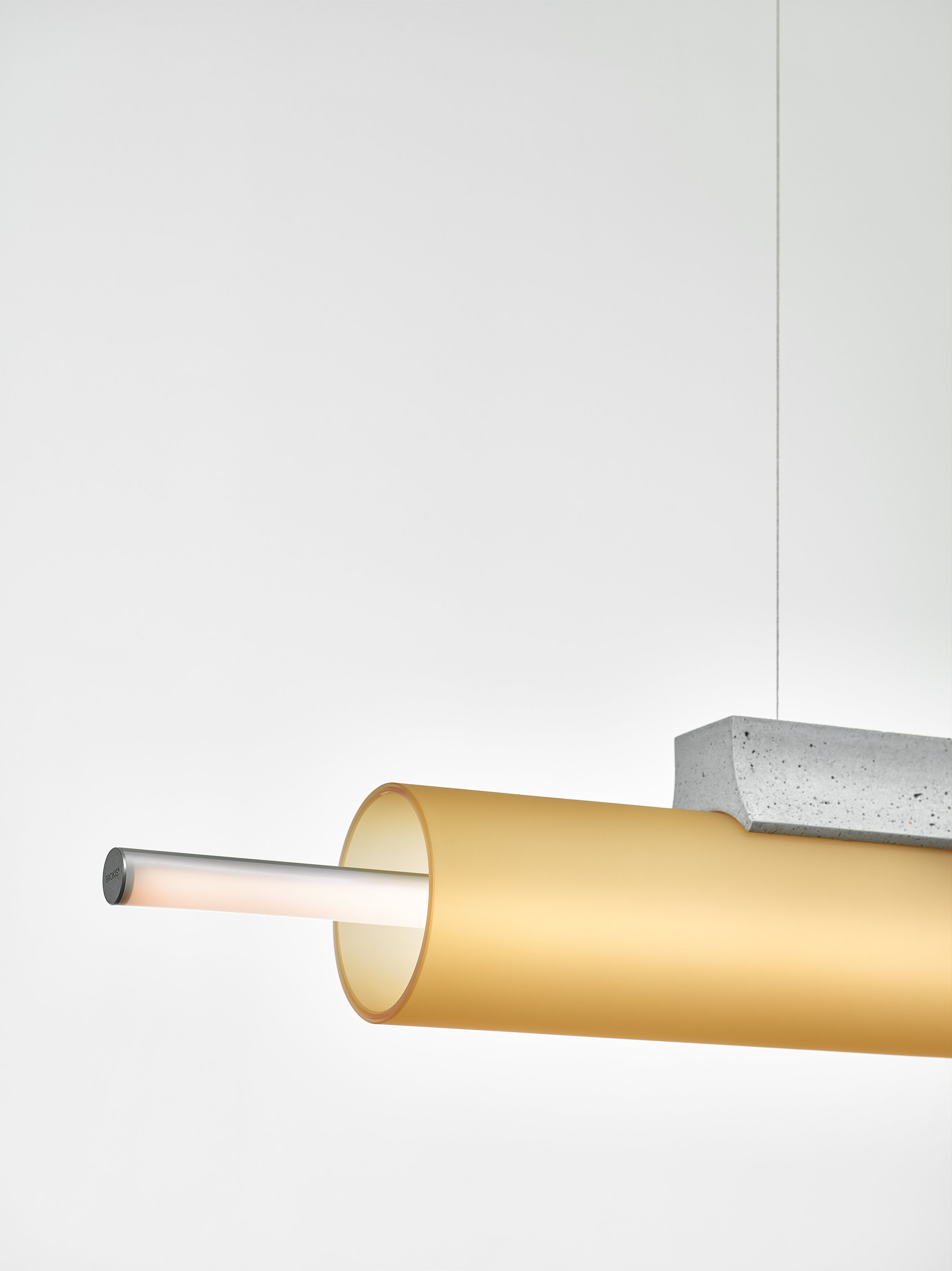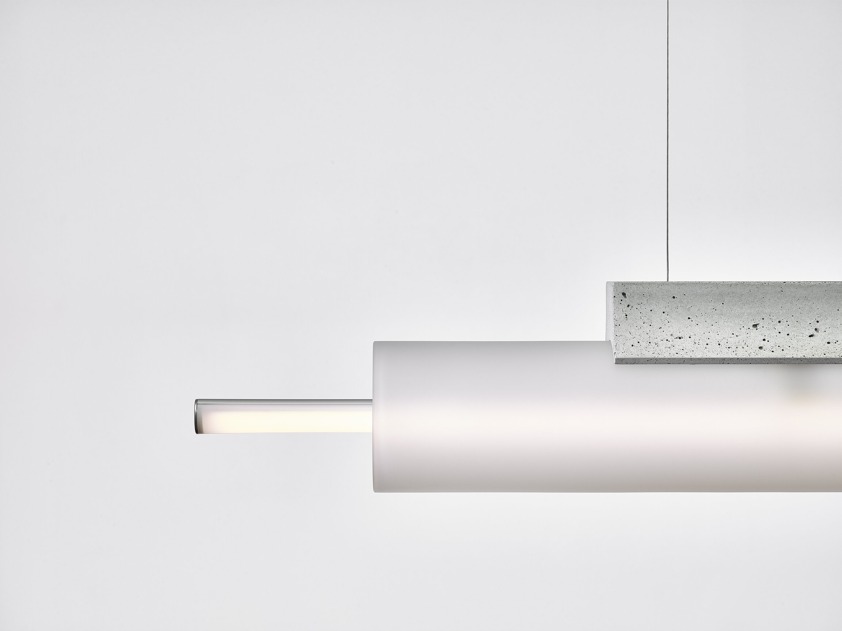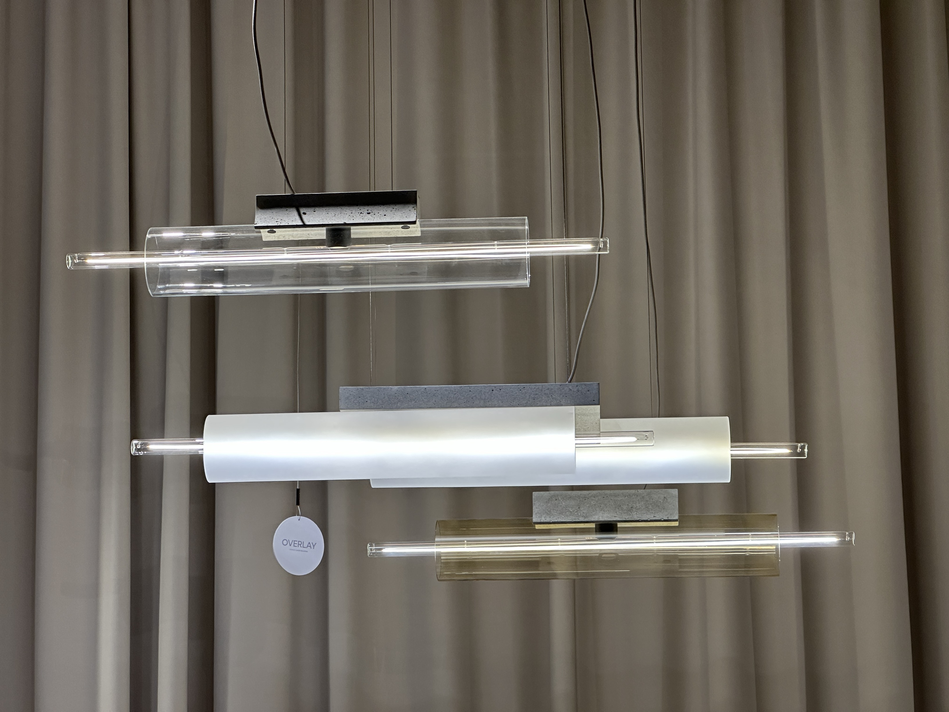 Внутри светильника Overlay pendant находится матовая трубка, которая словно висит в воздухе. Она помещена в корпус из стекла — прозрачного или матового. Всё это крепится к бетонному основанию. Есть два варианта светильника — с одной лампой и с двумя.